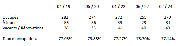 Bref, les locaux à louer et vacants ont fondu de plus de moitié. Cela donne un taux d’occupation de 88.89%.