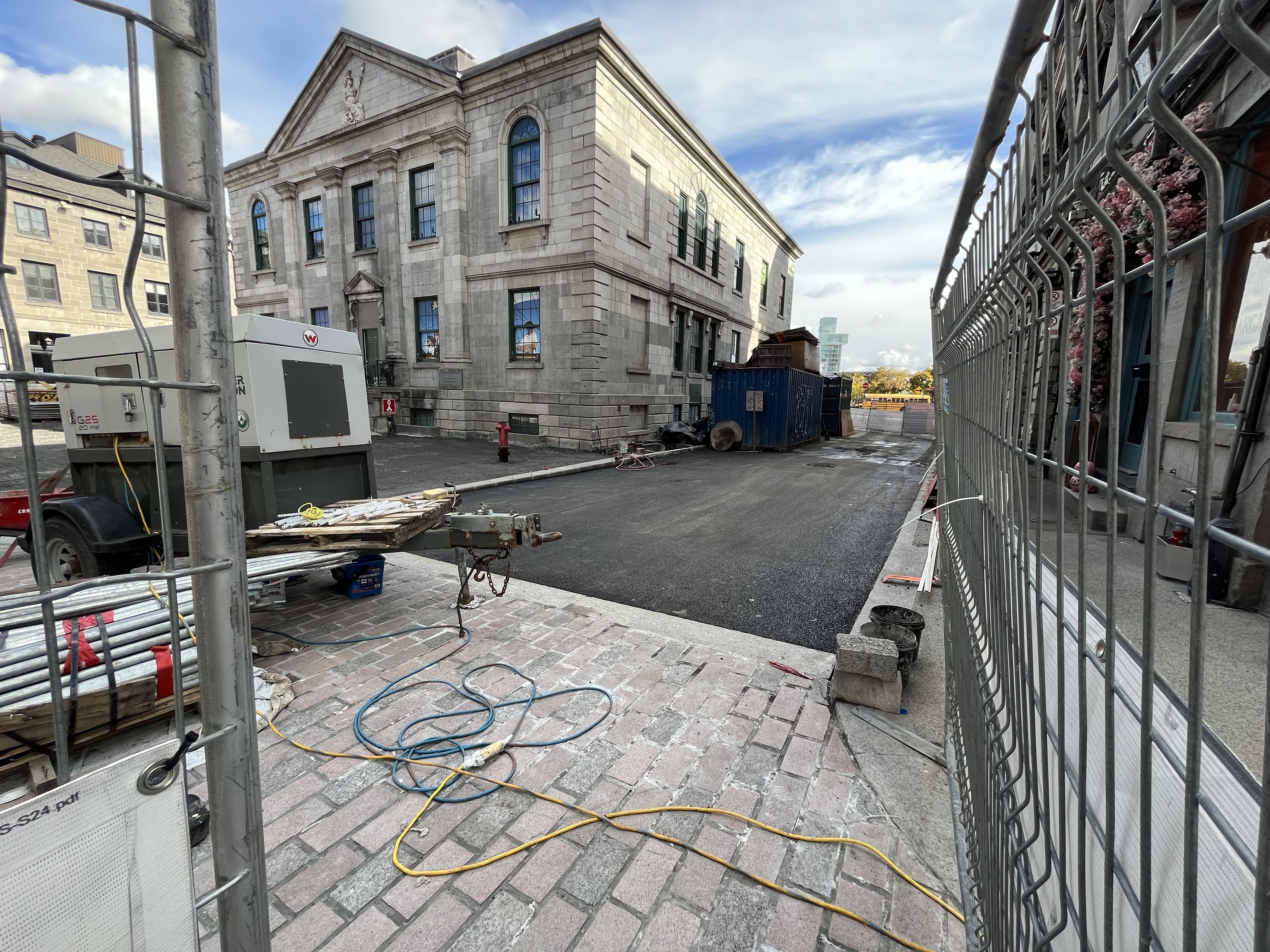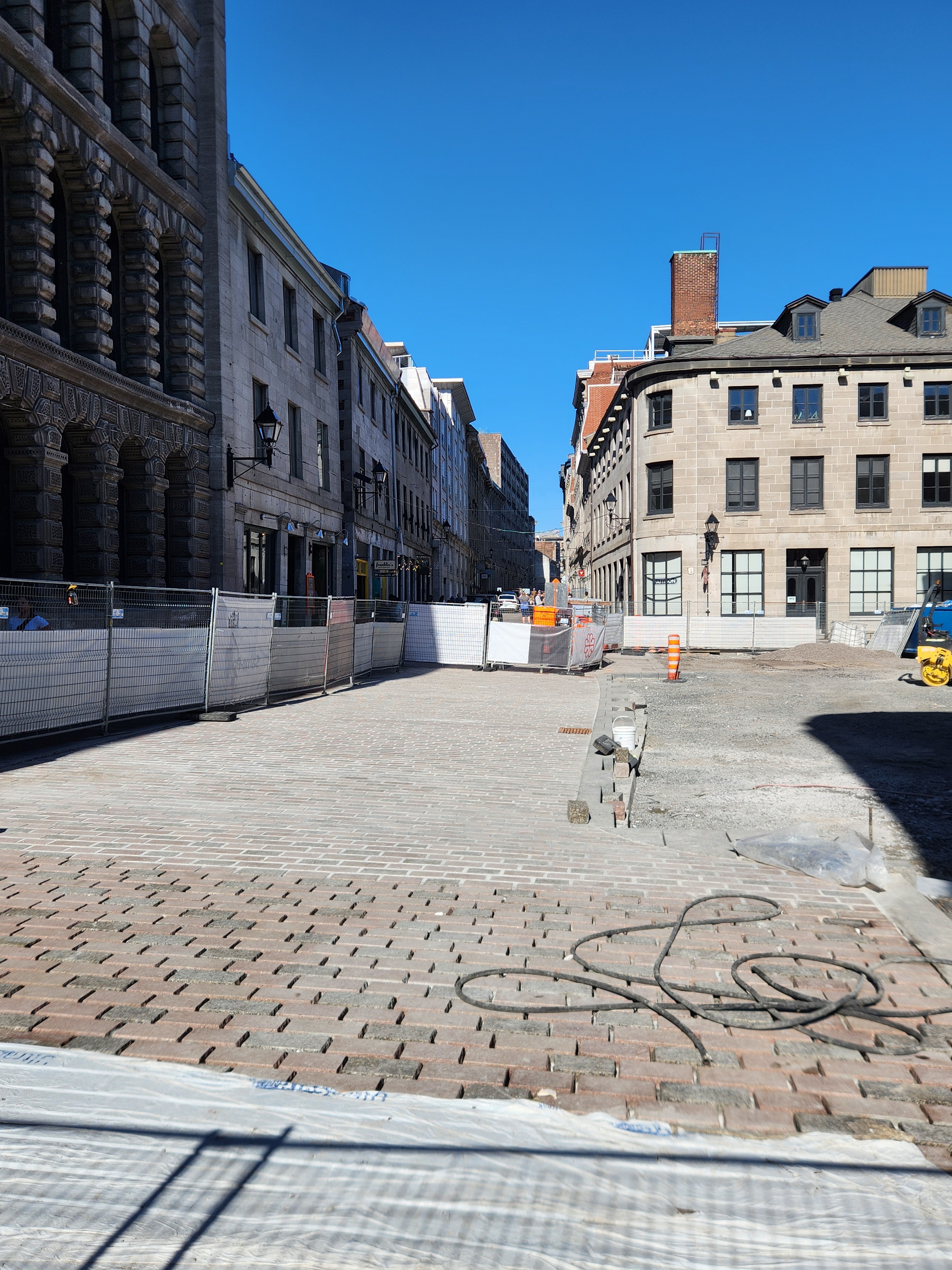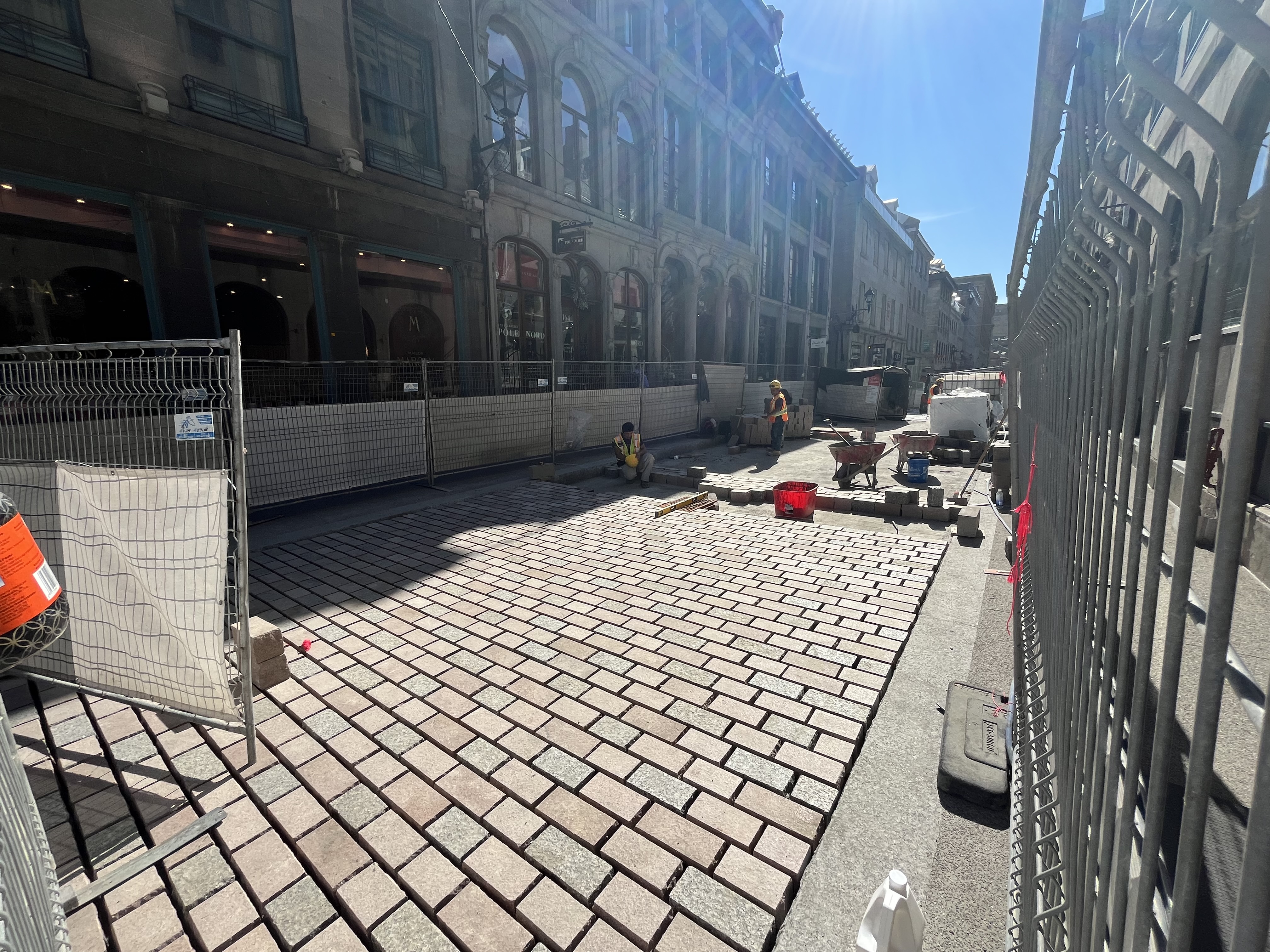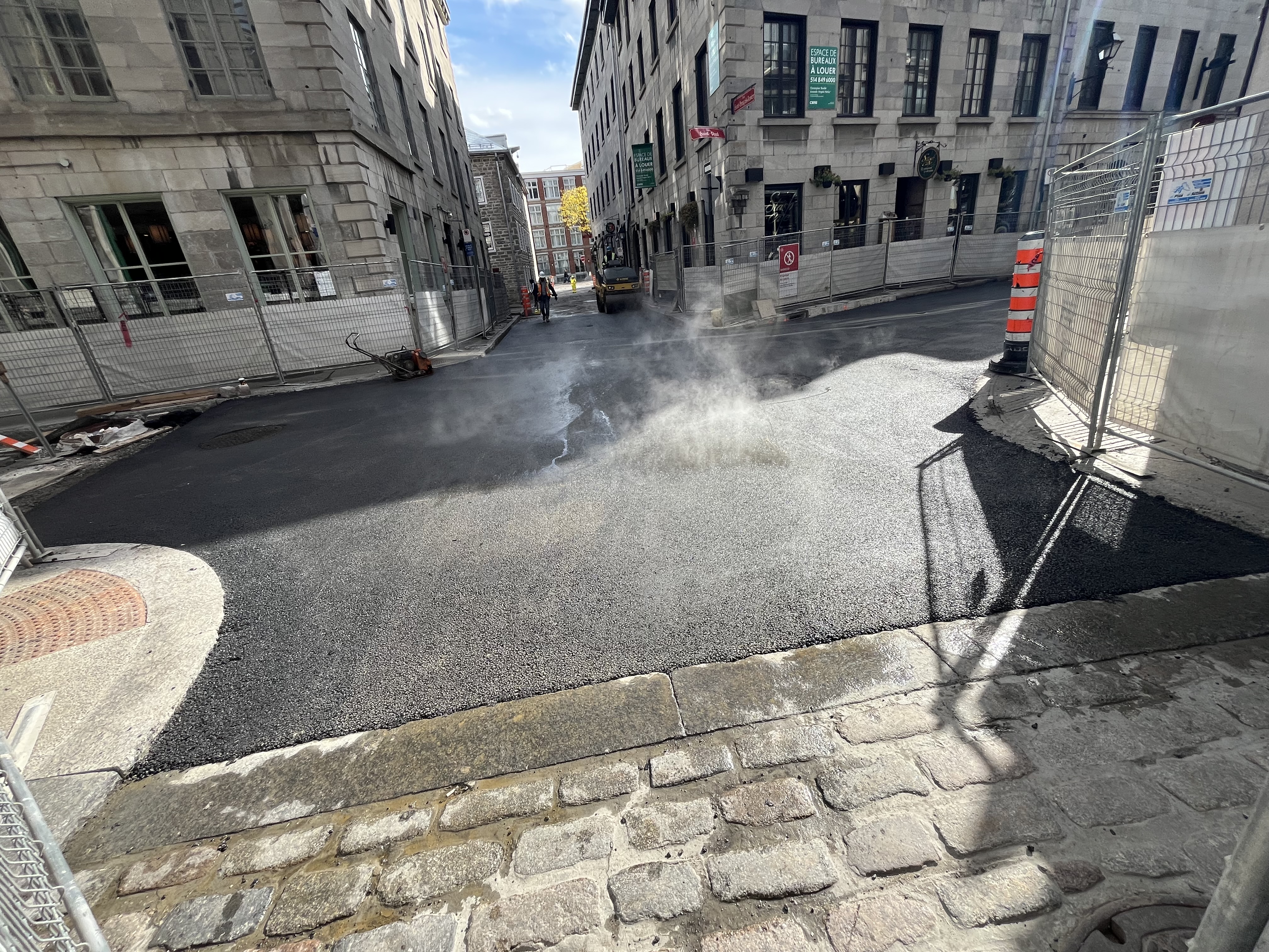 je me suis mal exprimé, désolé. Le chantier continue pour la pose de pavés, mais la partie au bout au niveau de Saint-François-Xavier est entrain d’être asphaltée (la ligne commence intersection est de cette rue), car j’imagine ils n’auront pas le temps d’y arriver(ou ça ne fait pas partie de cette phase).