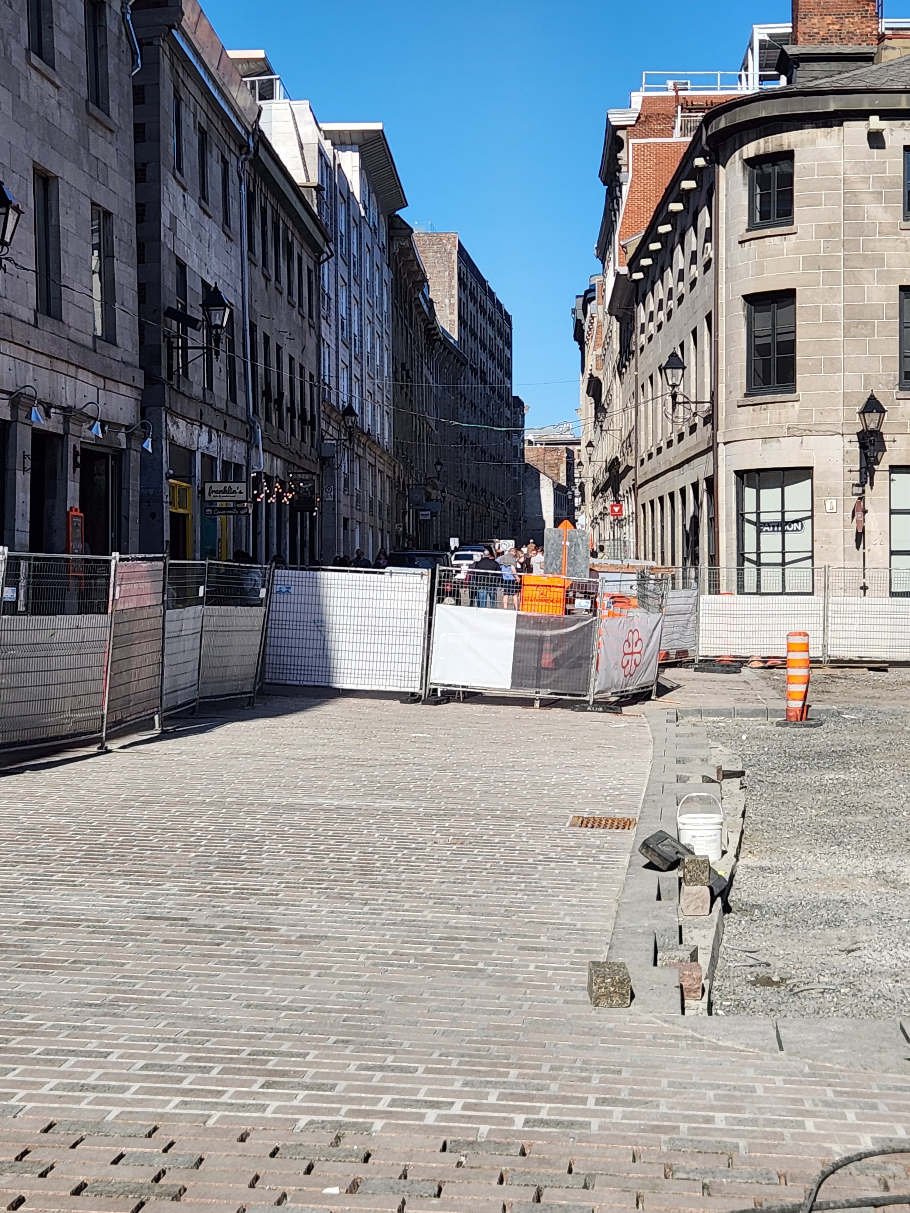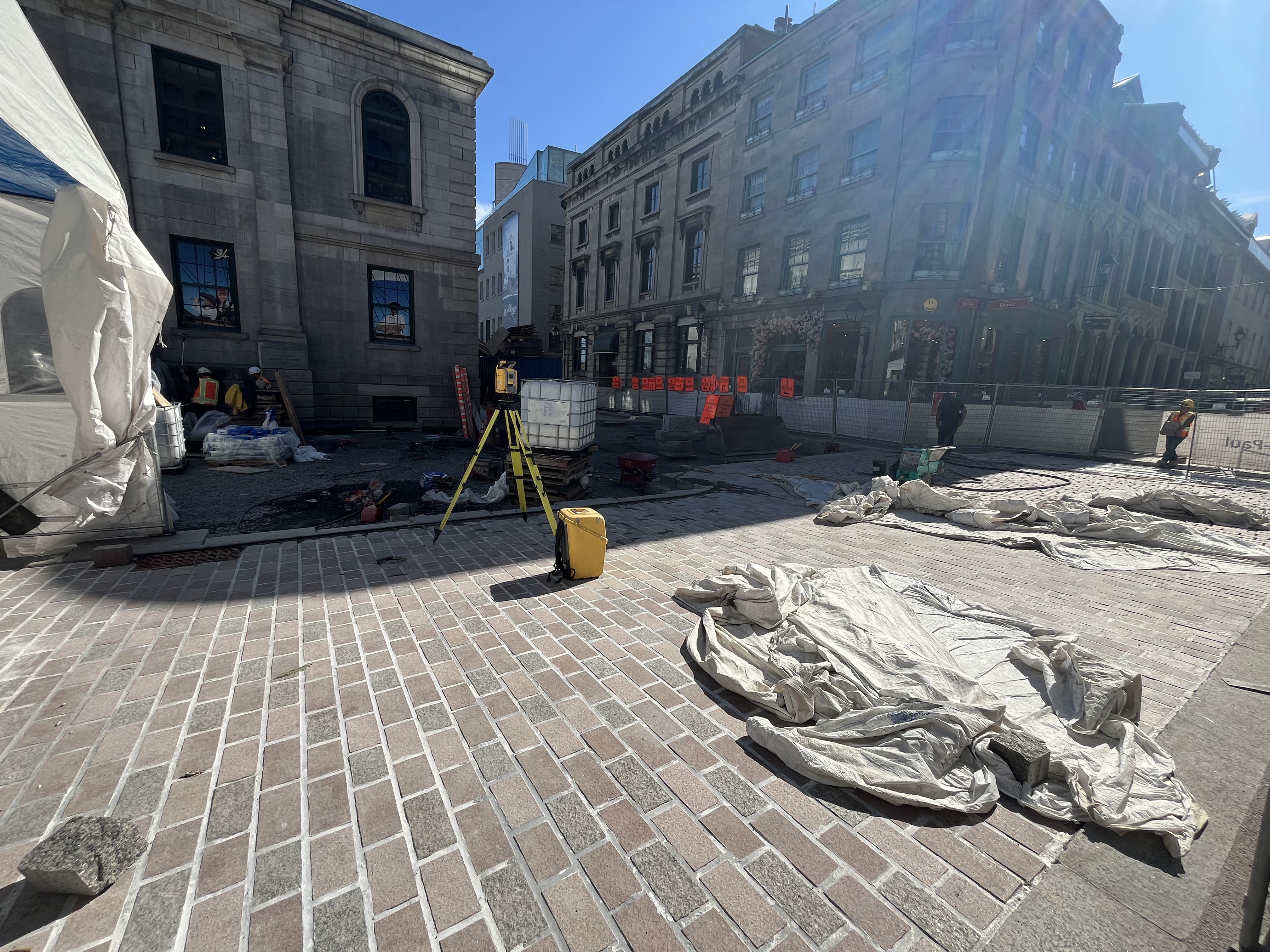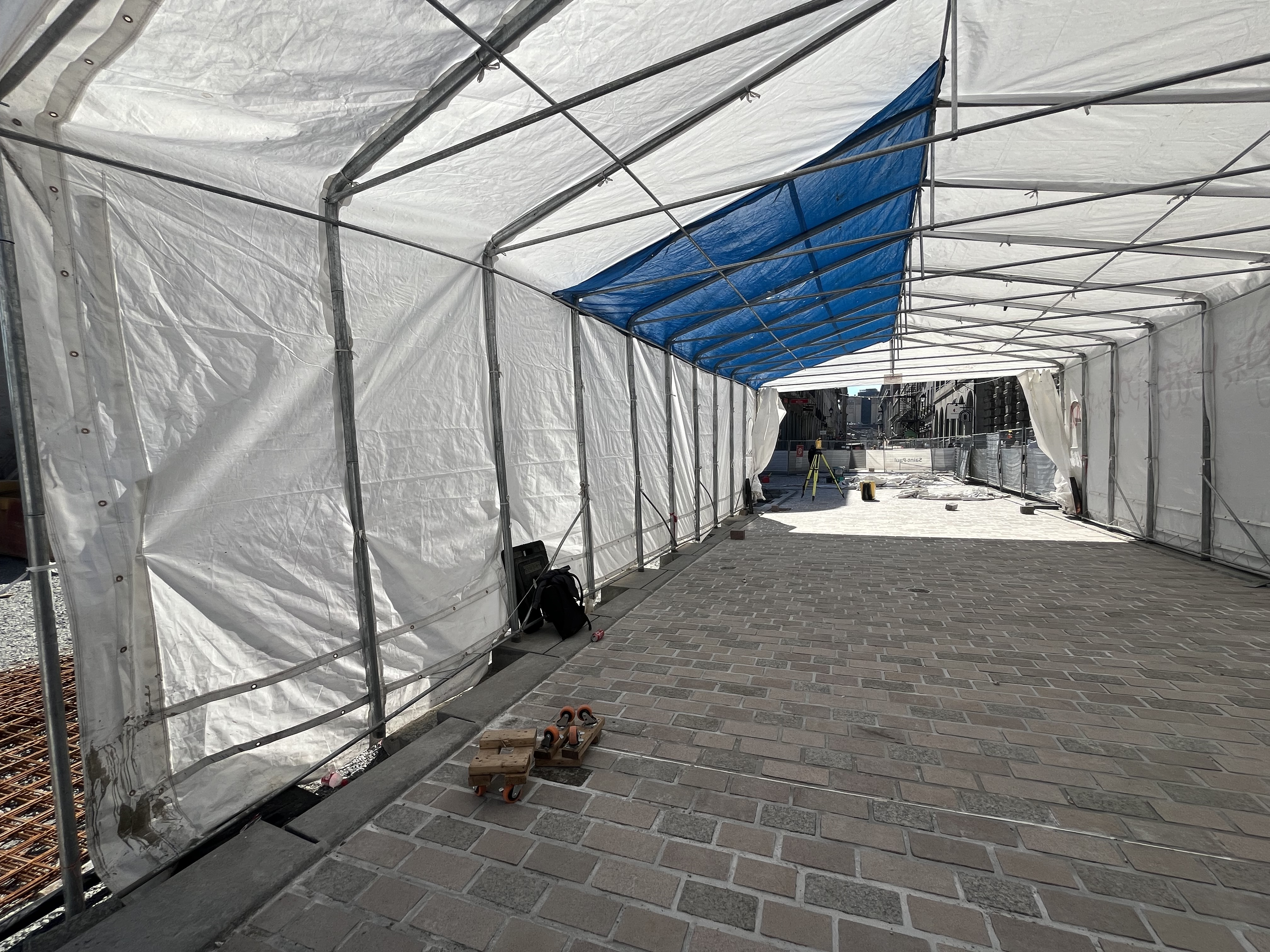 je me suis mal exprimé, désolé. Le chantier continue pour la pose de pavés, mais la partie au bout au niveau de Saint-François-Xavier est entrain d’être asphaltée (la ligne commence intersection est de cette rue), car j’imagine ils n’auront pas le temps d’y arriver(ou ça ne fait pas partie de cette phase).