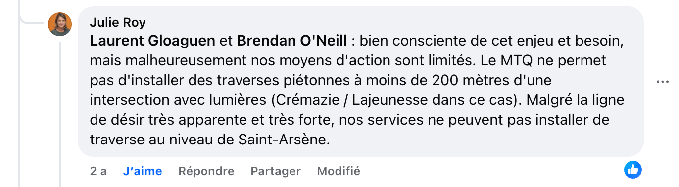 Le mtq ne permet pas une traverse piétonne à moins de 200m d’un feu sur l’ensemble du réseau municipal? Il y a des cas à Laval qui sont aménagés à l’intérieur de cette distance.