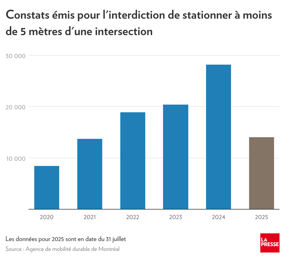 À Montréal, les automobilistes sont très nombreux à l’enfreindre. En 2024, 28 156 constats ont été remis à ce sujet par l’Agence de mobilité durable de Montréal, un sommet. C’est un bond énorme comparativement aux 8426 constats délivrés à la création de l’agence, en 2020.