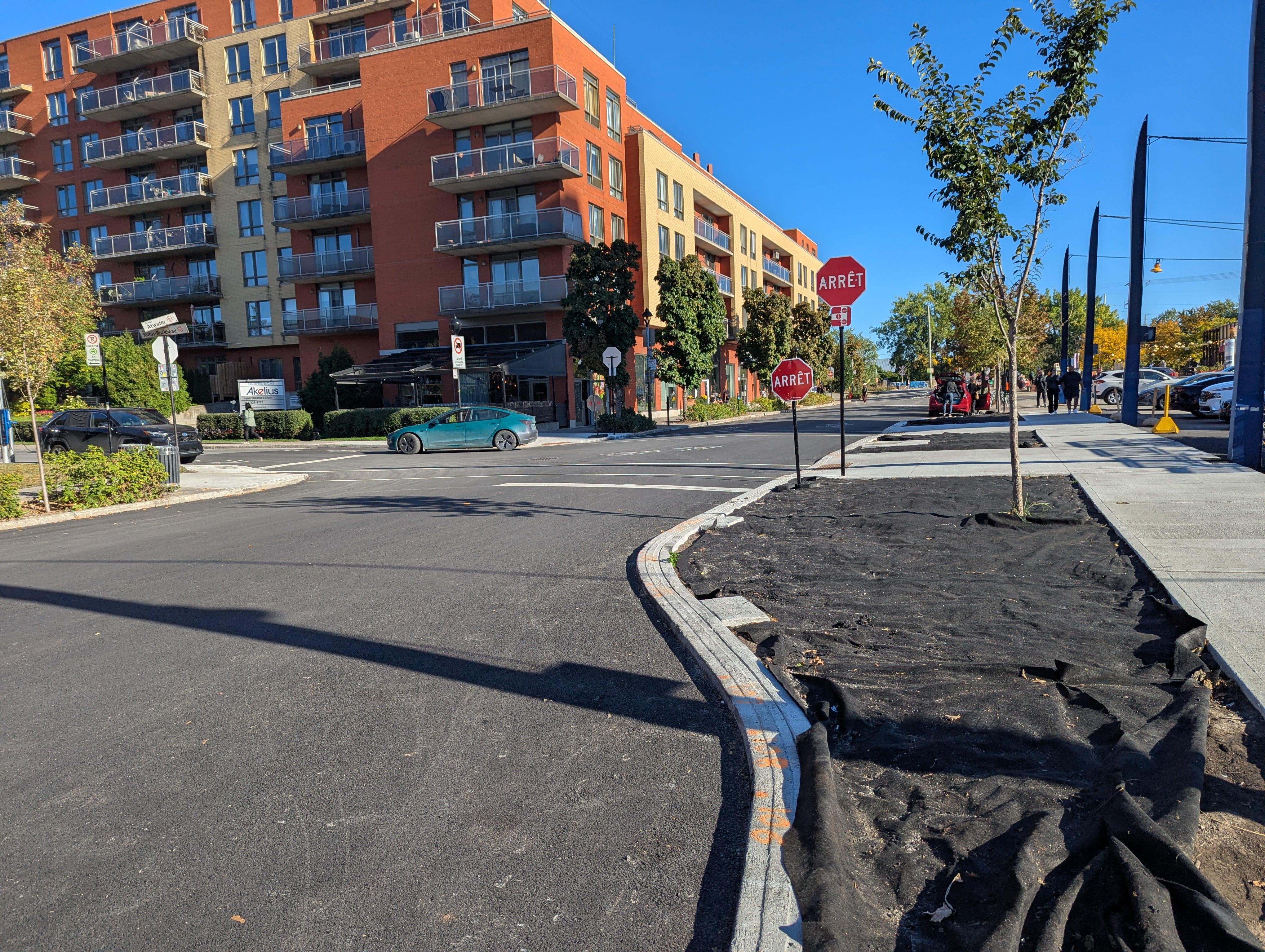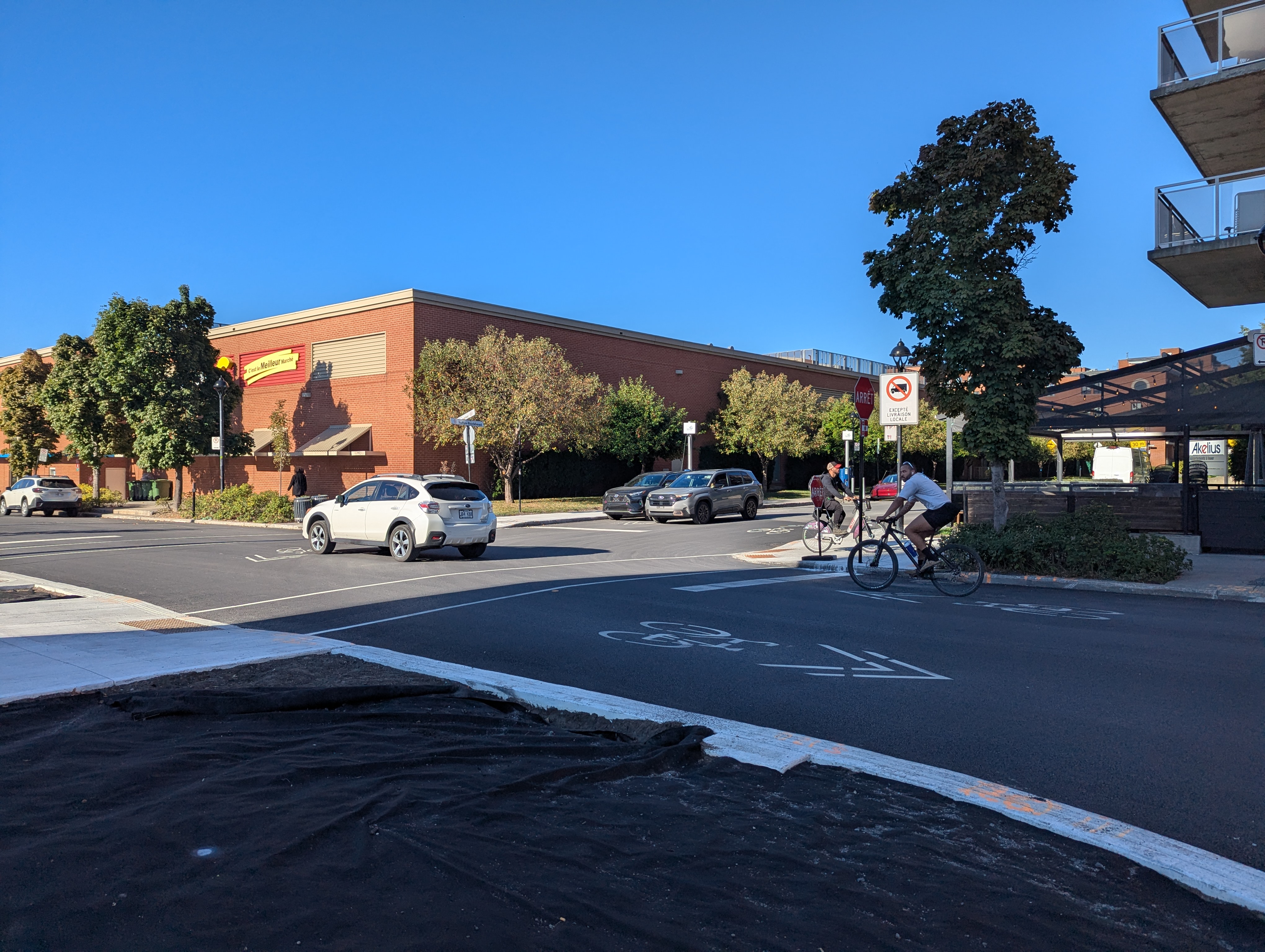 C’est mieux, mais ça manque d’ambition. C’est encore très large pour la traverse piétonne. Où est l’intersection surélevée/pavée qui aurait été bienvenue aux abords du marché? Et puis les sharrows en 2025… Meh.