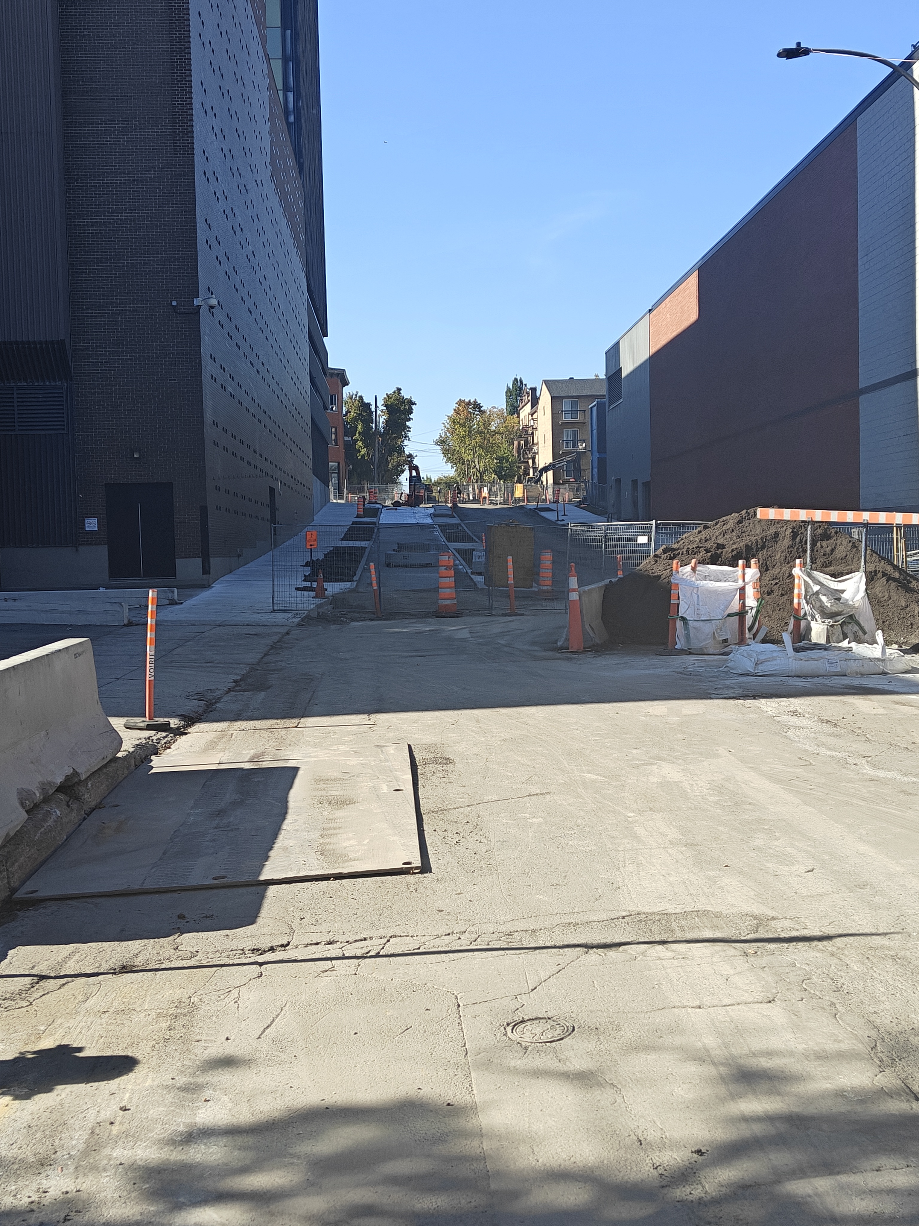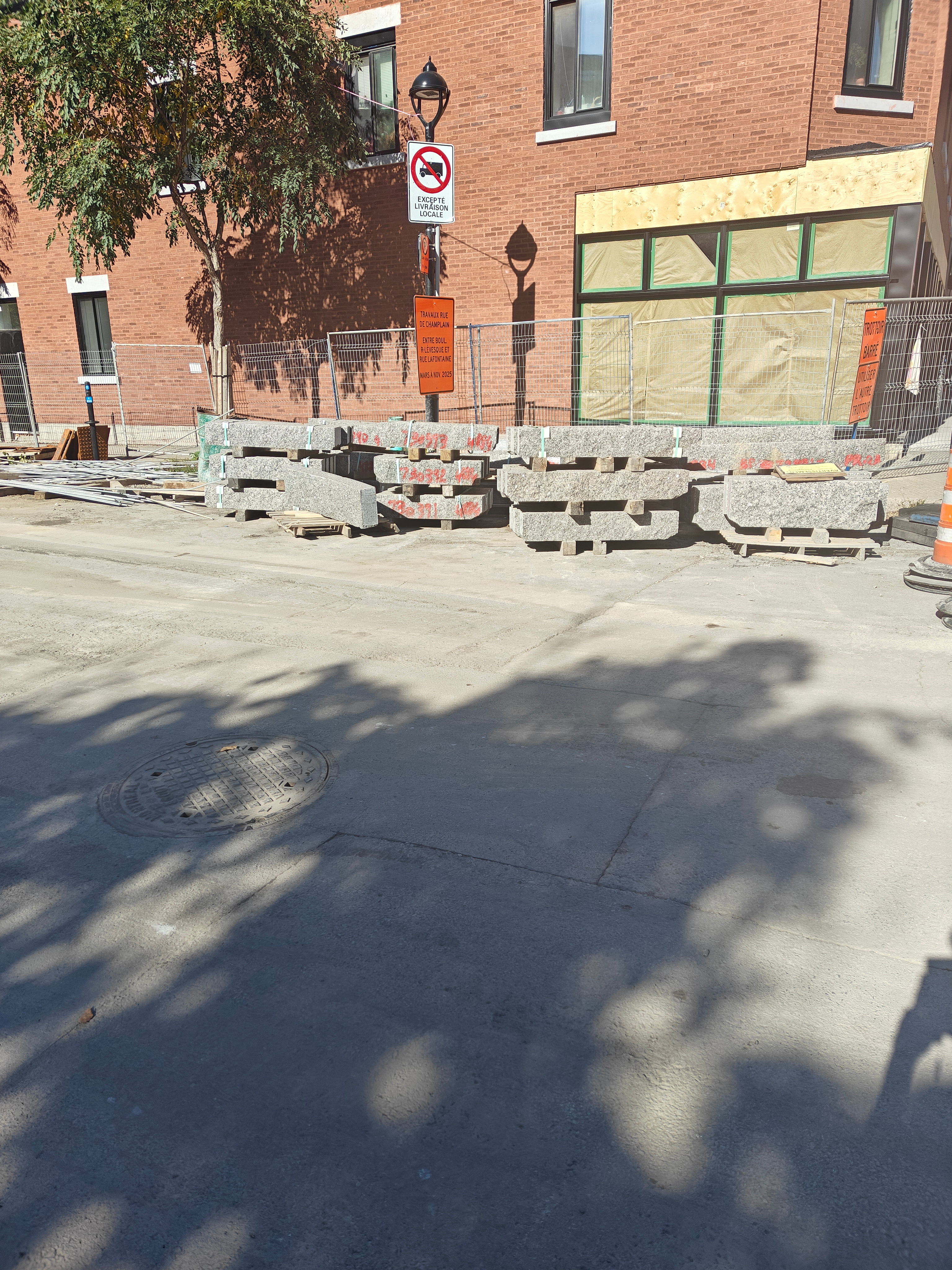 Je crois que ça va ici - réaménagement de la rue Champlain juste au nord de Sainte-Catherine, avece granit en prime. J’ai vu une affiche, les travaux continuent jusqu’en novembre.