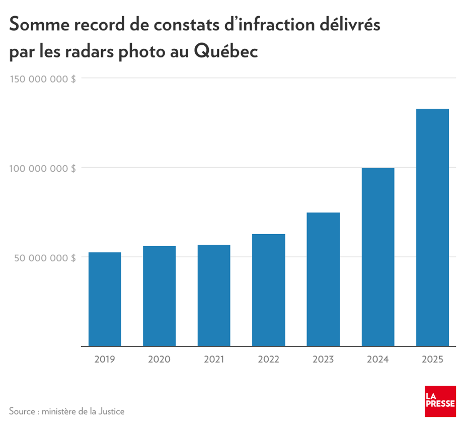 Les radars photo ont rapporté la somme record de 133 millions à Québec en 2025. Le déploiement de nombreux appareils mobiles a fait bondir du tiers les revenus générés par ces appareils.