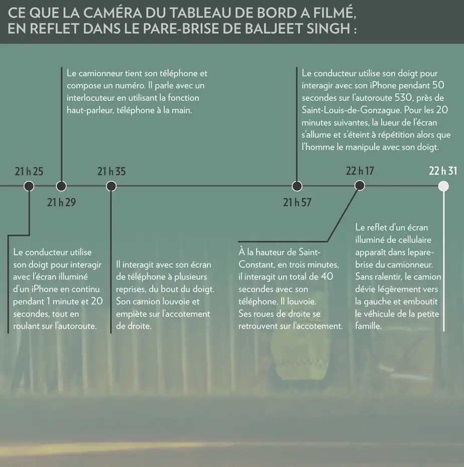 En une seule journée de juillet 2022, un camionneur absorbé par son téléphone cellulaire a commis au moins 43 infractions au Code de la sécurité routière avant de provoquer un carambolage mortel sur l’autoroute 30, selon un rapport obtenu par La Presse . Après trois ans de cavale autour du monde, Baljeet Singh a finalement comparu devant un tribunal québécois jeudi.