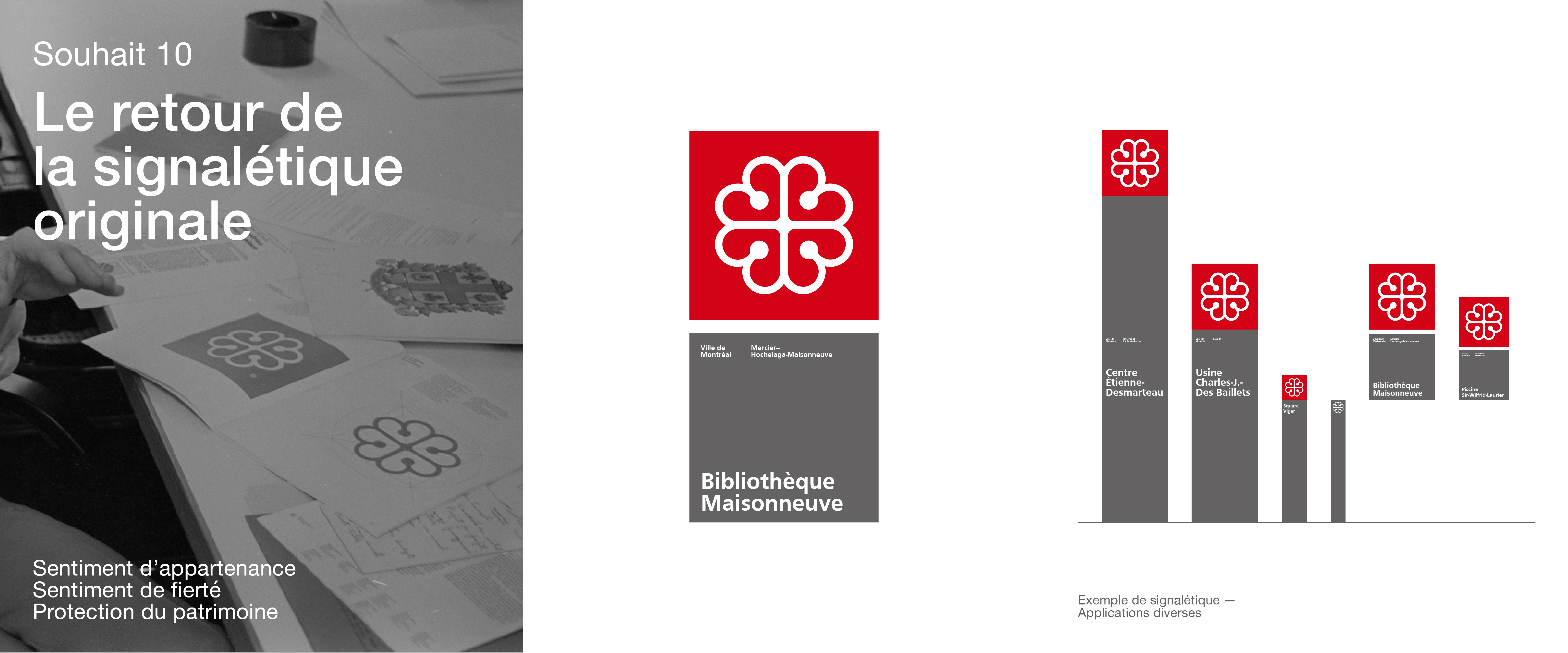L’image graphique de Montréal, conçue par Georges Huel en 1981, a perdu de sa clarté et de sa cohérence au fil des fusions municipales et des transformations administratives. Afin de renforcer le sentiment d’appartenance et de fierté, et par respect pour le patrimoine graphique du logo original, il serait souhaitable de se rapprocher des prescriptions initiales de la signalétique des bâtiments publics.