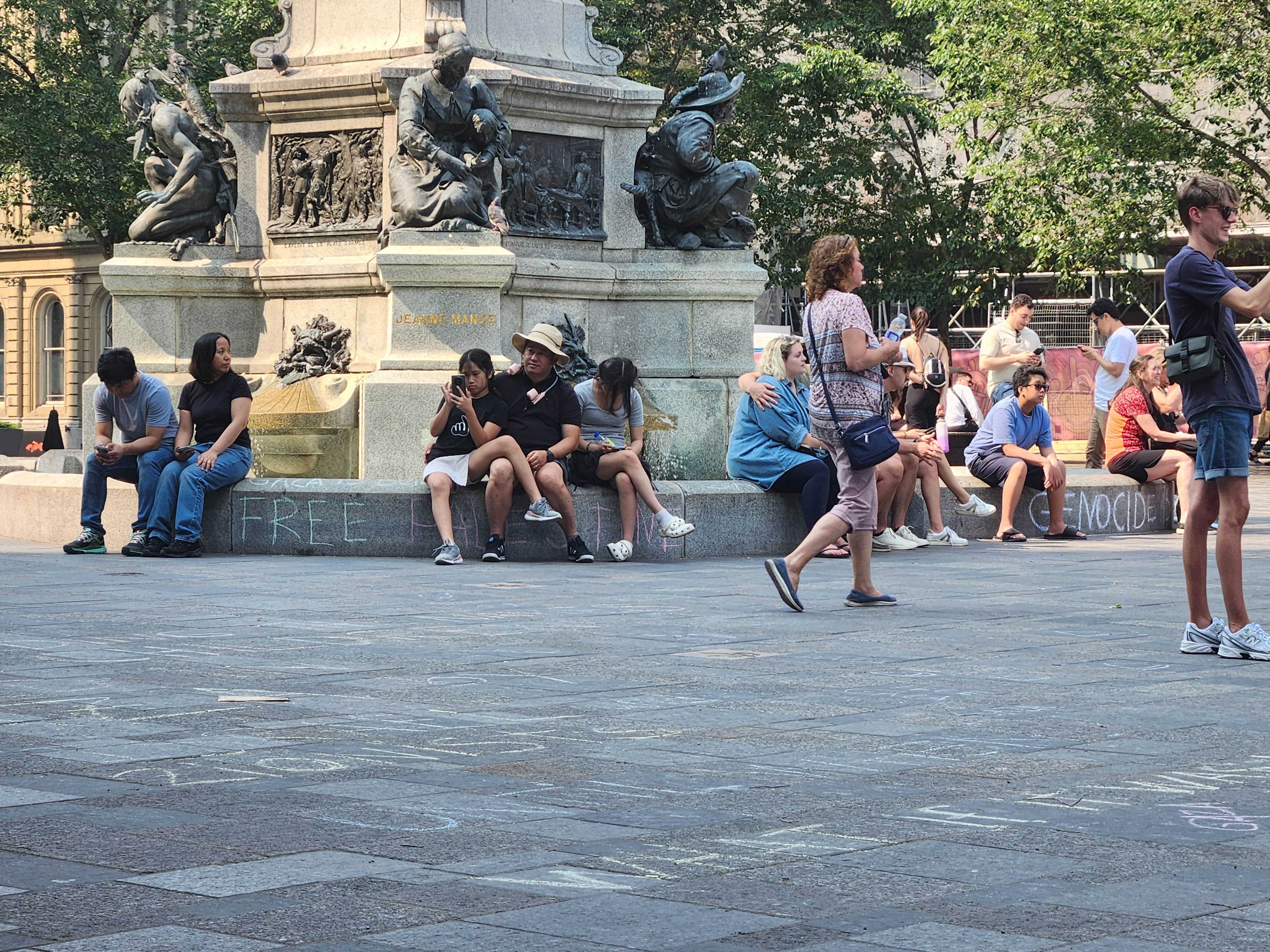 Une manifestation pro-Gaza/Palestine est en cours à la Place d’Armes. Des slogans ont été écrits à la craie sur les monuments et le sol. Beaucoup de drapeaux et on manifeste avec des micros.