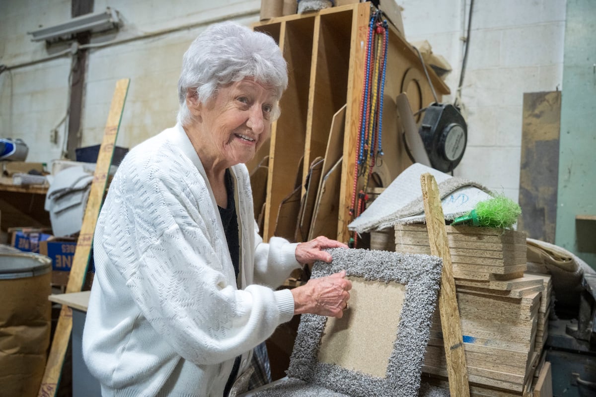Son agrafeuse dans une main, elle m’accueille avec le sourire en me montrant la production de la journée: une pile de plateformes recouvertes de tapis gris.