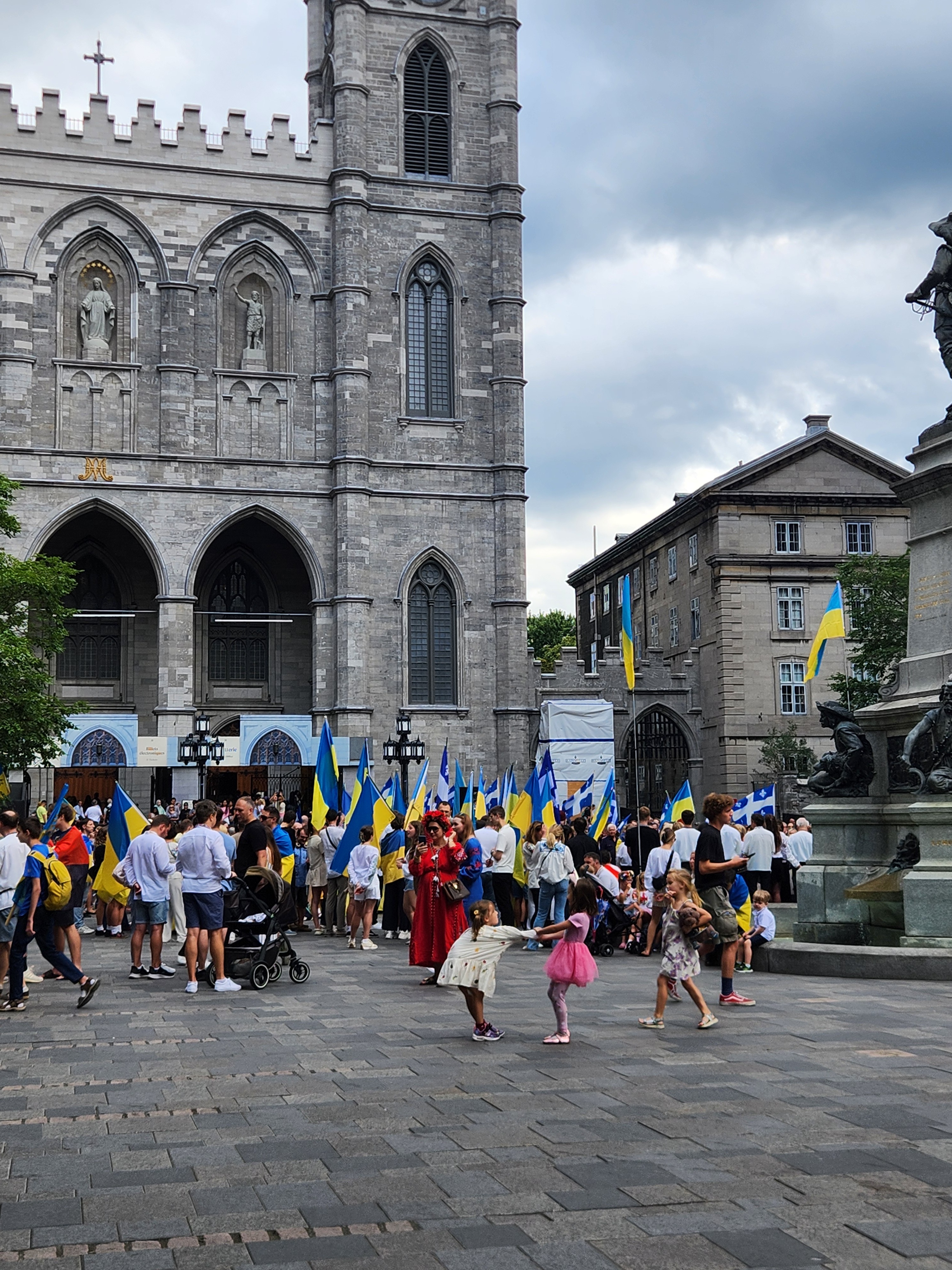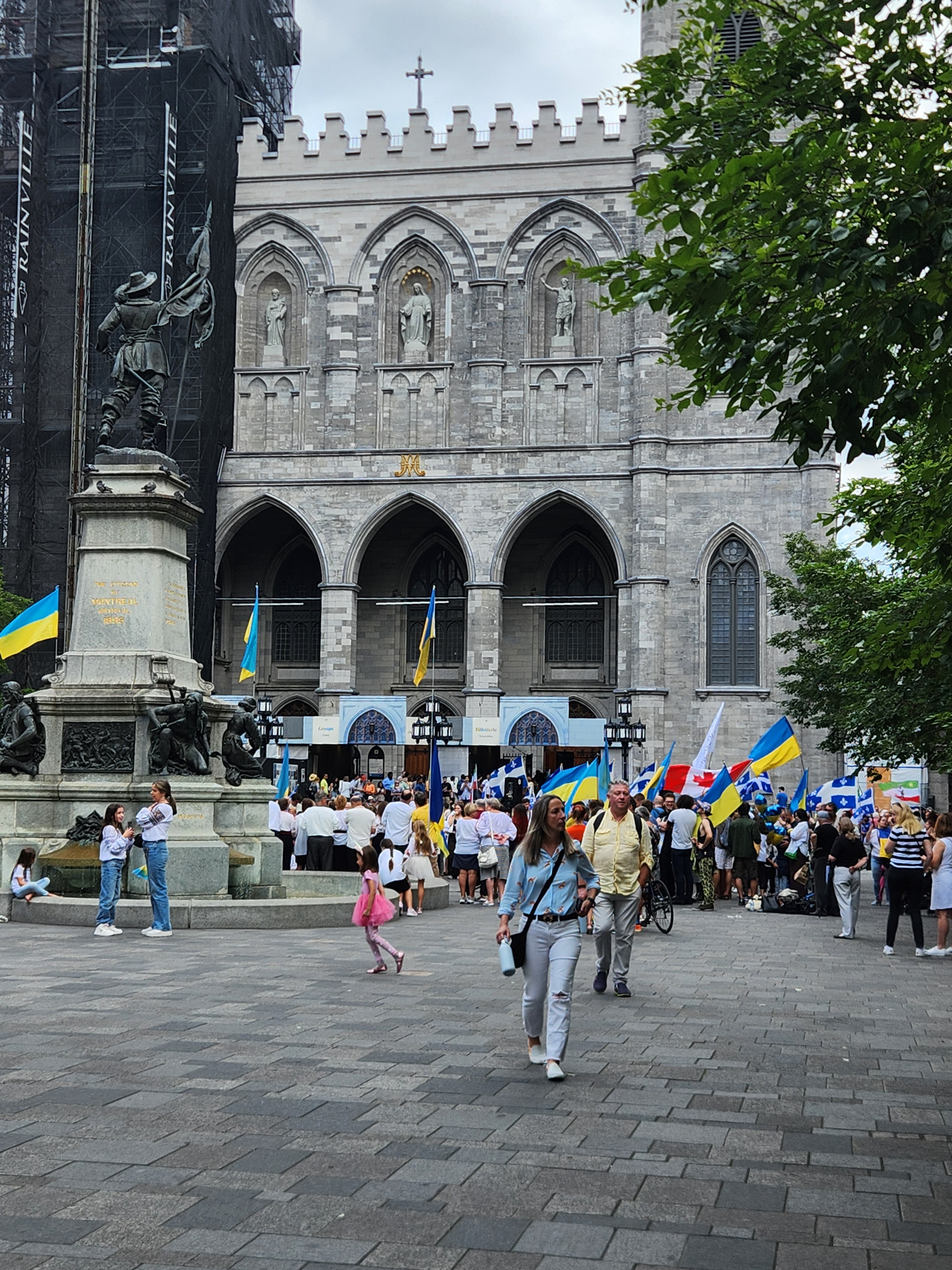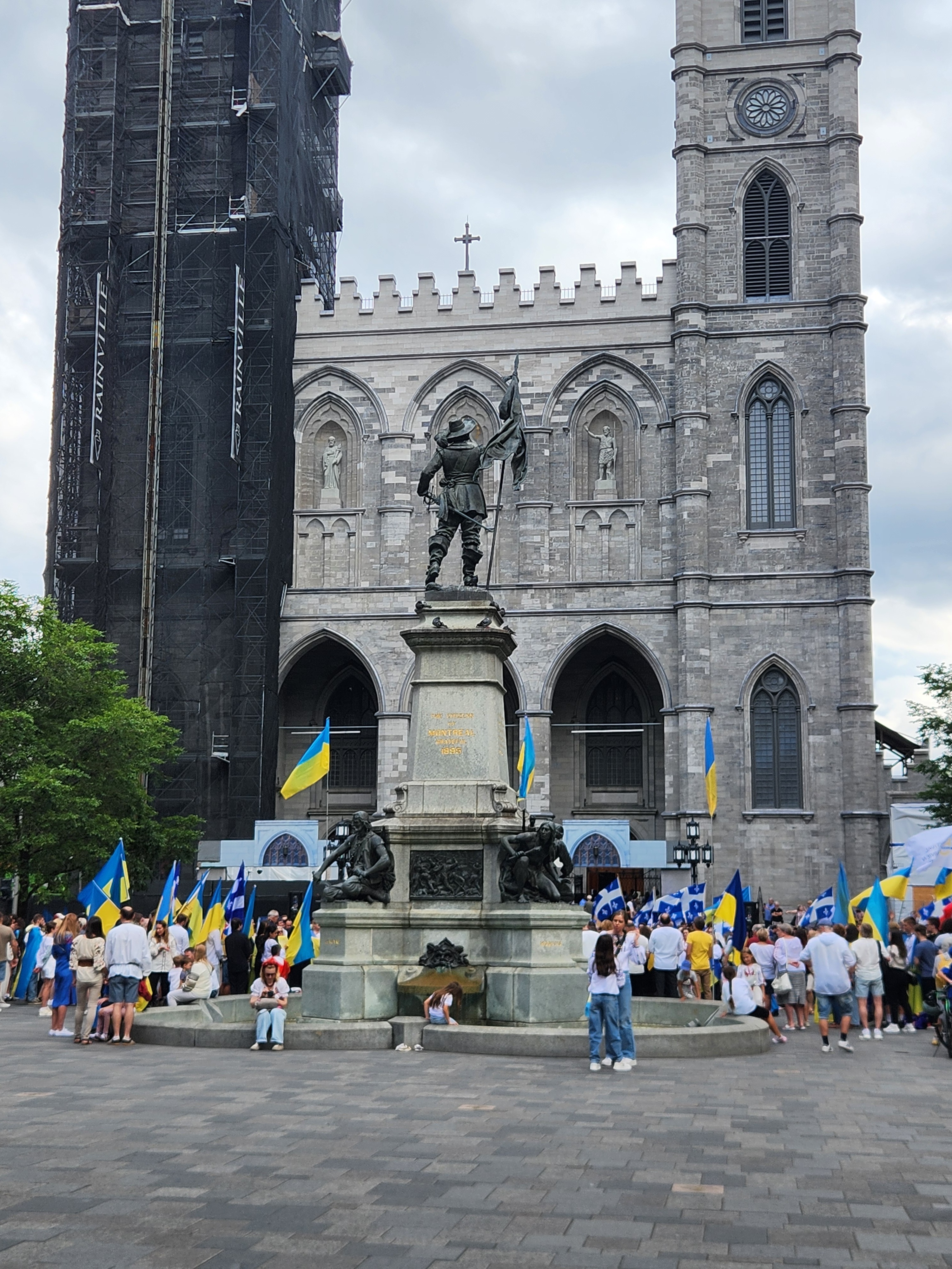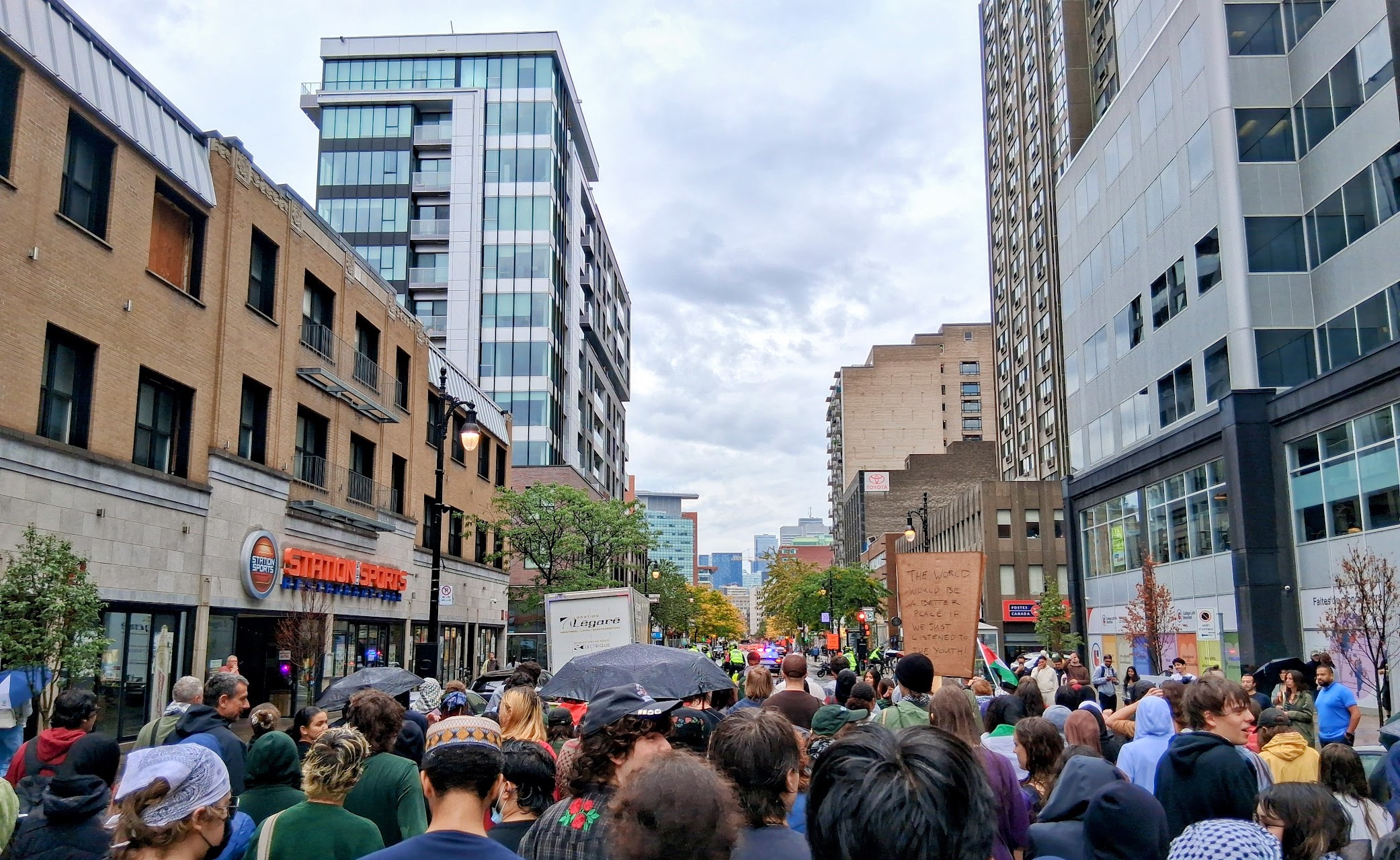 Une manifestation pro-Gaza/Palestine est en cours à la Place d’Armes. Des slogans ont été écrits à la craie sur les monuments et le sol. Beaucoup de drapeaux et on manifeste avec des micros.