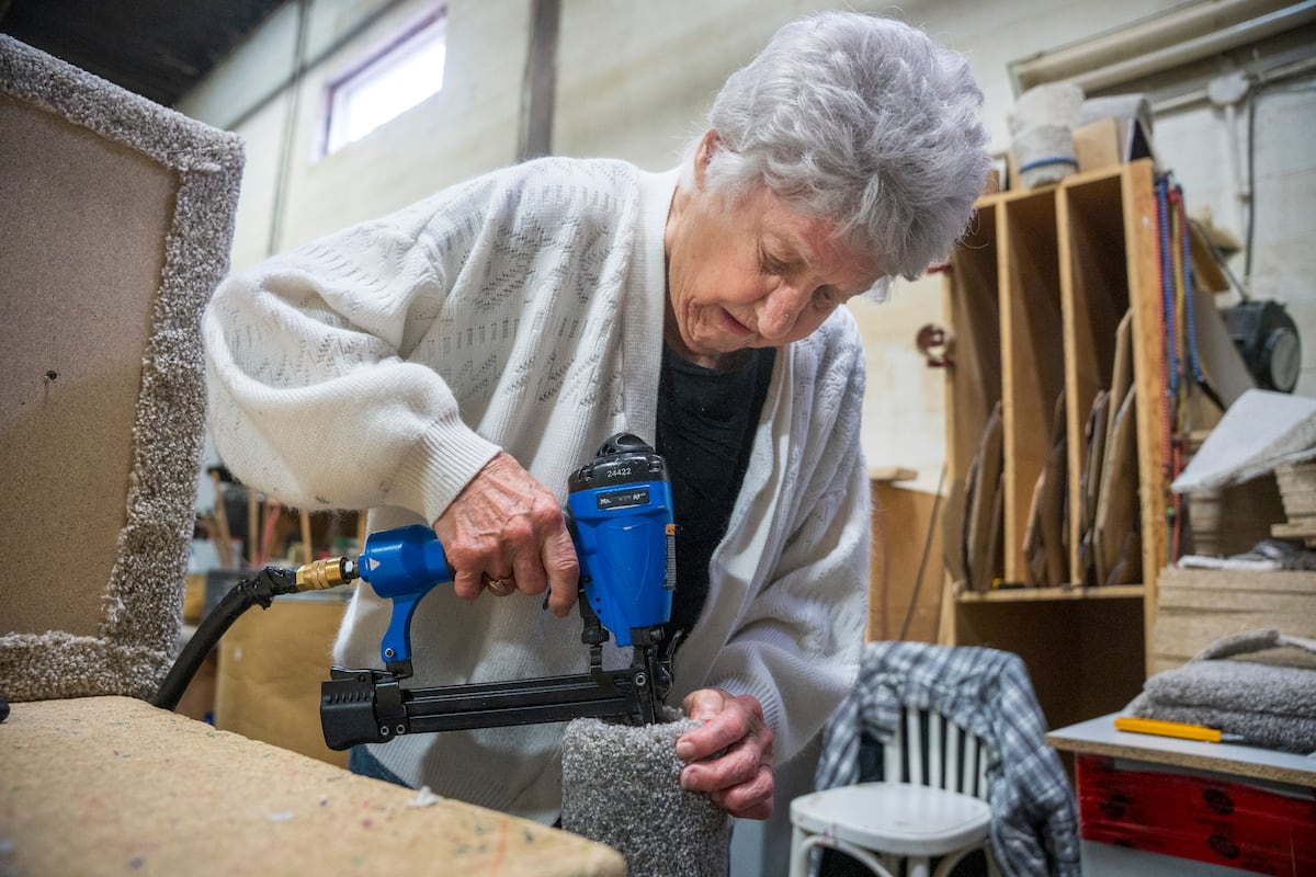 Rita Delafontaine manie son agrafeuse avec doigté et précision. À l’atelier, elle a aussi sa machine à coudre et son marteau à elle. (Jean Roy/La Tribune)