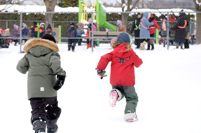 Des élèves de la maternelle s’amusant dans une cour d’école de Gatineau, alors que des recommandations sur la gestion des buttes de neige suscitent de multiples réactions. (Patrick Woodbury/Le Droit)