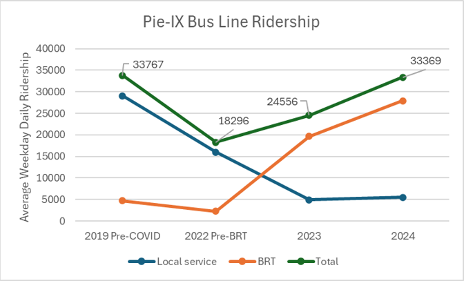 En 2024, l’achalandage total du corridor Pie-IX (139+439) s’était totalement rétabli de la pandémie. L’achalandage de la 139 a stagné, tandis que la 439 semble devenir de plus en plus populaire. Il reste à voir si la tendance se maintient.
