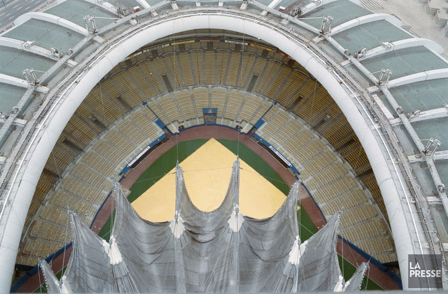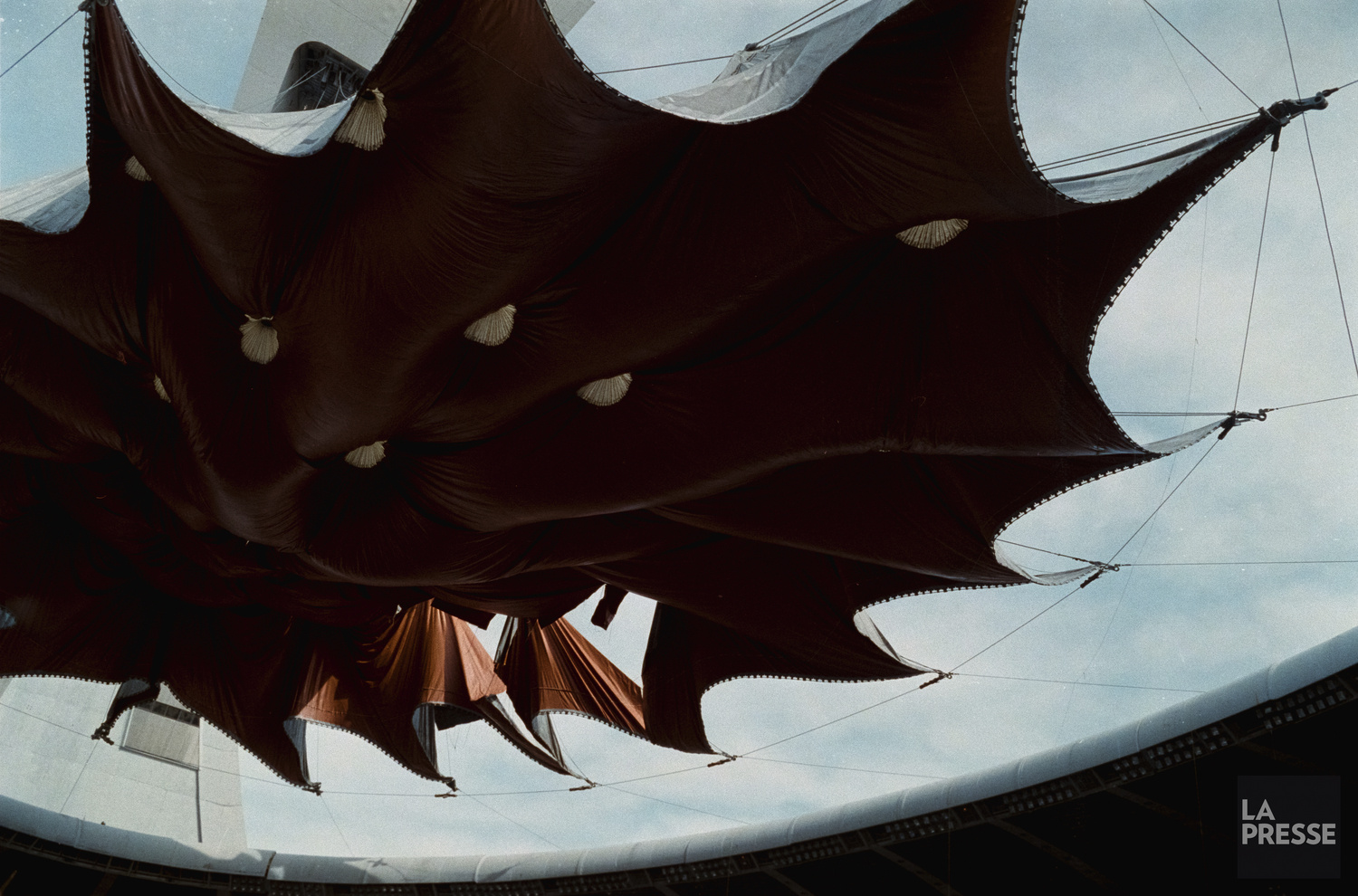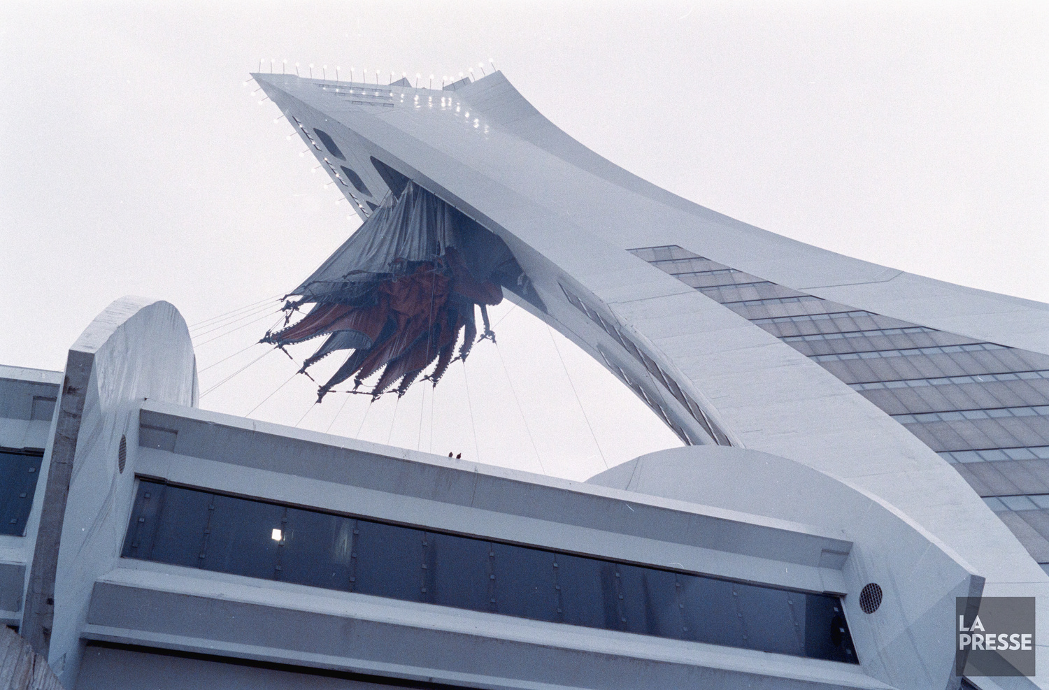 Installation de la 1ère toile de Kevlar il y a 38 ans, le 15 avril 1987 avec une tour en finalisation. Vue notamment de l’avenue du Mont-Royal.