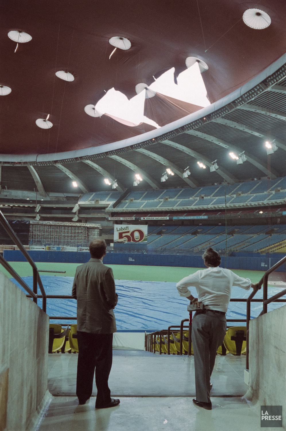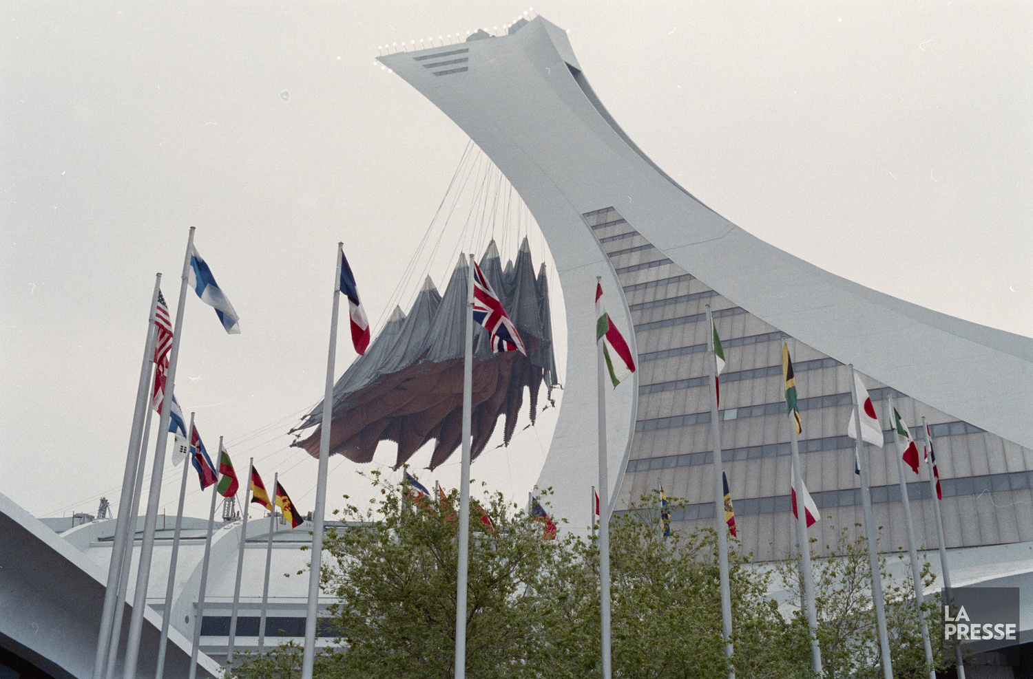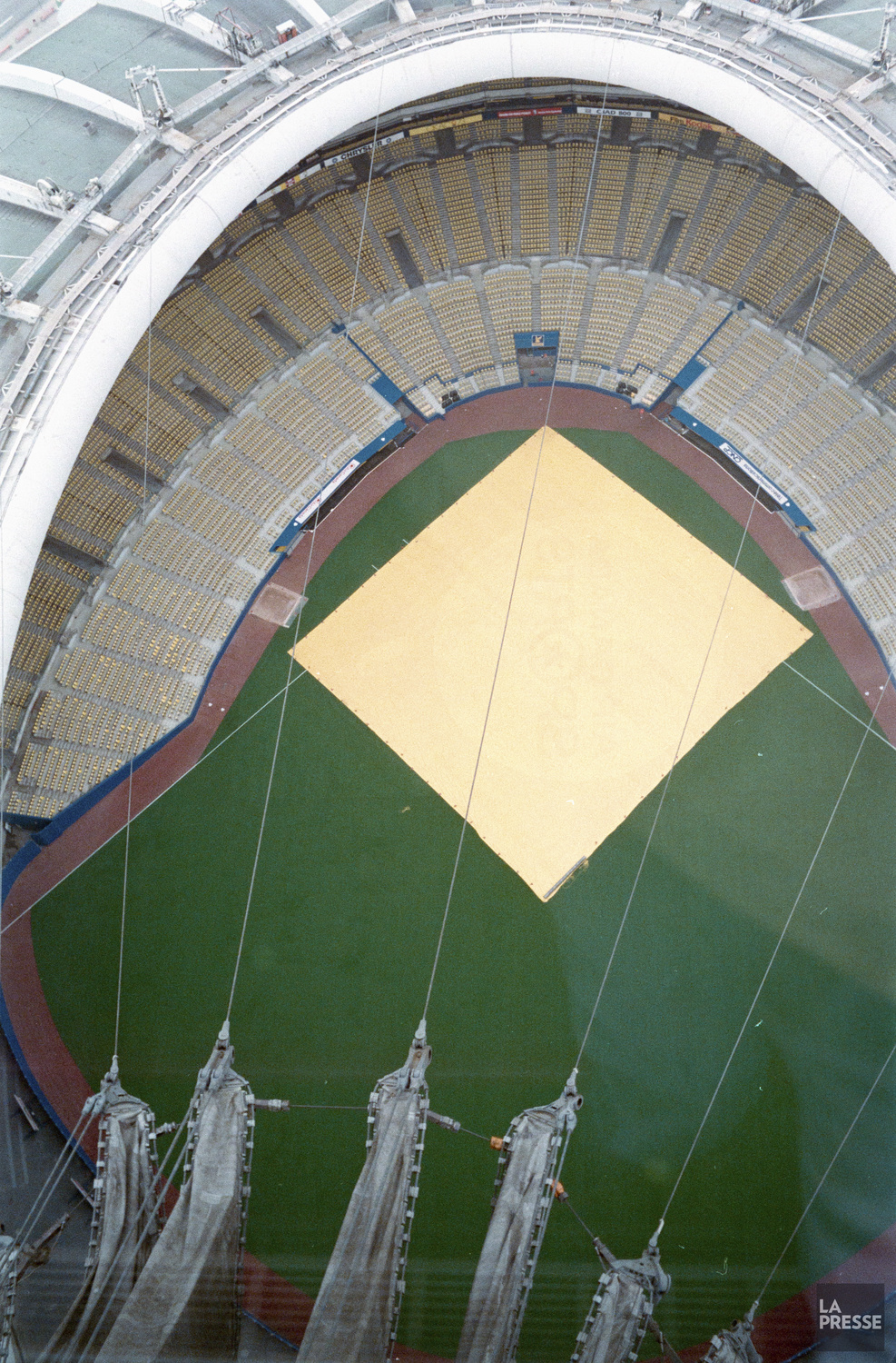 Installation de la 1ère toile de Kevlar il y a 38 ans, le 15 avril 1987 avec une tour en finalisation. Vue notamment de l’avenue du Mont-Royal.