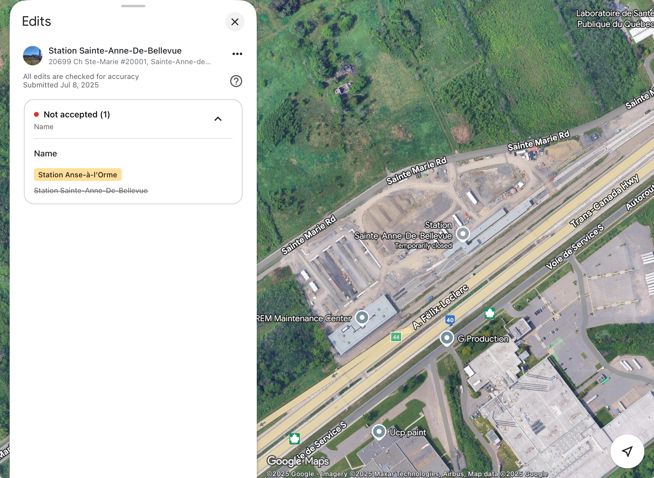 Fait intéressant: Google Maps affiche la station comme étant «Station Sainte-Anne-de-Bellevue», et rejette les modifications pour «Station Anse-à-l’Orme»! Leur modération automatique a des croûtes à manger…