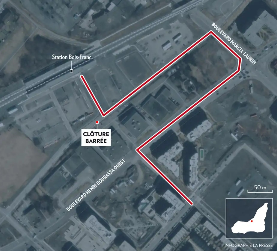 La station Bois-Franc se trouve à proximité d’un quartier résidentiel, dans Saint-Laurent. Les piétons doivent toutefois faire un long détour en raison de la présence d’une clôture ceinturant les espaces de stationnement de commerces voisins. « Il y a déjà une porte dans la clôture, ce serait très facile de juste l’ouvrir. Ça prendrait 30 minutes de travail », affirme le résidant Bosko Dzepina.