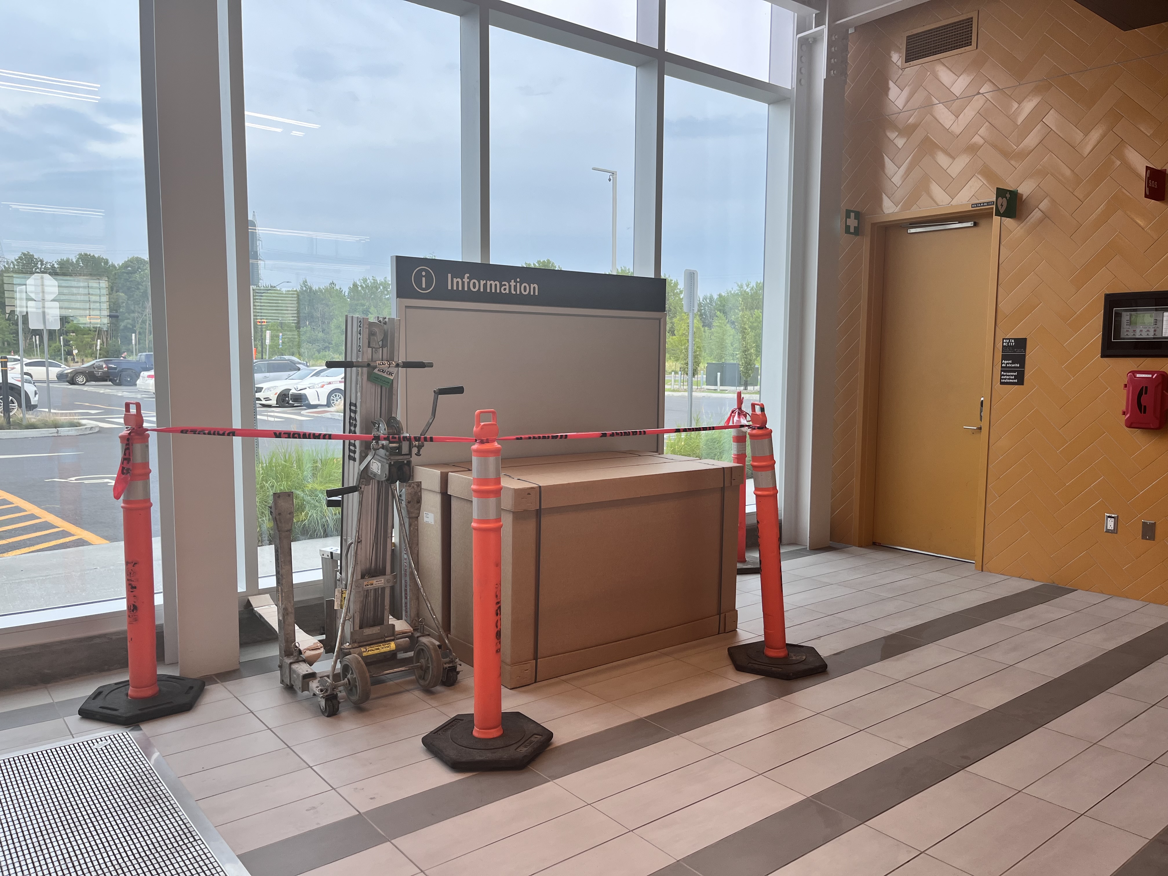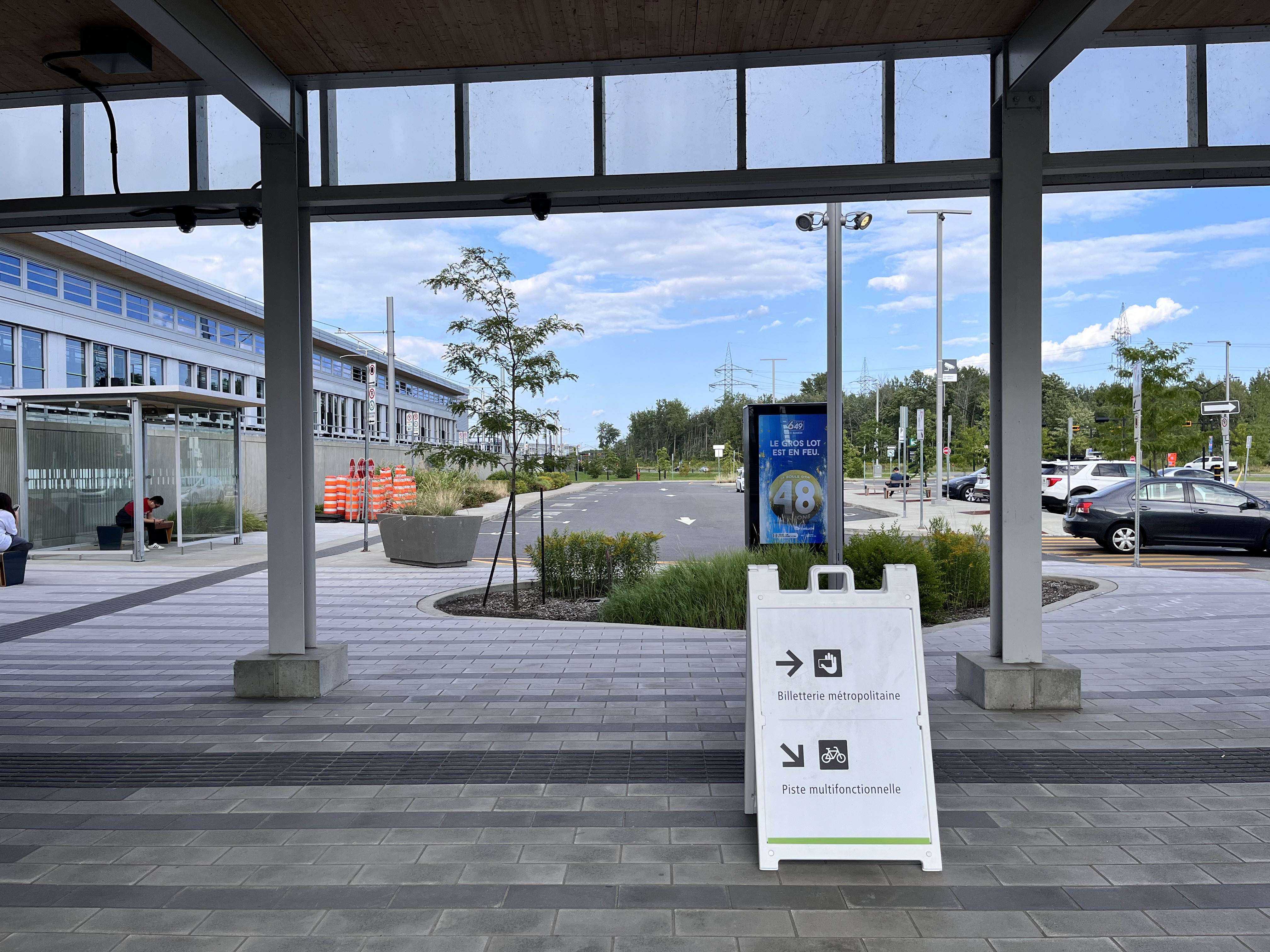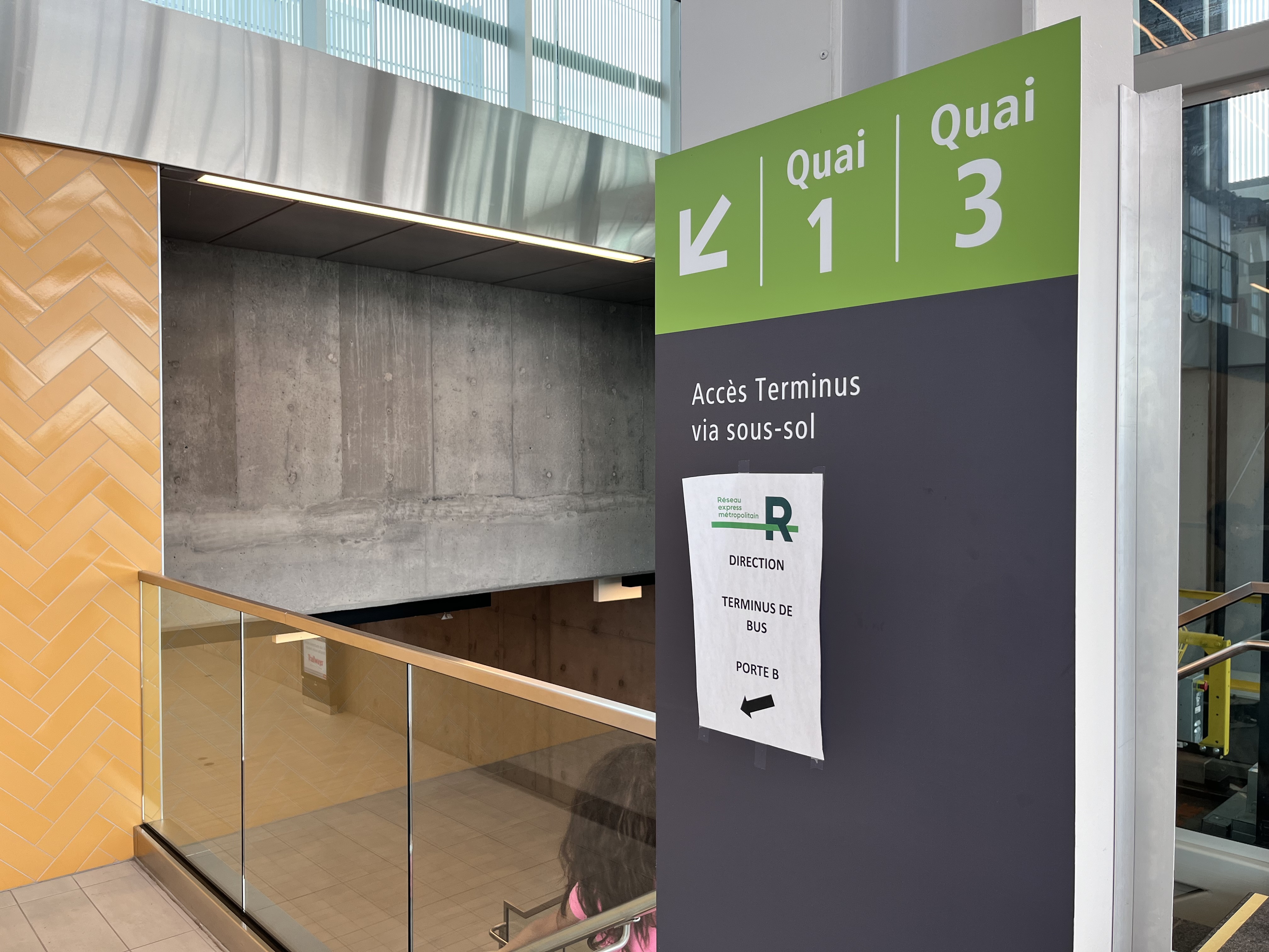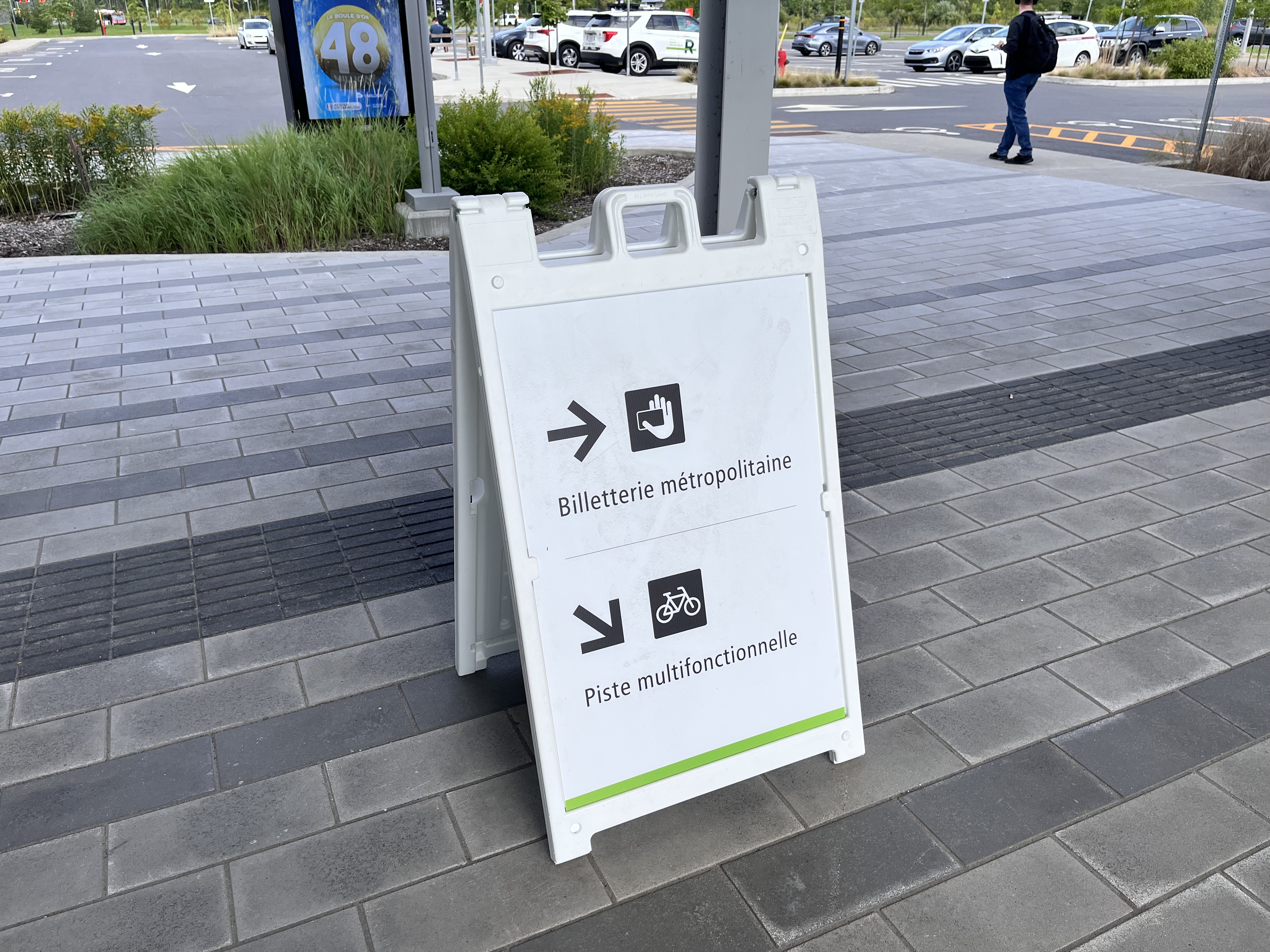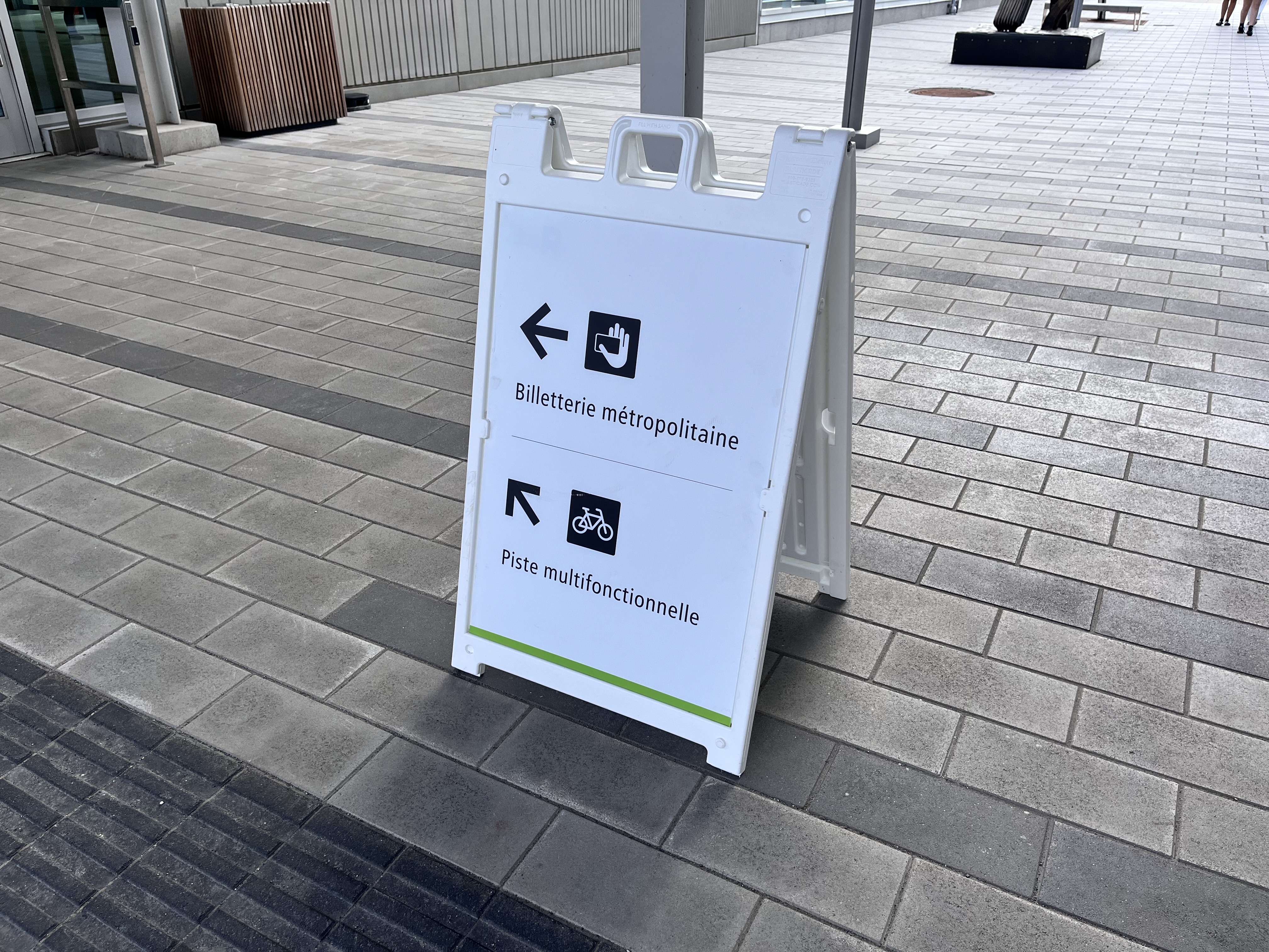 Une affiche a été ajoutée pour diriger les usagers vers la billetterie métropolitaine et la piste multifonctionnelle, mais les flèches ne sont pas dans la bonne direction.