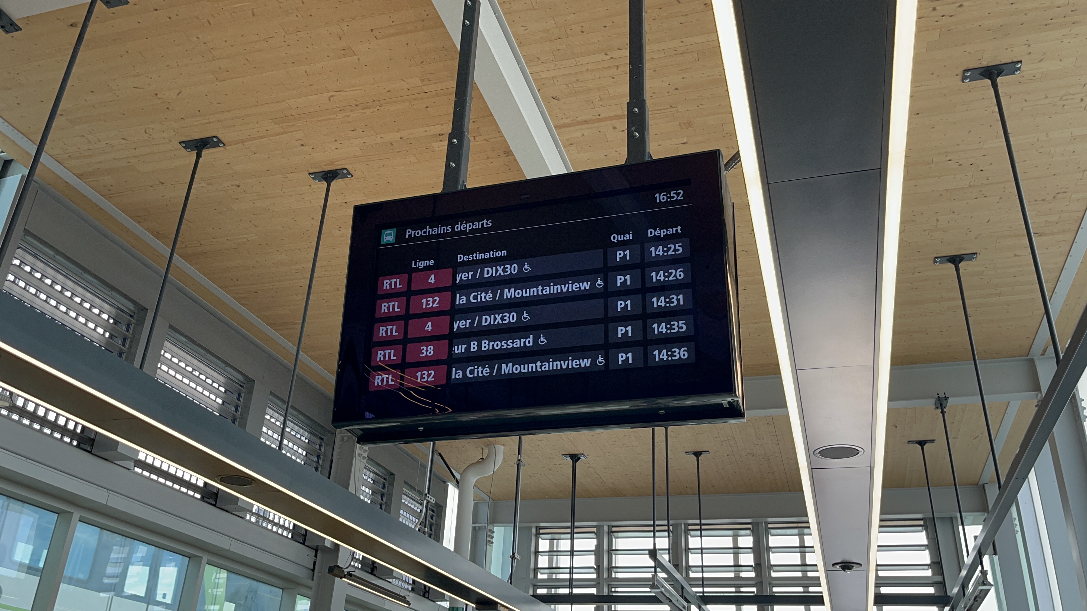 Certains écrans affichent désormais les départs des lignes des bus à proximité en alternance avec les départs du REM.