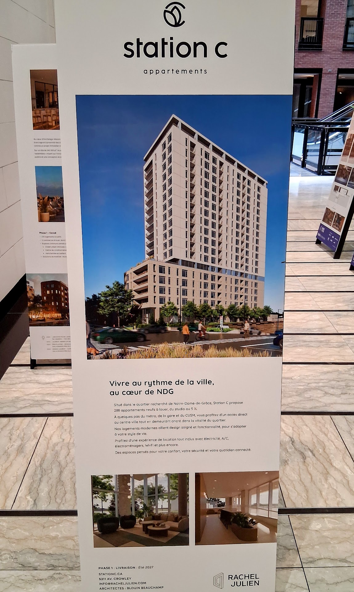 Station C est un projet de 288 logements locatifs, qui a bénéficié d’investissements de plus de 100 millions de dollars sous forme de prêts à faible taux d’intérêt du gouvernement du Canada. Le projet est conçu avec une vision axée sur le développement durable, mettant en avant des normes exemplaires d’accessibilité aux logements. Le bâtiment intègre des espaces communs attrayants, comme une cour intérieure verdoyante, un hall d’entrée double hauteur vitré avec un espace détente, une salle de conditionnement physique, un chalet urbain et une terrasse au toit. Situé tout près de la station de métro et de la gare Vendôme, Station C offrira un accès rapide et pratique au réseau de transport en commun.
