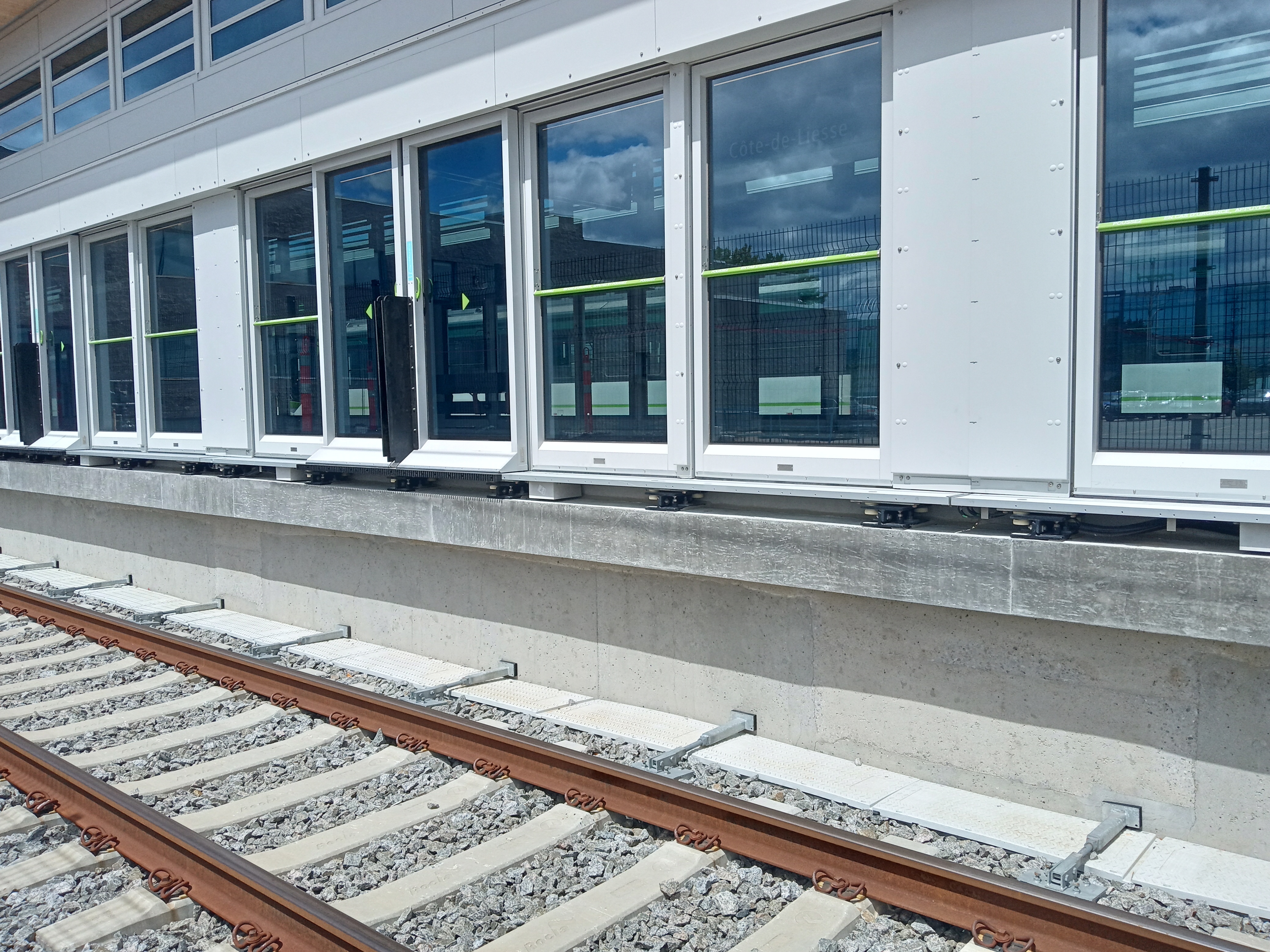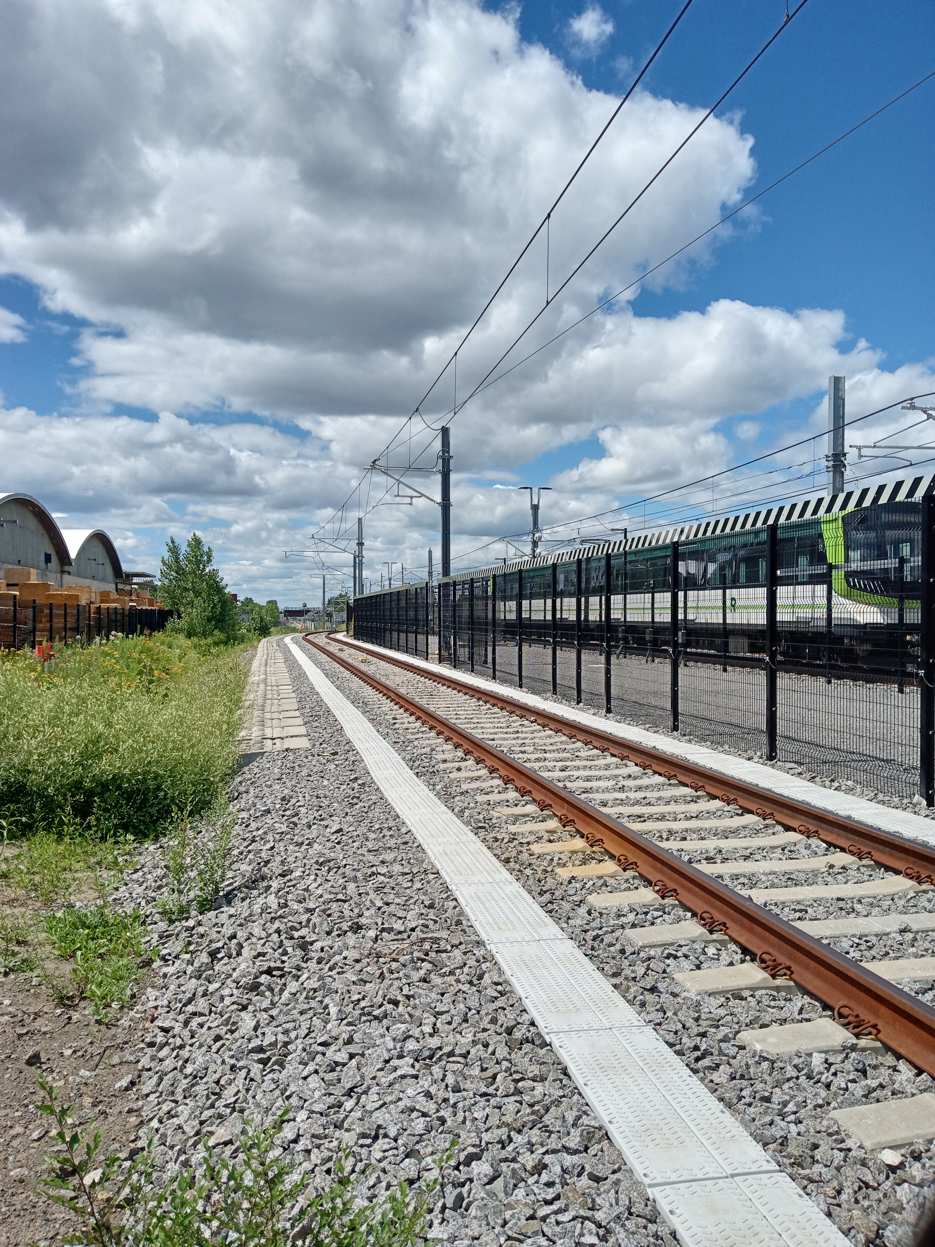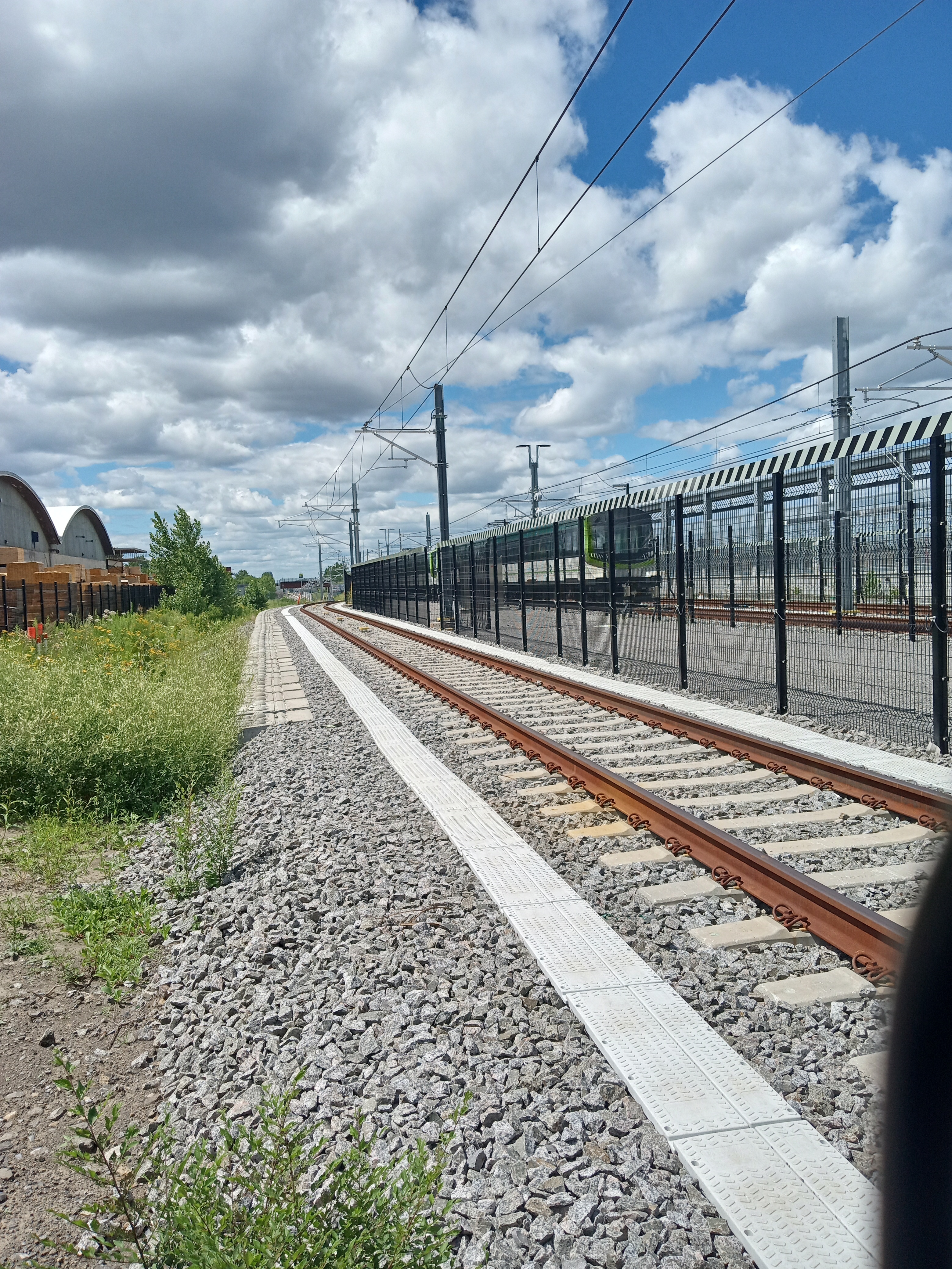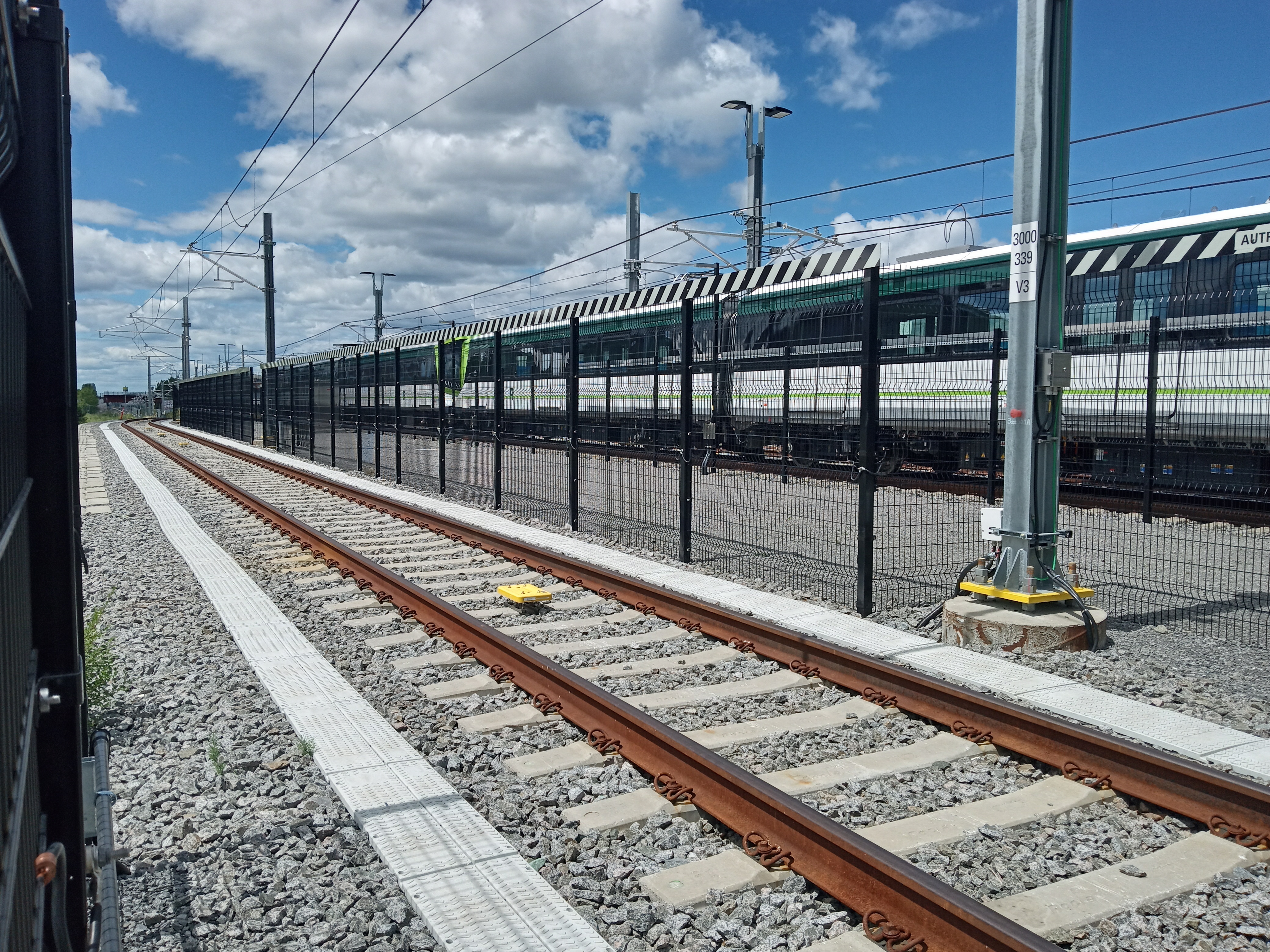 Puis, en ce qui concerne la clôture, ce n’est pas vraiment une clôture entre les voies, mais plutôt une clôture qui sépare l’aire d’assistance pour personnes en fauteuil roulant en cas d’évacuation, qui est situé entre les deux voies ici