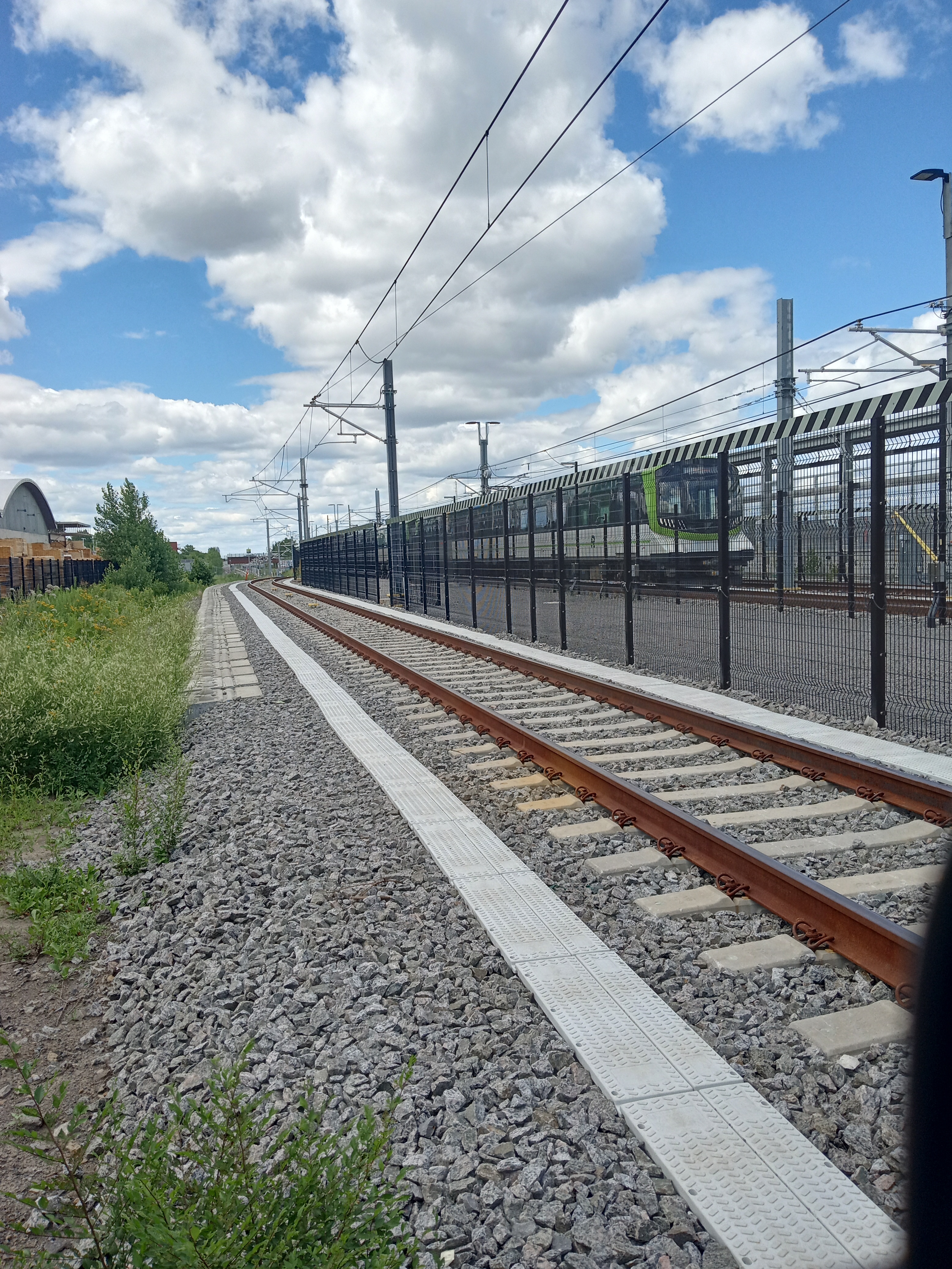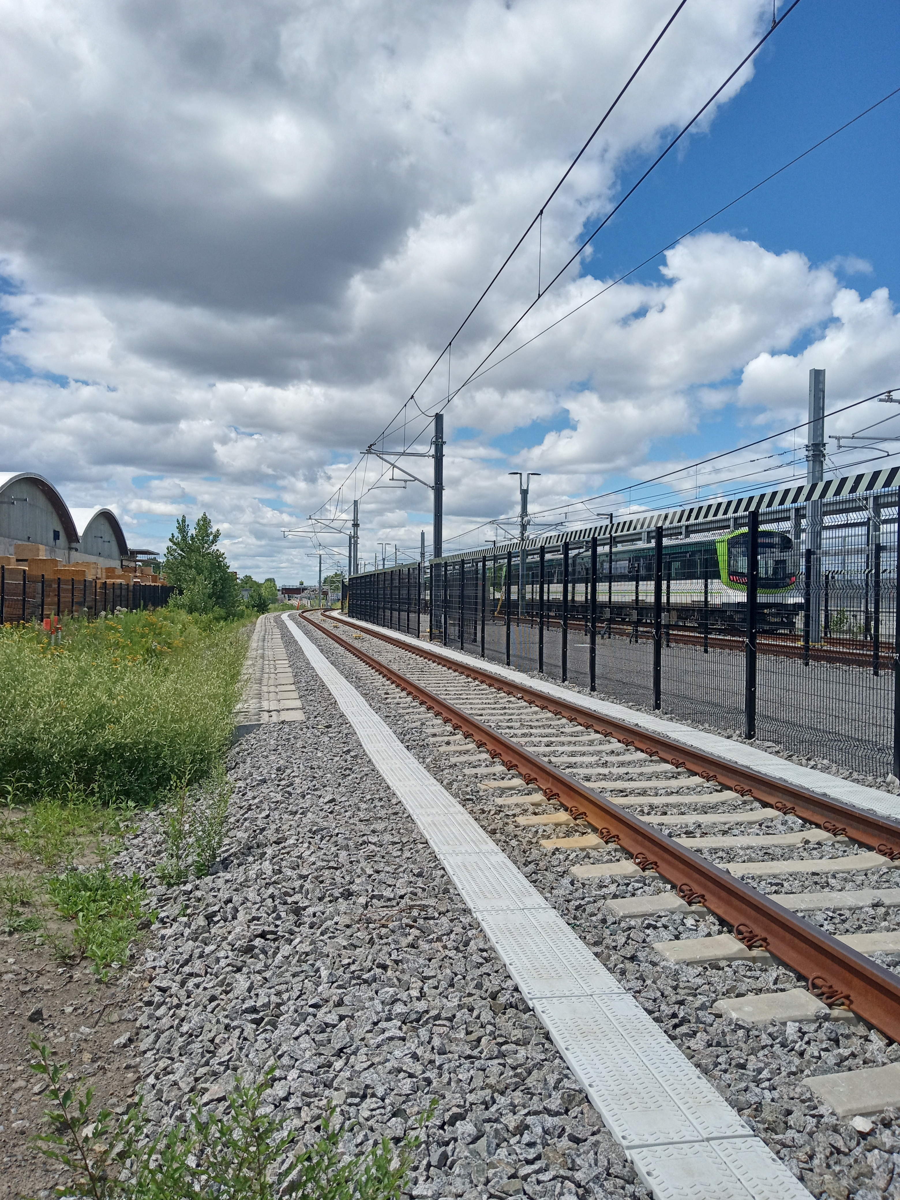 Est-ce que quelqu’un sait ce qui est écrit sur la pancarte blanc et orange sur le pylône de caténaire de droite?