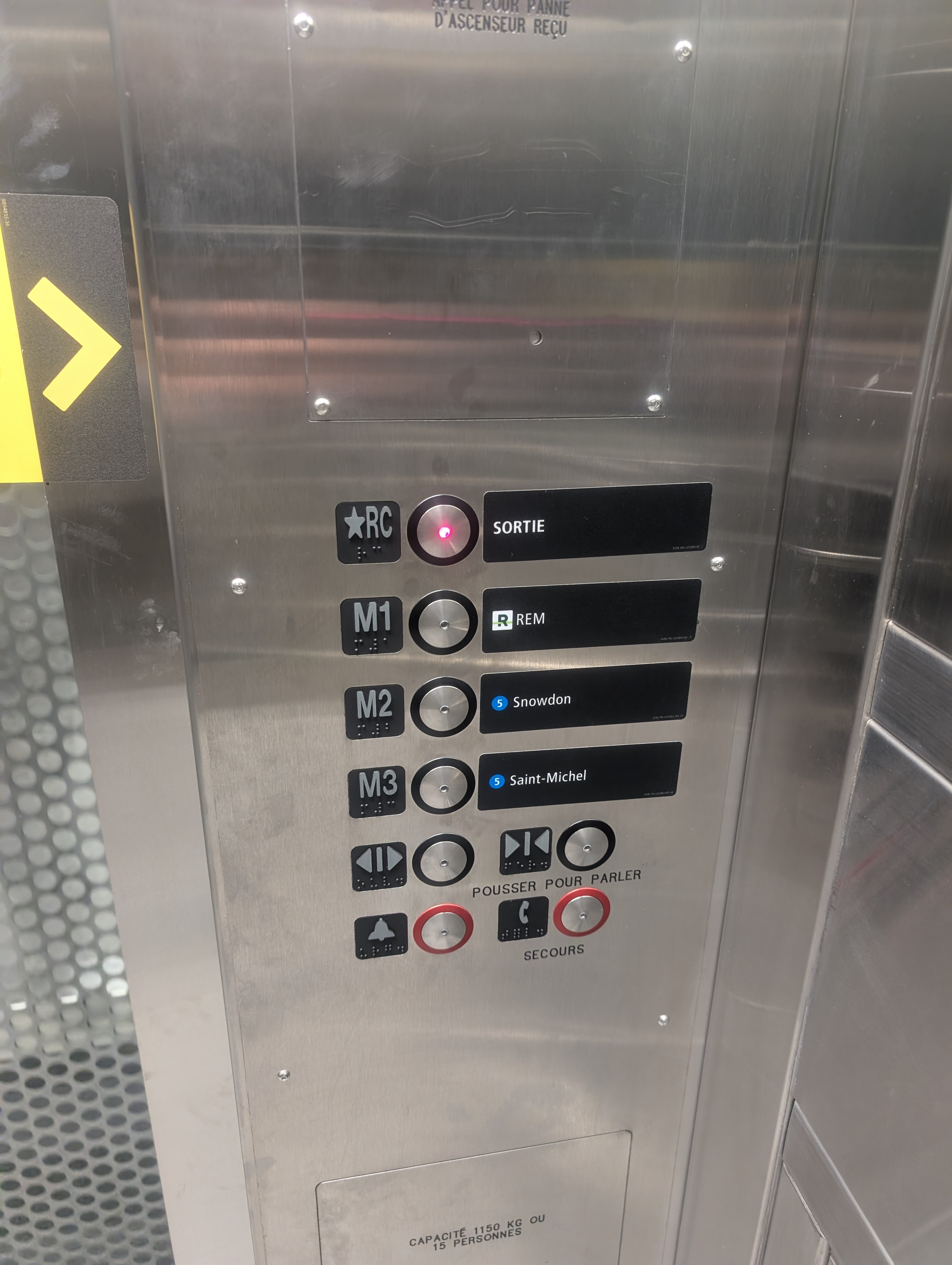 Les écrans au-dessus des ascenseurs haute-capacité de la station EM affichent beaucoup plus clairement la position des ascenseurs en tout temps, ainsi que la direction d’un ascenseur en mouvement. Il y a aussi un gros “ding” lorsque les portes s’ouvrent, en plus d’une annonce vocale (à volume un peu trop bas je trouve, personnellement) à l’intérieur de l’ascenseur pour annoncer l’étage.