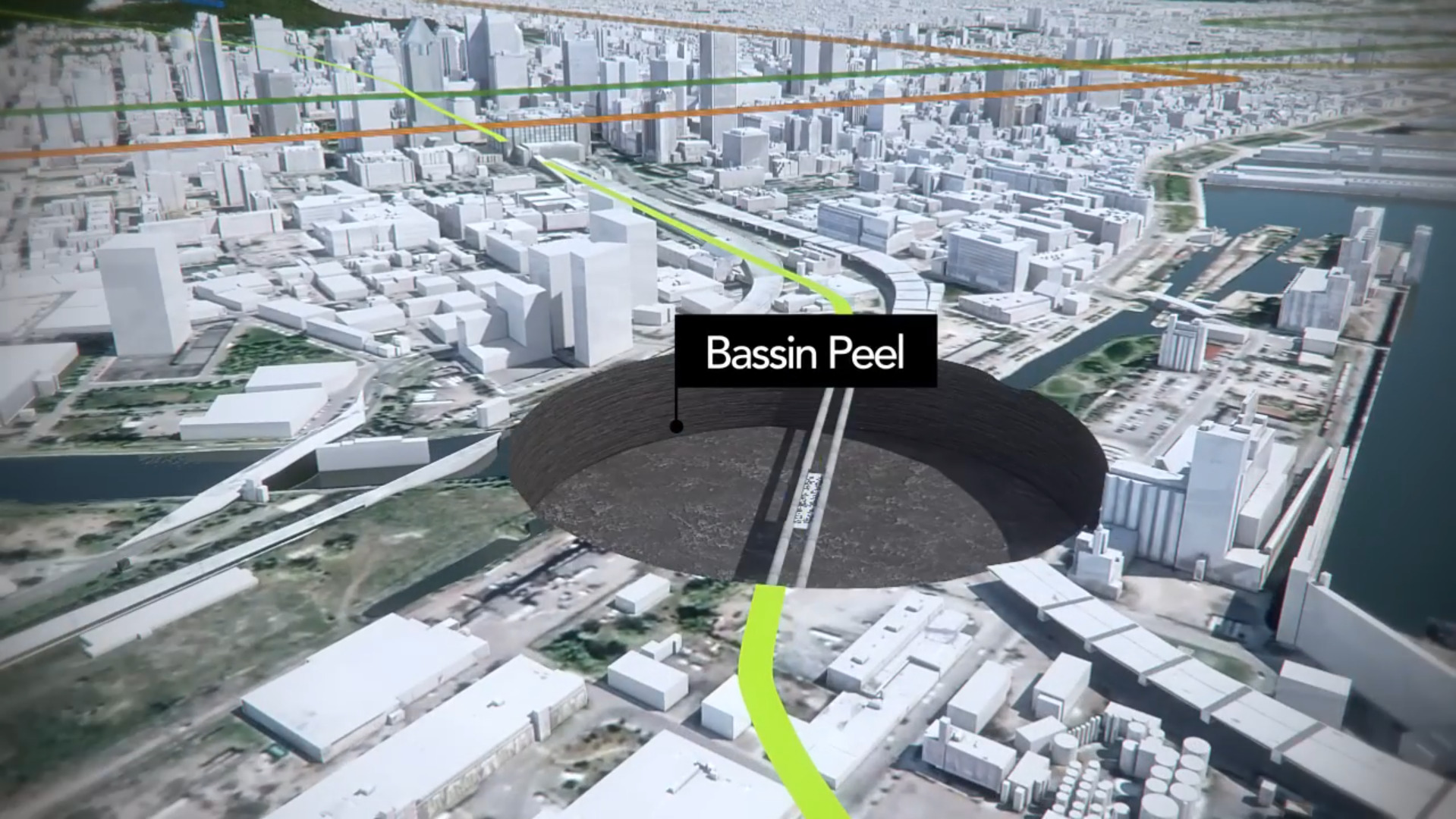 Bref si on avait amorcer la descente de la voie du rem plus au sud du canal plutôt que direct au dessus on aurait pu construire une station directement au dessus du canal et du bassin peel pour desservir en même temps les deux rives. Dans le même ordre d’idée qu’avais dit SAMetropolis.
