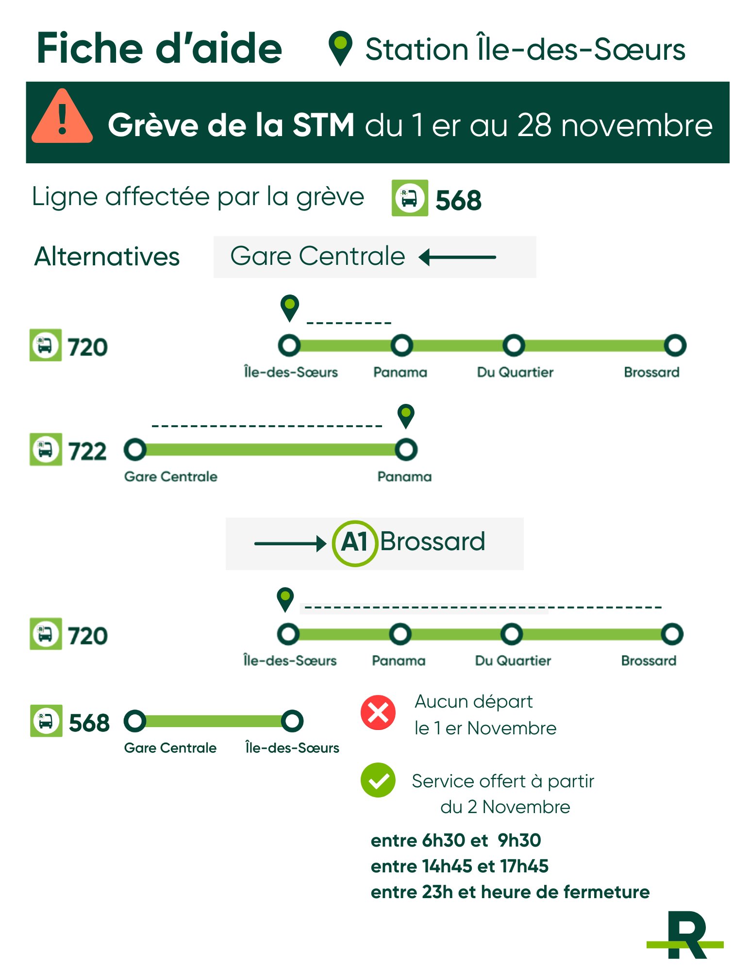 Important : En raison de la grève de la STM, le service de la navette 568 à l’Île-des-Sœurs sera perturbé. Pour connaître les options de transport disponibles en cas d’interruption, qu’elle soit planifiée ou imprévue, du service du REM, veuillez consulter la fiche d’aide ci-bas.