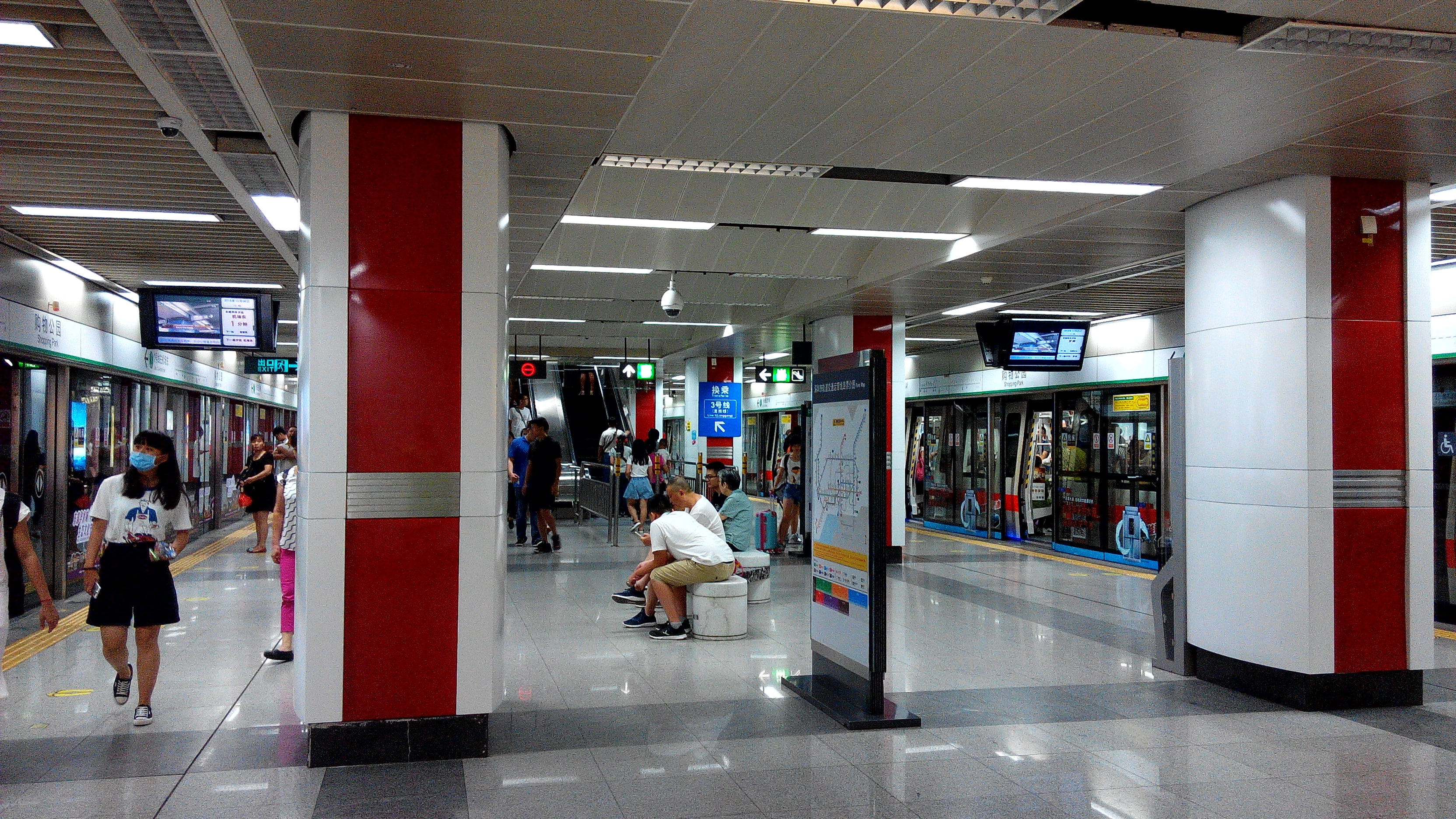 La station Shopping Park à Shenzhen sous un centre commercial ressemble beaucoup pour l’aspect encastré mais elle a un quai central avec des escaliers directs.