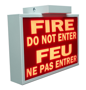 Je crois que c’est une affiche qui dit «Feu, ne pas entrer», et qui s’allume si il y a une alarme dans le bâtiment. C’est une affiche qui est mise en place quand une issue implique de passer par un autre bâtiment.