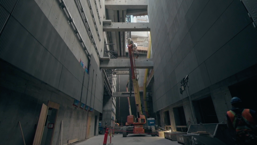 Pour accéder au point de vue, il faut se rendre à l’étage le plus élevé du stationnement étagé et il y a quelques fenêtres pour voir le chantier.