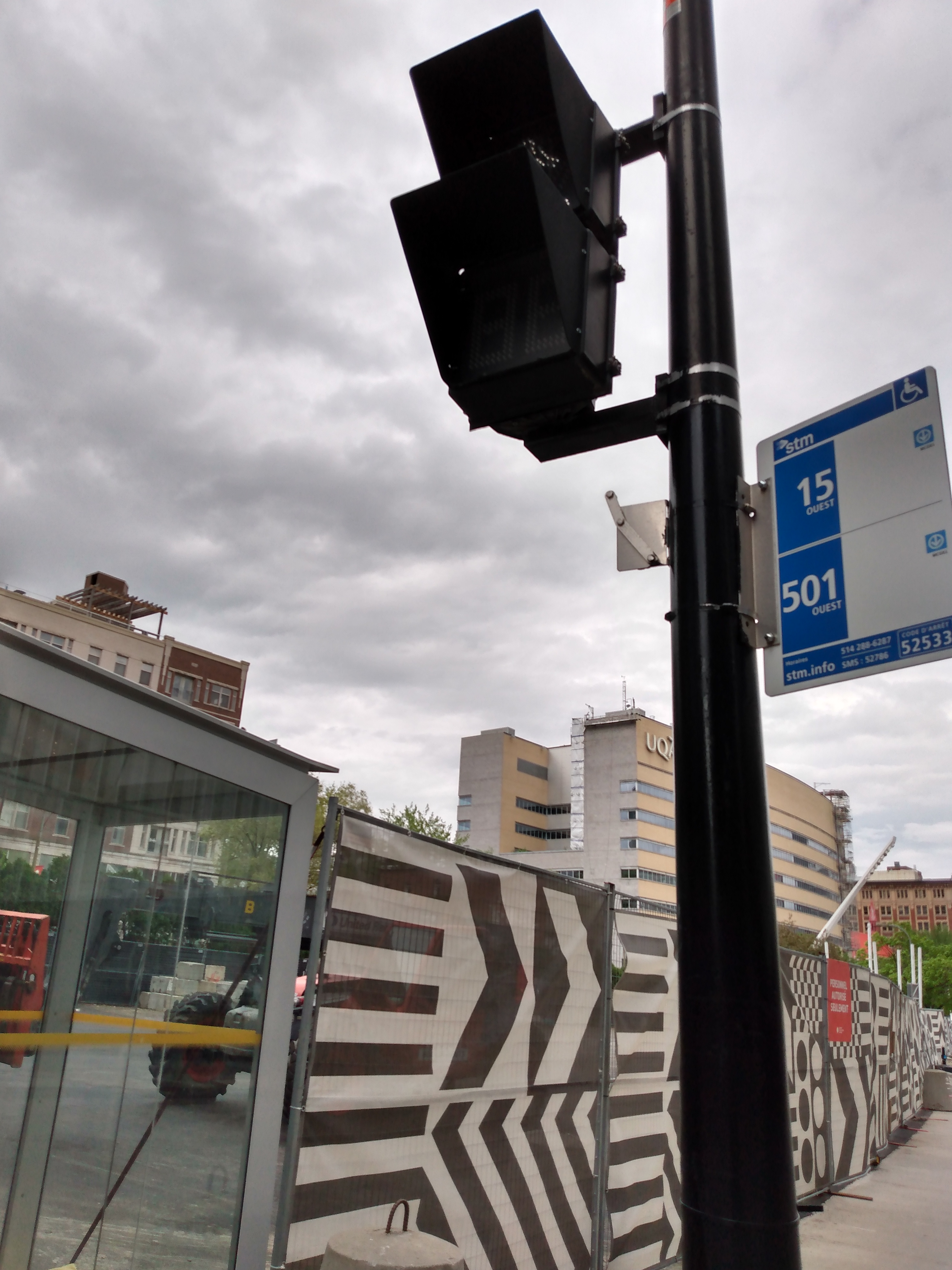 La STM n’est pas venue chercher son arrêt surréaliste et l’abribus au coin de Maisonneuve et Bleury. Les deux ne servent plus depuis des mois.