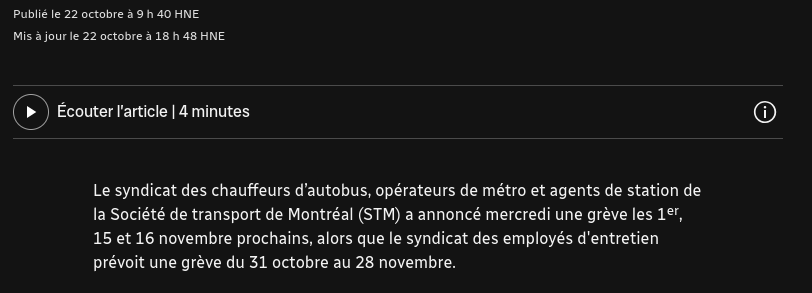 Mais surtout, la question des salaires n’est pas encore réglée. La STM offre une hausse de 12,5 % sur cinq ans, dont 1 % dépend de l’Indice des prix à la consommation (IPC). Or, d’après le syndicat, les salaires n’augmentent pas assez vite par rapport au reste de l’industrie. Les employés du Réseau de transport de la Capitale (RTC), par exemple, ont obtenu des hausses de 18 %.