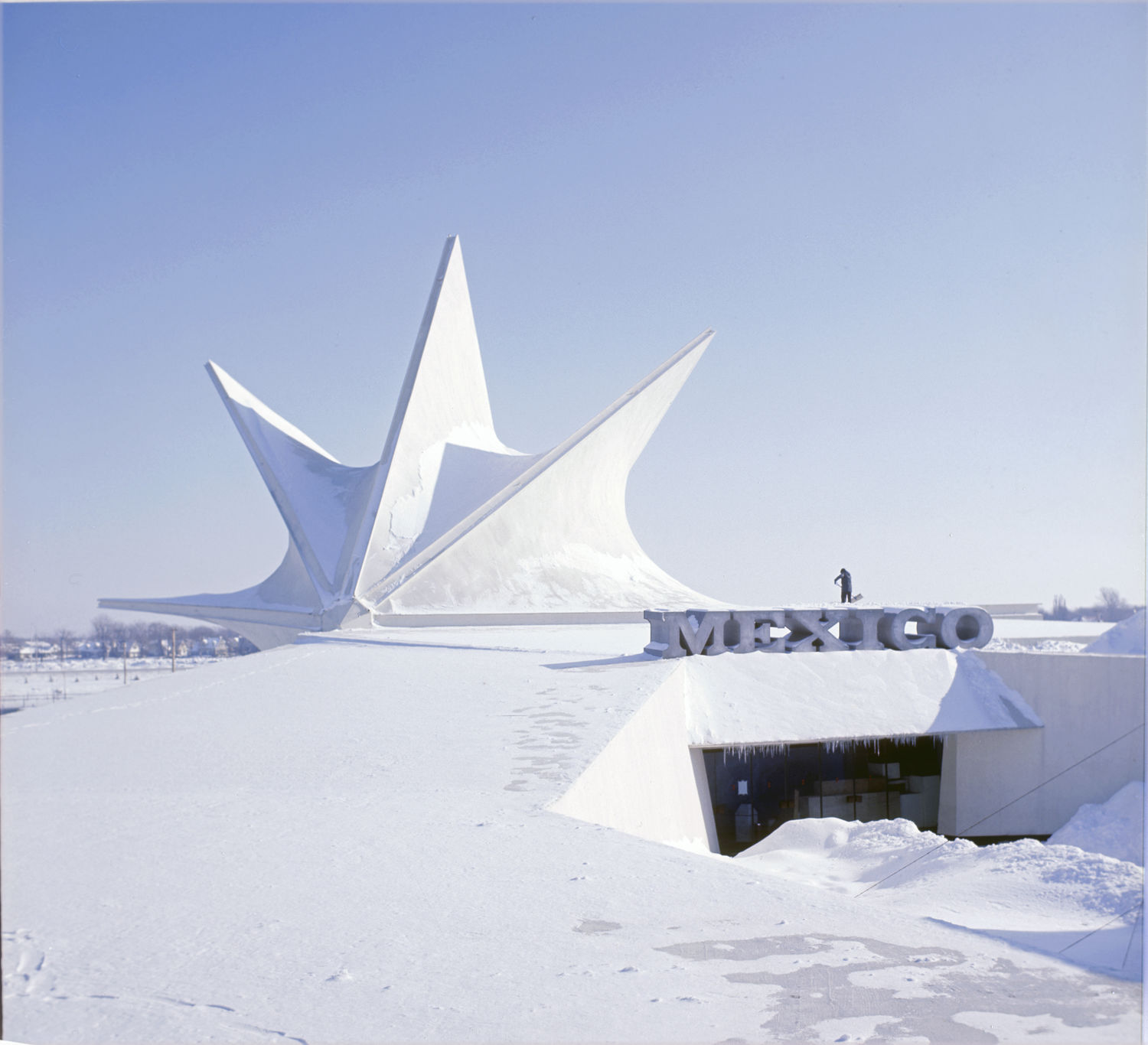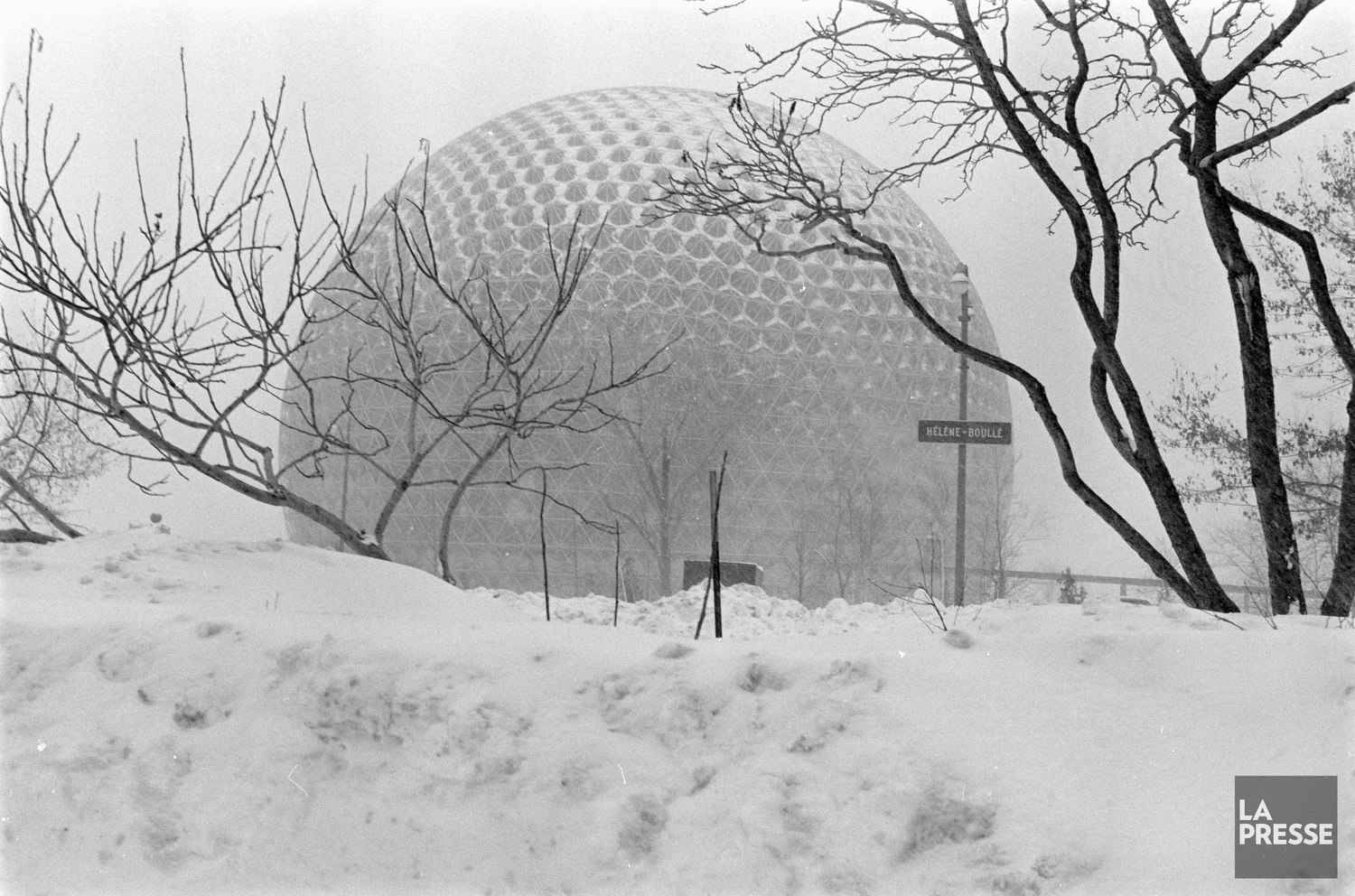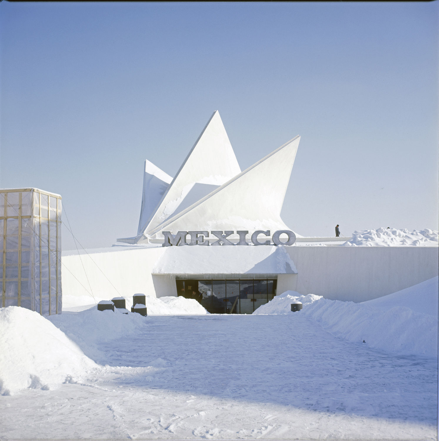 Les pavillons d’Accueil, du Mexique et des Pays-Bas sous la neige à l’hiver 1968.