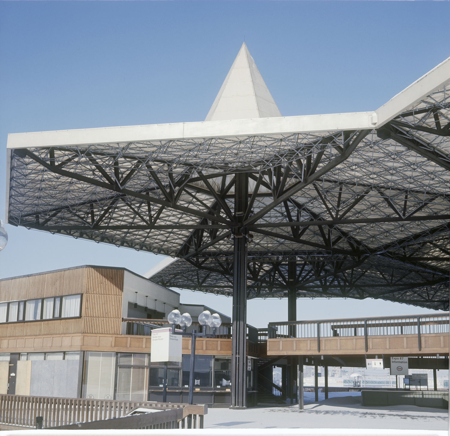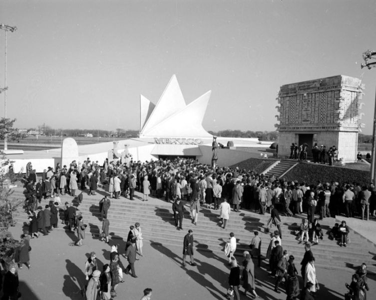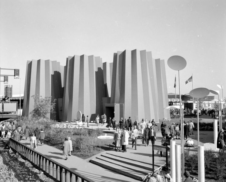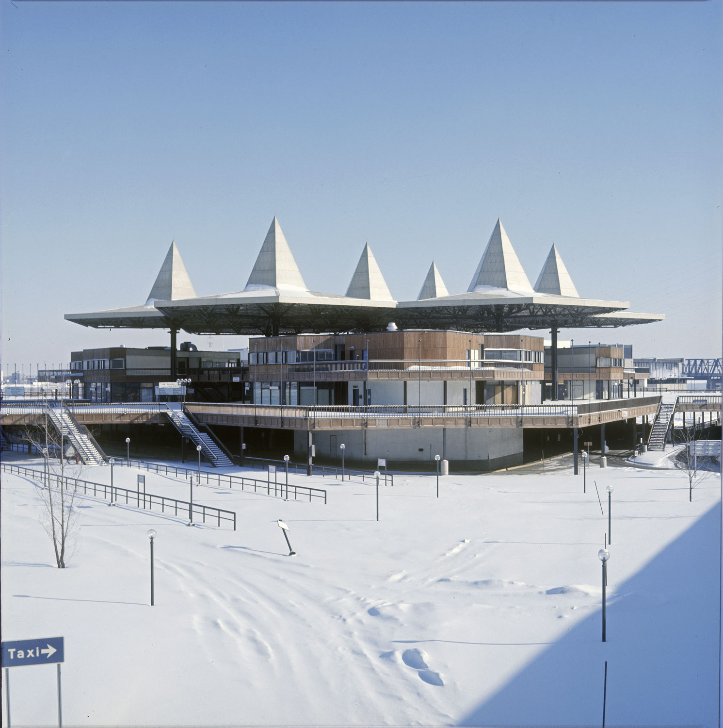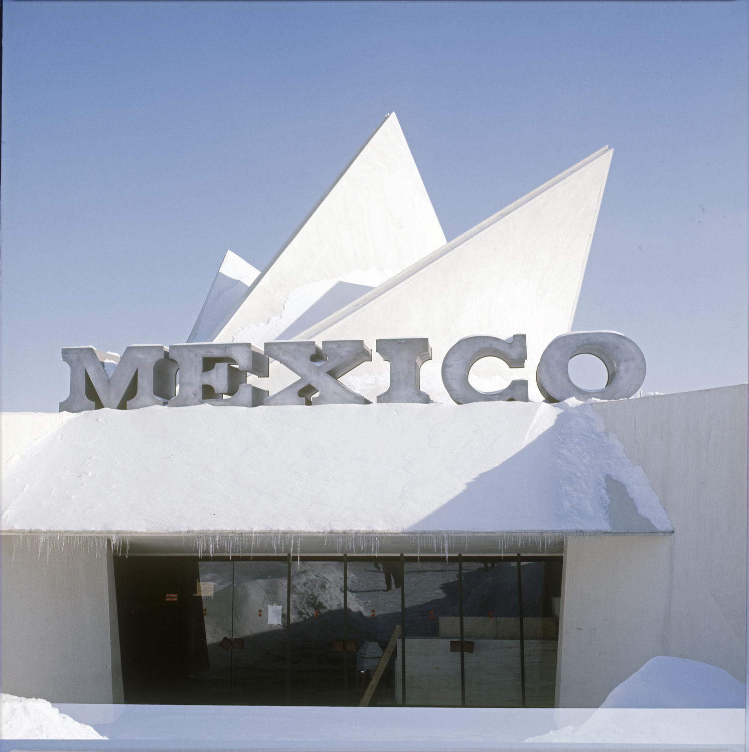 Les pavillons d’Accueil, du Mexique et des Pays-Bas sous la neige à l’hiver 1968.