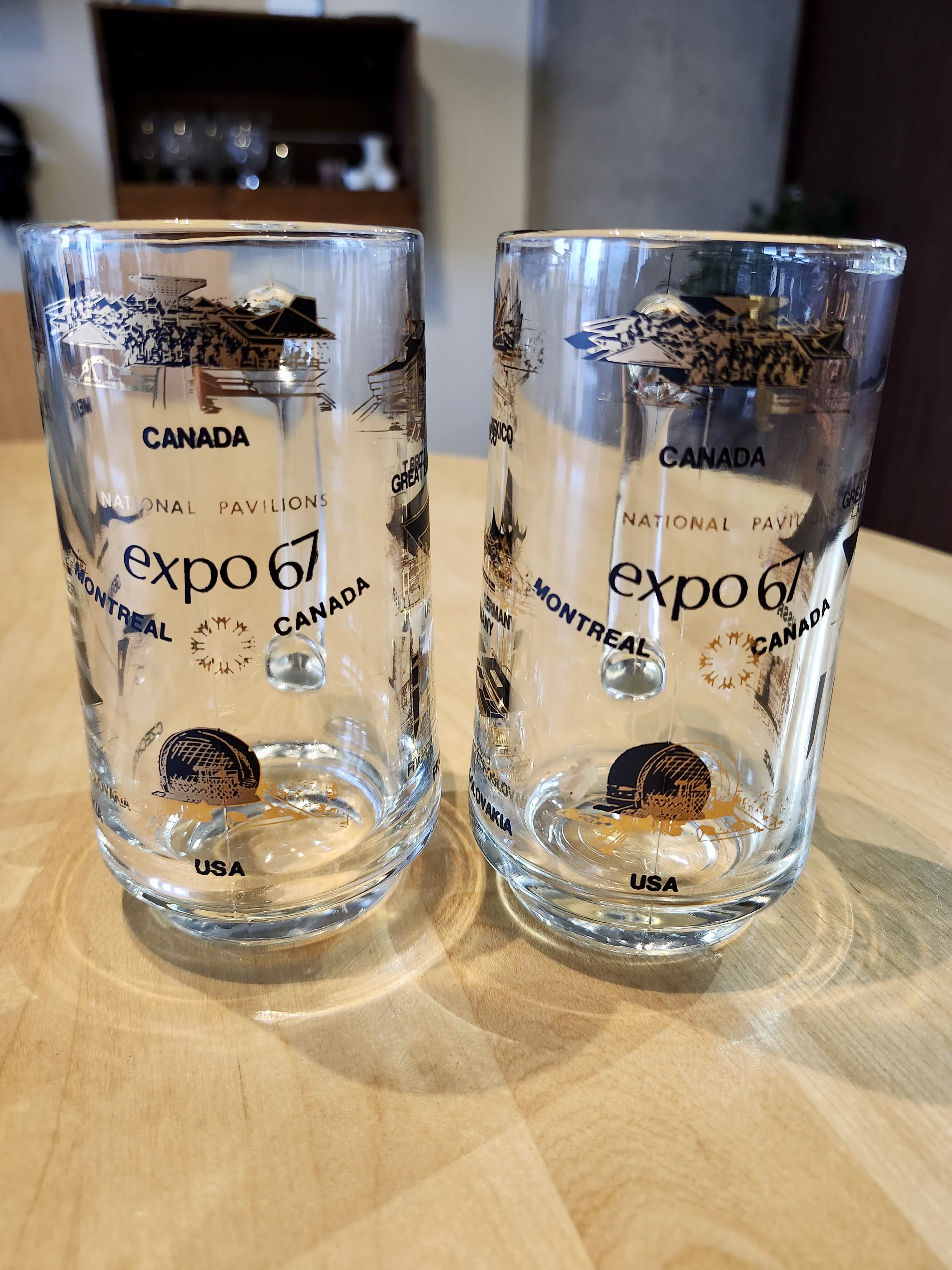 Petite trouvaille Expo 67, des verres à bière. J’aime bien comment l’impression dorée est plus ou moins décalée de la couche du fond noir. ![]()