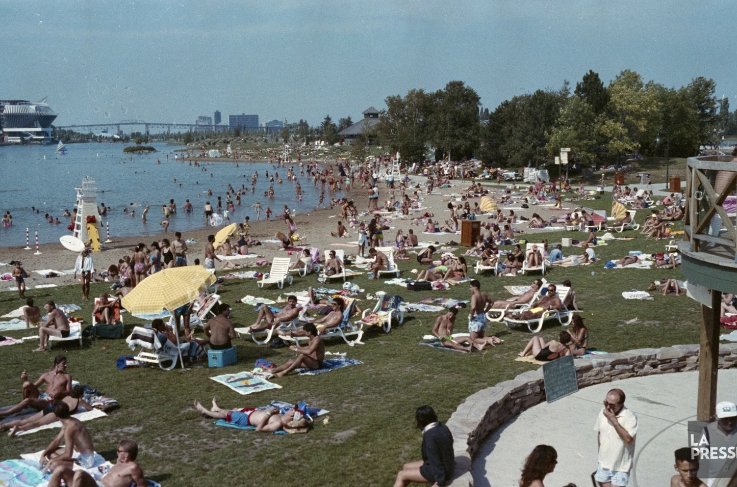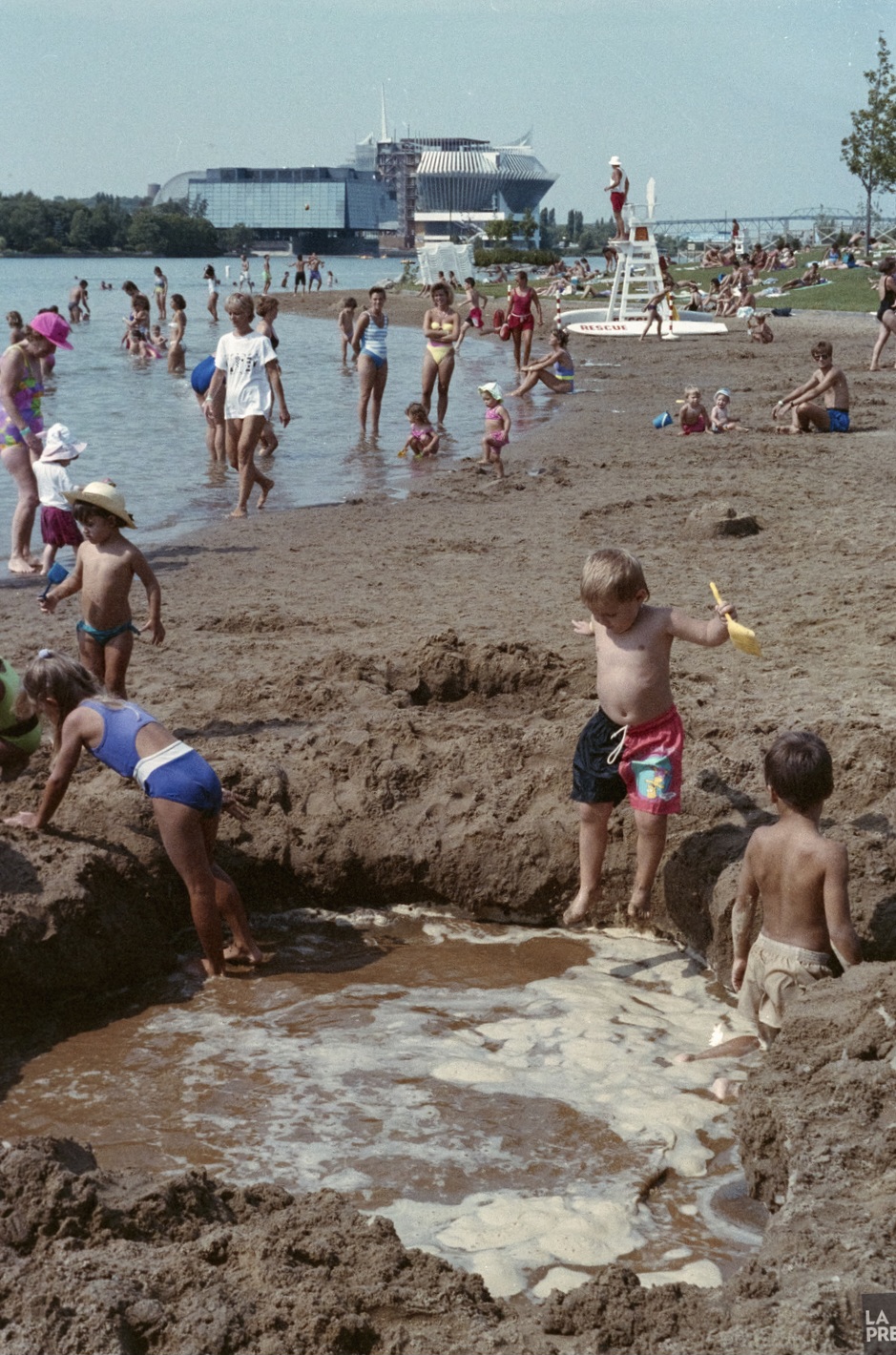 On s’amuse à la Plage Doré en 1991. Le pavillon du Québec était encore à cette époque dans sa forme et couleur originale, et le pavillon de la France avait un étage de moins.