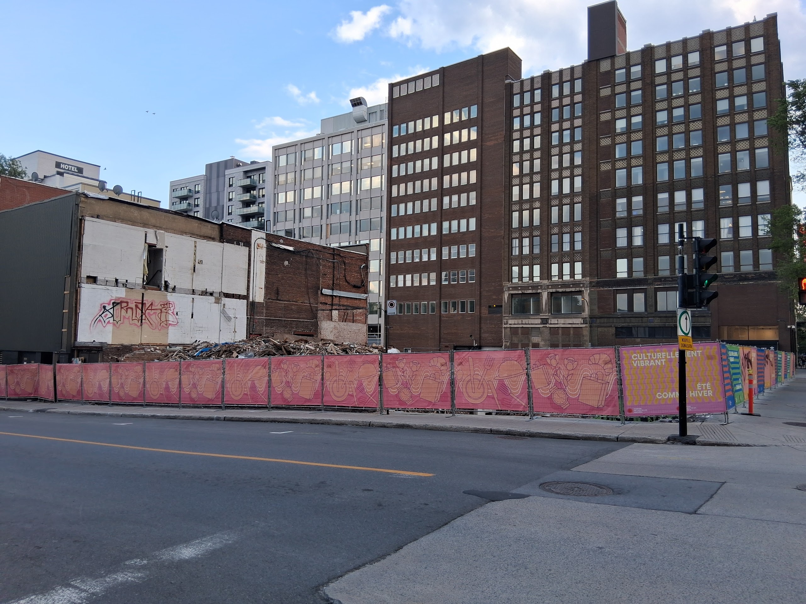 Quel est l’enjeu actuel? La démolition a été stoppée nette il y a plus de 60 jours et les résidus inachevés et empilés sont toujours sur le site dans l’état d’il y a 2 mois. Le Quartier des Spectacles a même mis une banderole colorée sur les clôtures pour cacher le chantier inactif. Il y a sûrement des gens bien placés qui sont au courant ![]()