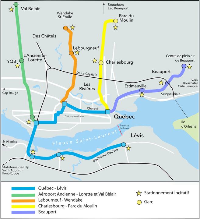 D’une longueur de 74 kilomètres et doté de 13 gares et autant de stationnements incitatifs, le réseau permettrait de rejoindre Beauport, Charlesbourg, Lebourgneuf, Wendake, Val-Bélair et L’Ancienne-Lorette, en passant par l’aéroport. Le tracé central relierait Lévis à la colline parlementaire via le pont de Québec, empruntant les boulevards Guillaume-Couture, Charest et Laurier, en passant par la Cité-Universitaire.