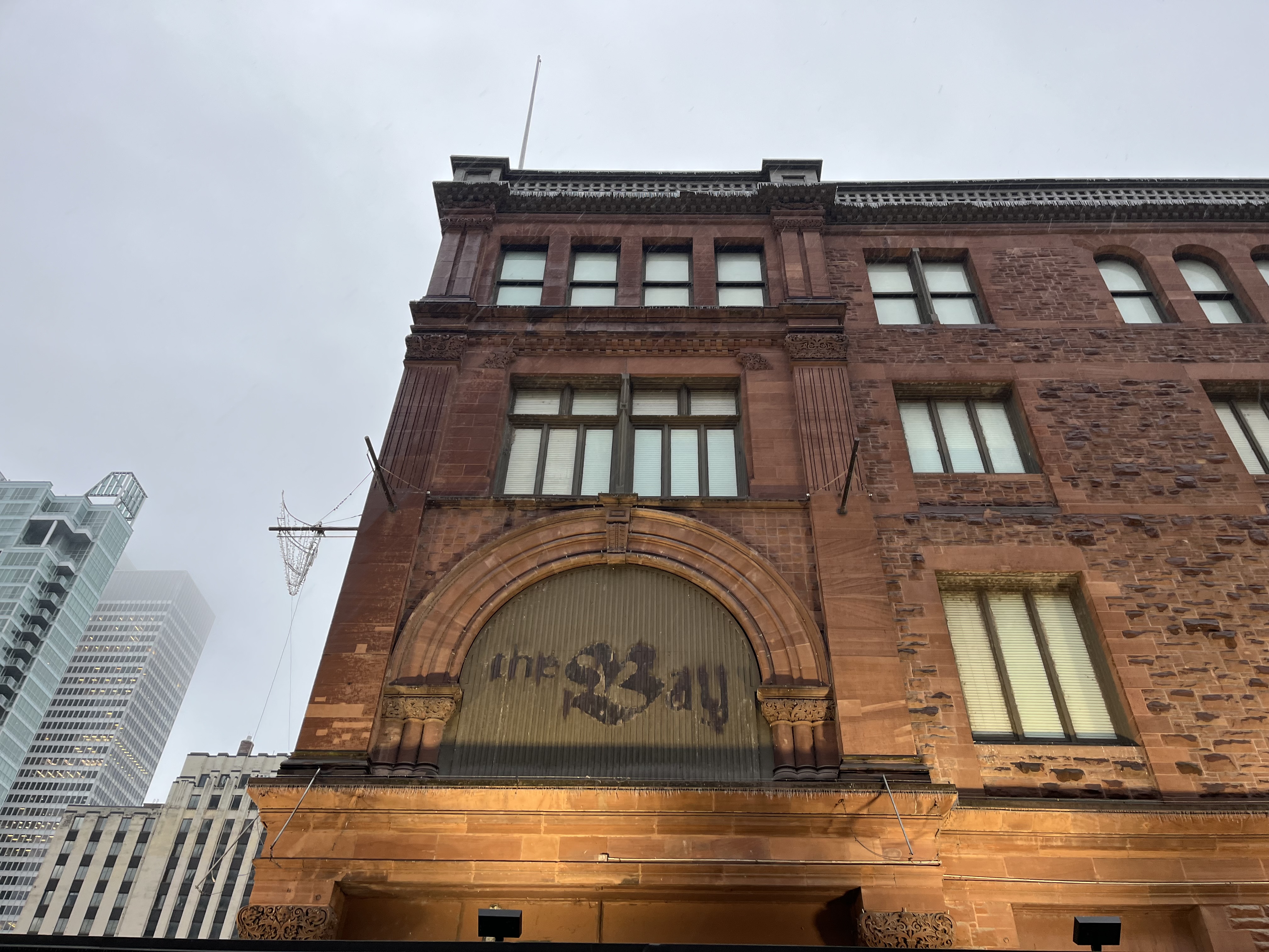 Il reste maintenant trois enseignes: les petites lettres au sommet du bâtiment et deux autres inscriptions à l’arrière. La plus importante, l’inscription « Compagnie de la Baie d’Hudson » tout en haut, était prévue pour demain (jeudi 12 mars), mais à cause de la pluie verglaçante, l’opération pourrait être reportée à vendredi ou plus tard.