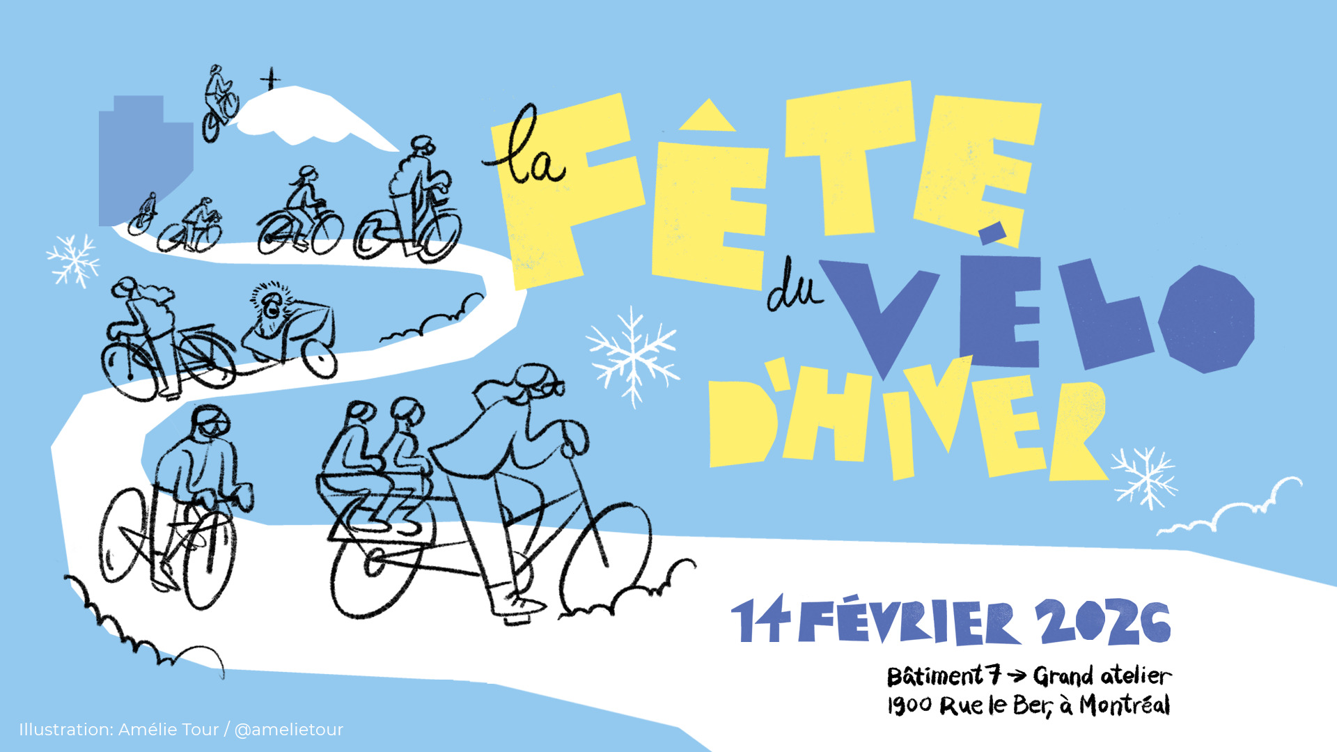 Montréal ! La neige est arrivée et le 14 février affichons notre amour pour le mode de transport qui embrasse notre nordicité… Inscrivez-vous à la Fête du Vélo d’Hiver c’est GRATUIT *