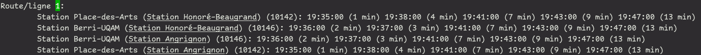 Here is a screenshot of a GTFS timetable program I am working on, showing Ligne 1 - Verte at Station Place-des-Arts et Berri-UQAM. The underlined text is the headsign of the route.