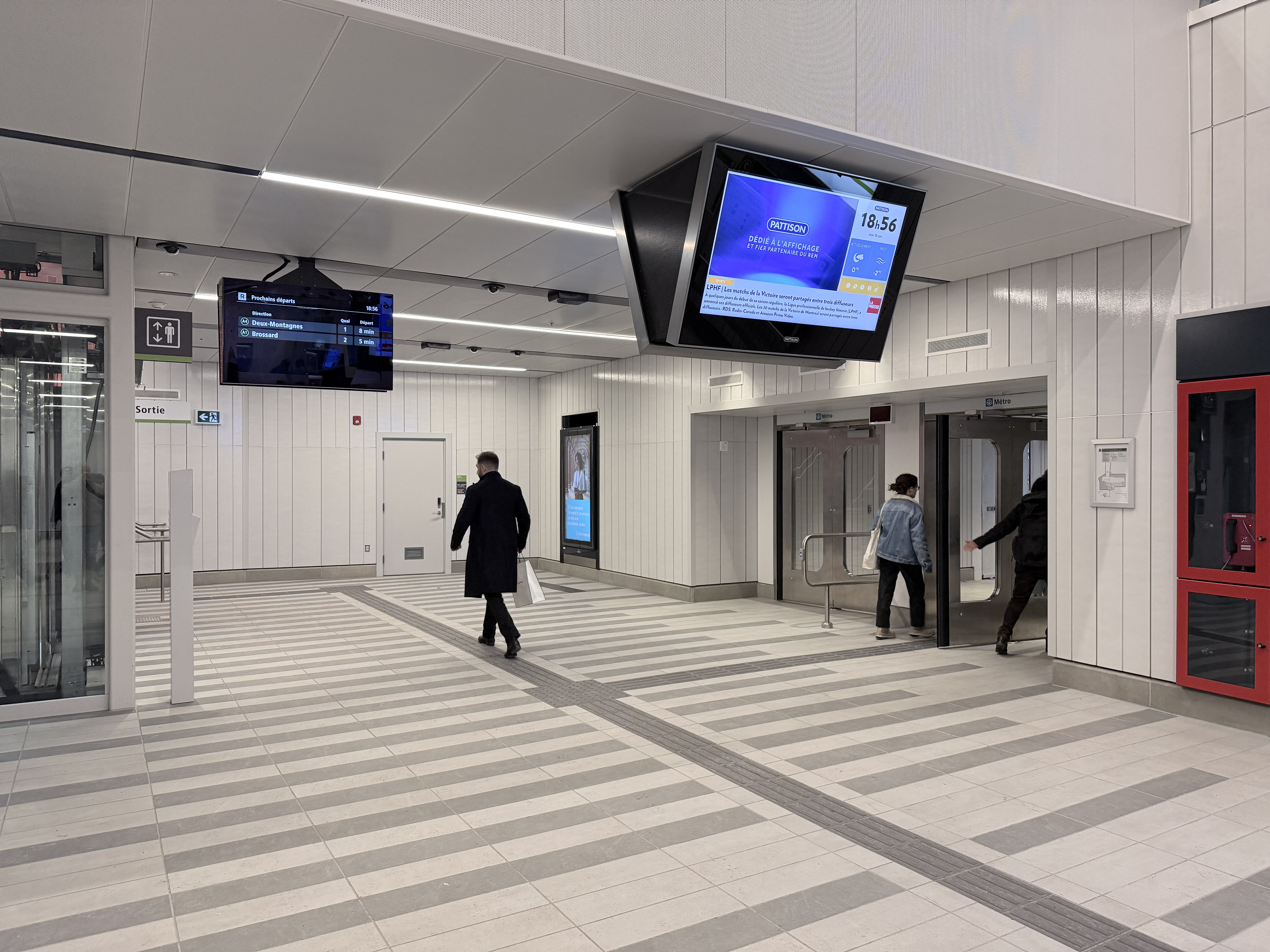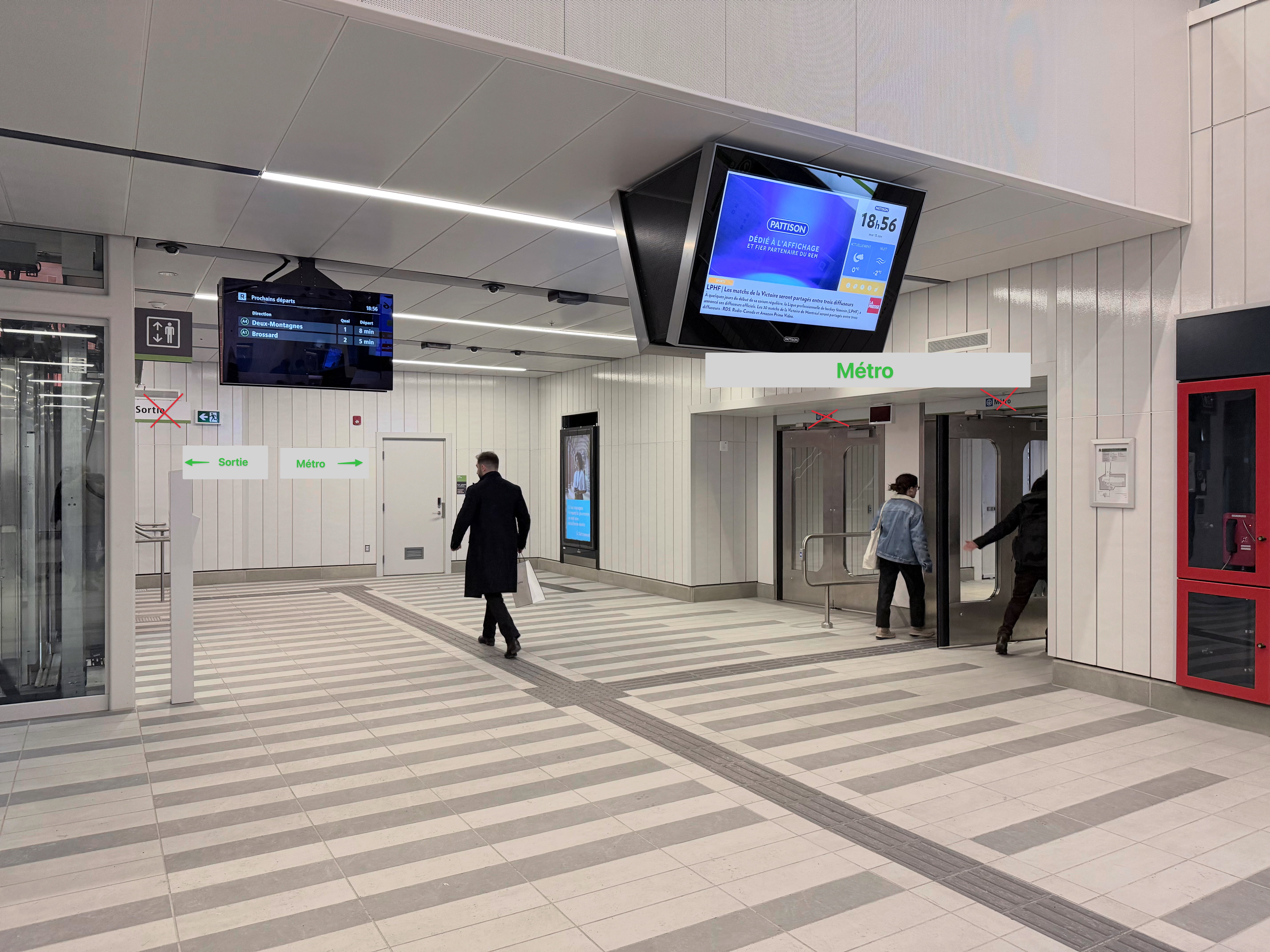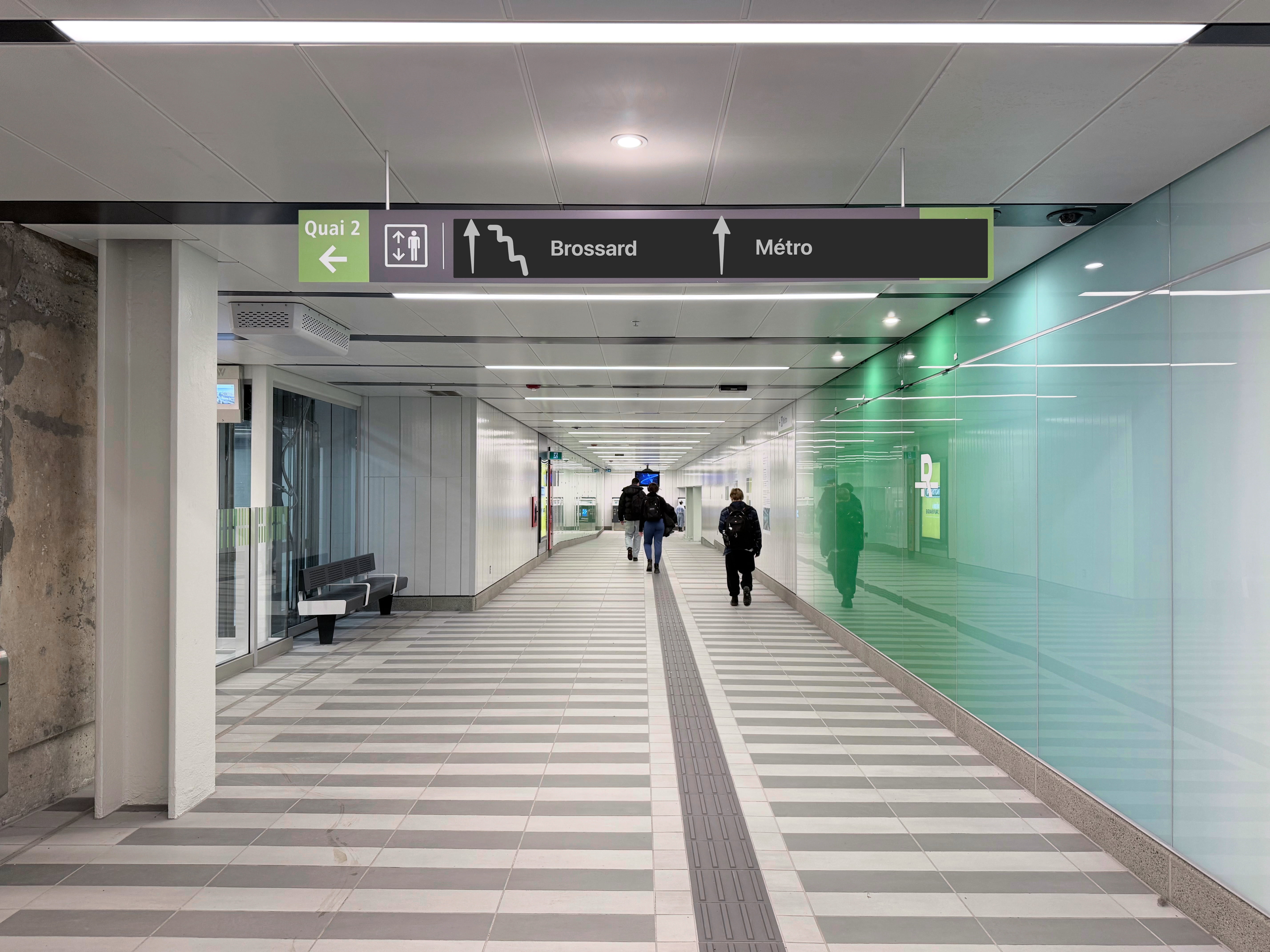 À la station REM Édouard-Montpetit, la signalétique pour effectuer la correspondance vers le métro est trop petite et n’est pas dans le champ de vision lorsqu’on sort des ascenseurs.