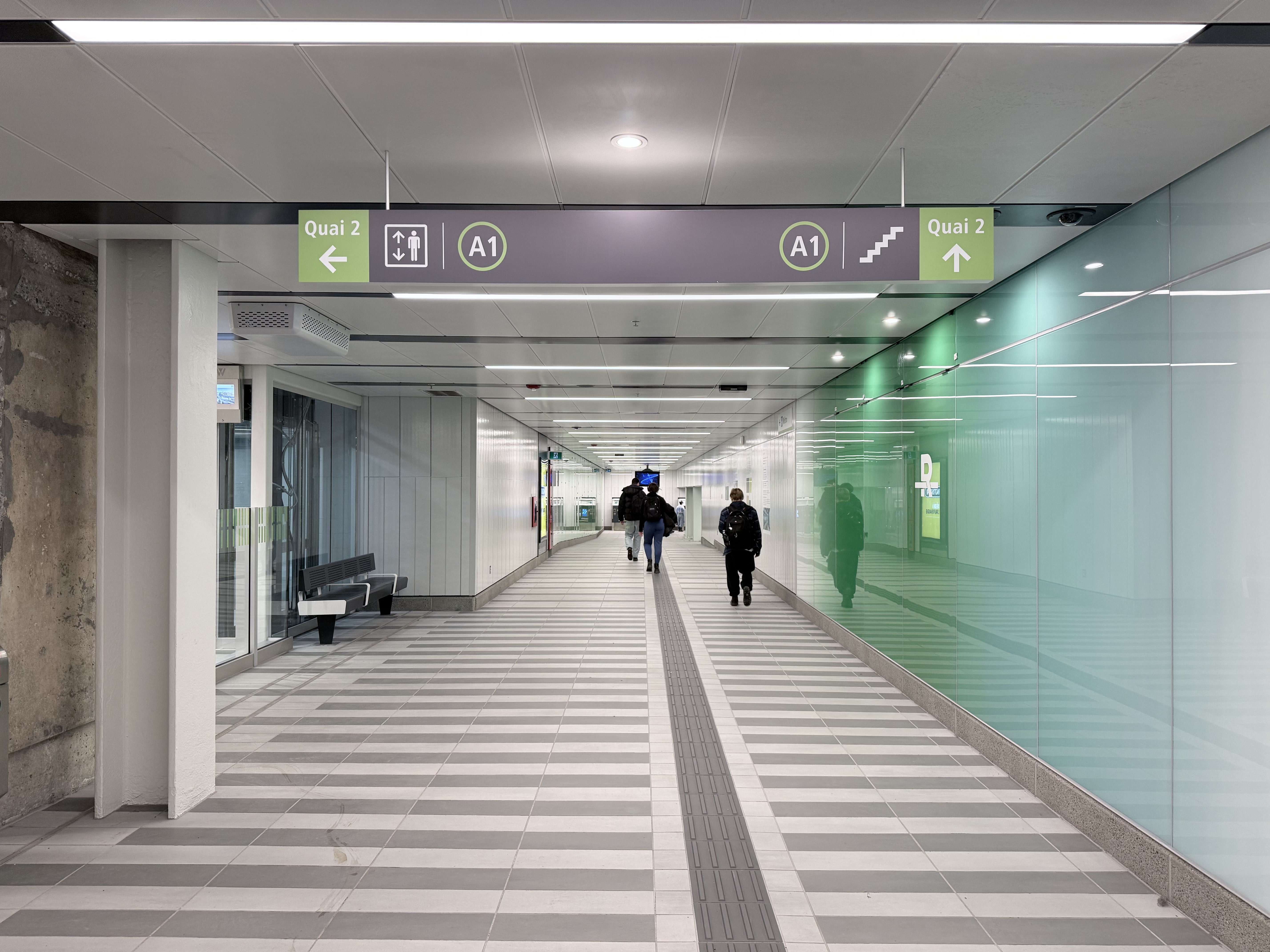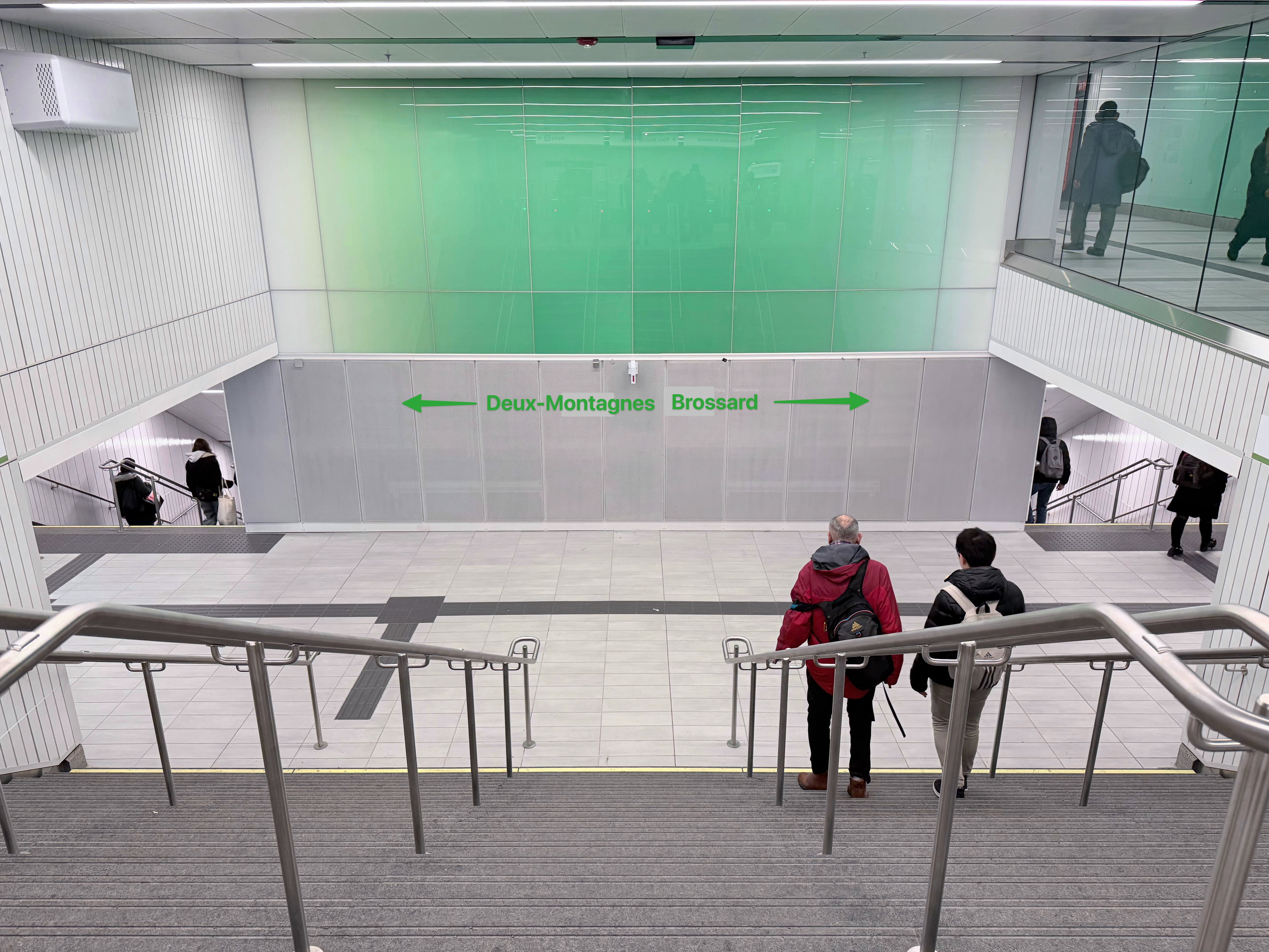 À la station REM McGill, la signalétique affiche les directions avec les codes au lieu des destinations, ce qui rend les usagers confus. Il n’y a pas assez de signalétique pour faire la correspondance avec le métro. EDIT - Ici, l’accès aux escaliers donne accès à toutes les directions. À corriger.