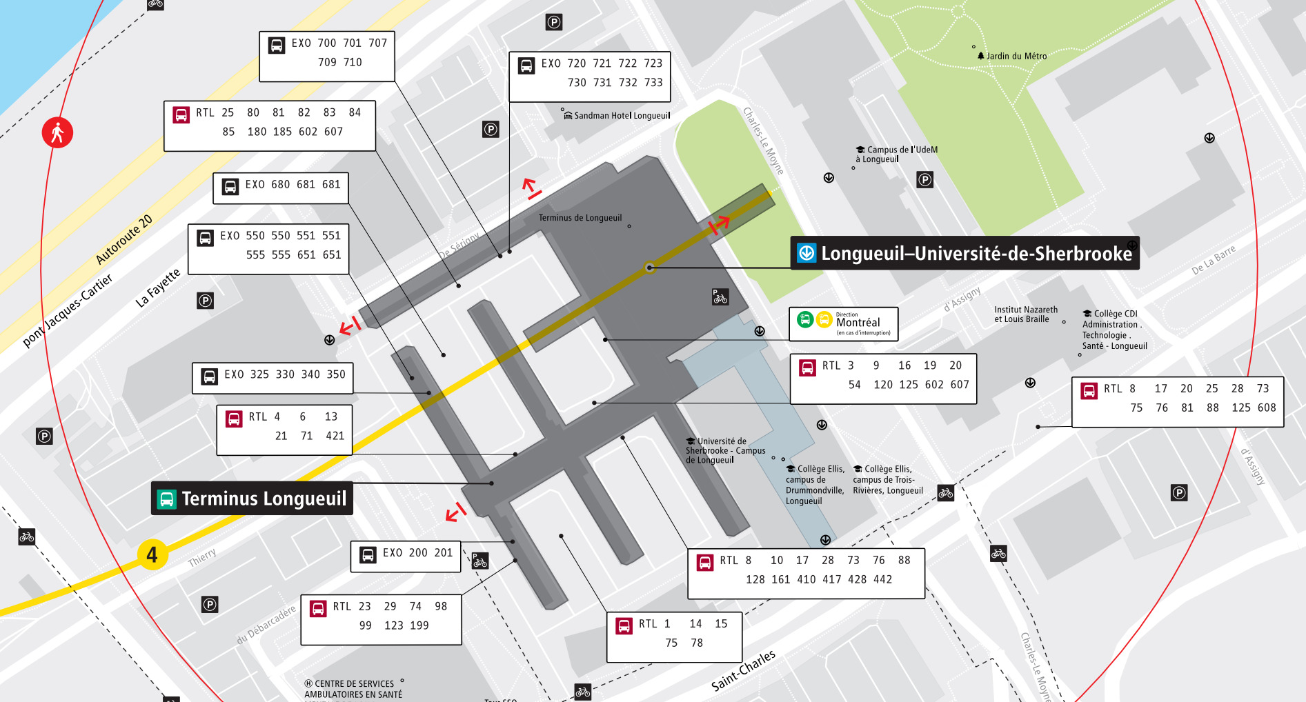 Le plan de quartier de la station Longueuil manque les lignes d’autobus STC Pierre-de-Saurel.