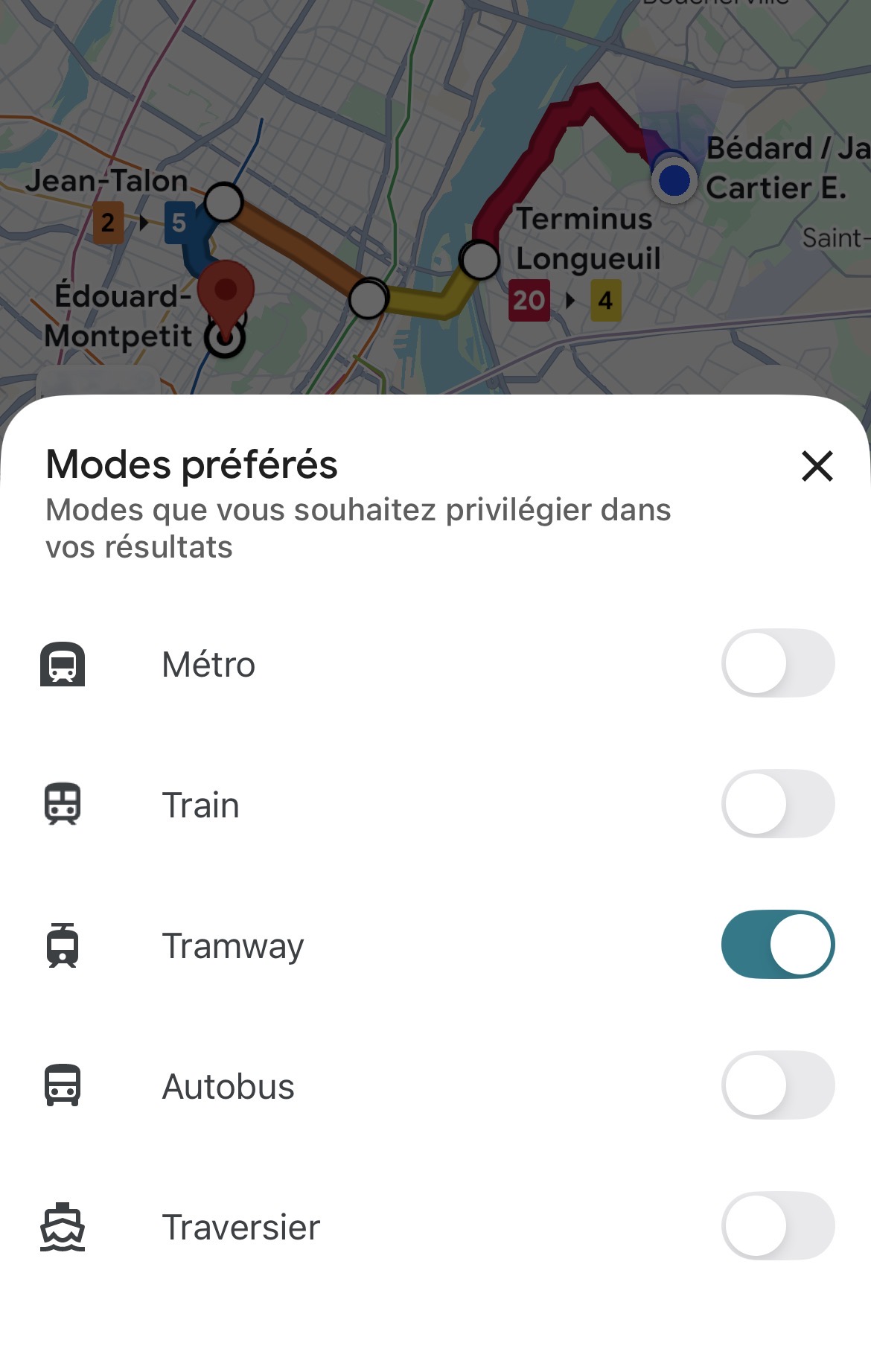 Je sais pas si Google se fie aux moyens de transport locaux mais… heille! On peut indiquer vouloir privilégier le tramway!
