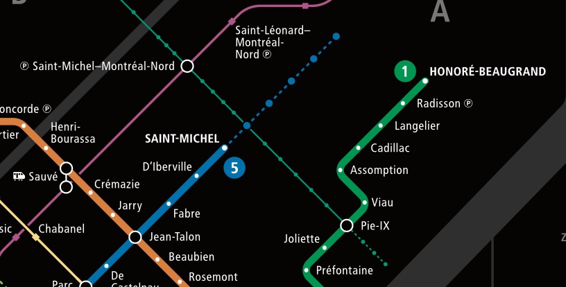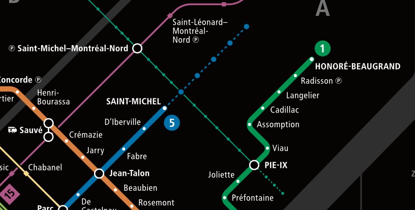 The green line on the eastern end has been adjusted, to have the dot at the end of the line, instead of the side. We also see the terminus of the SRB being Pie-IX, because it’s all capitals: