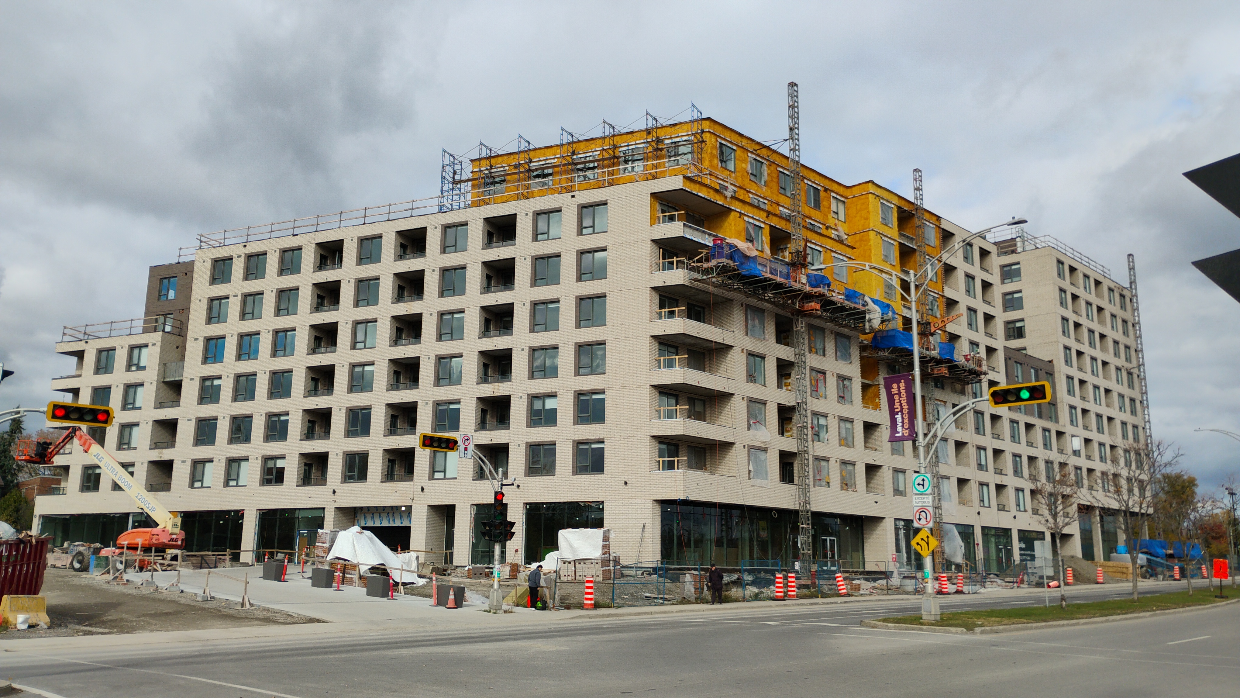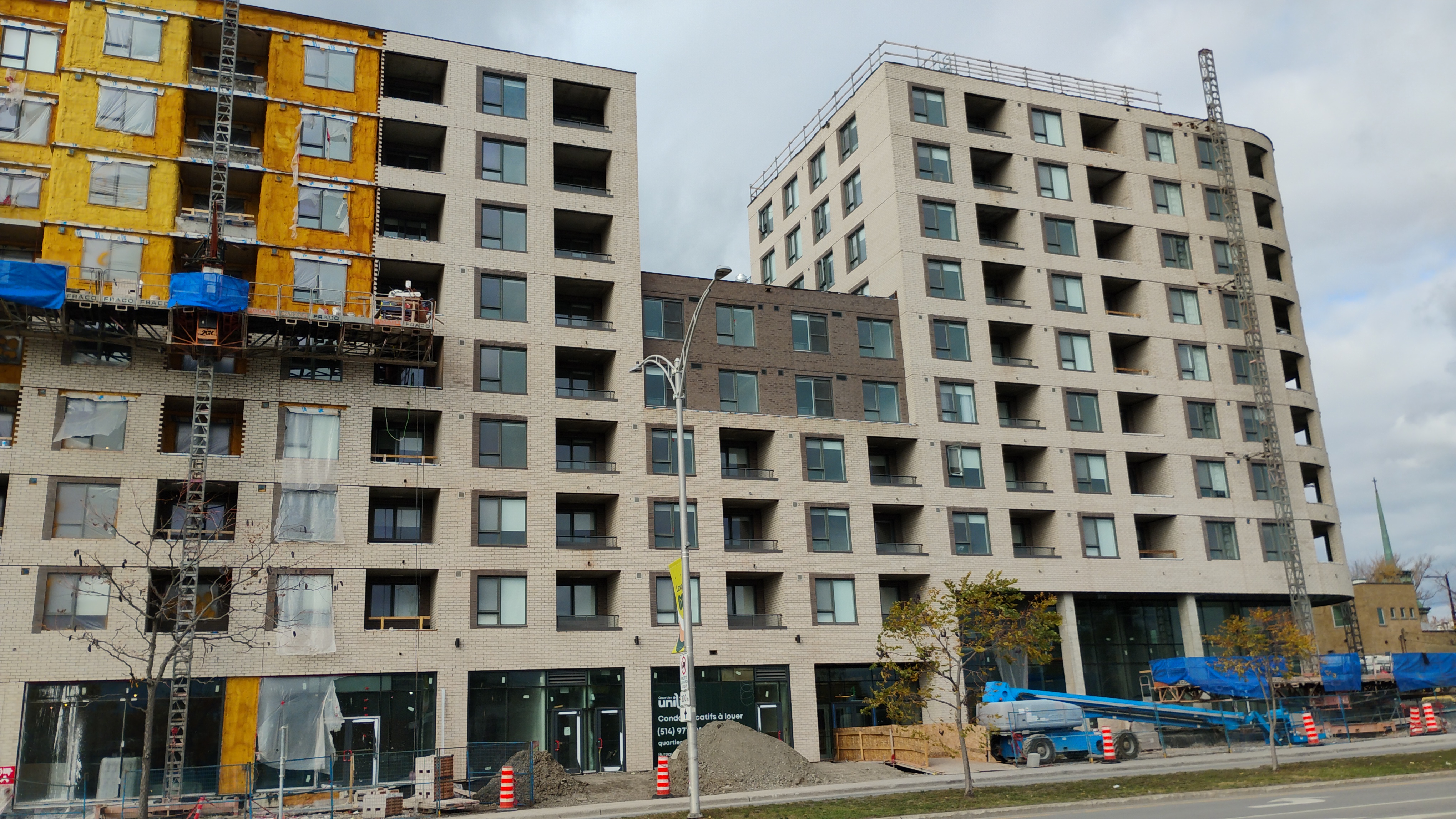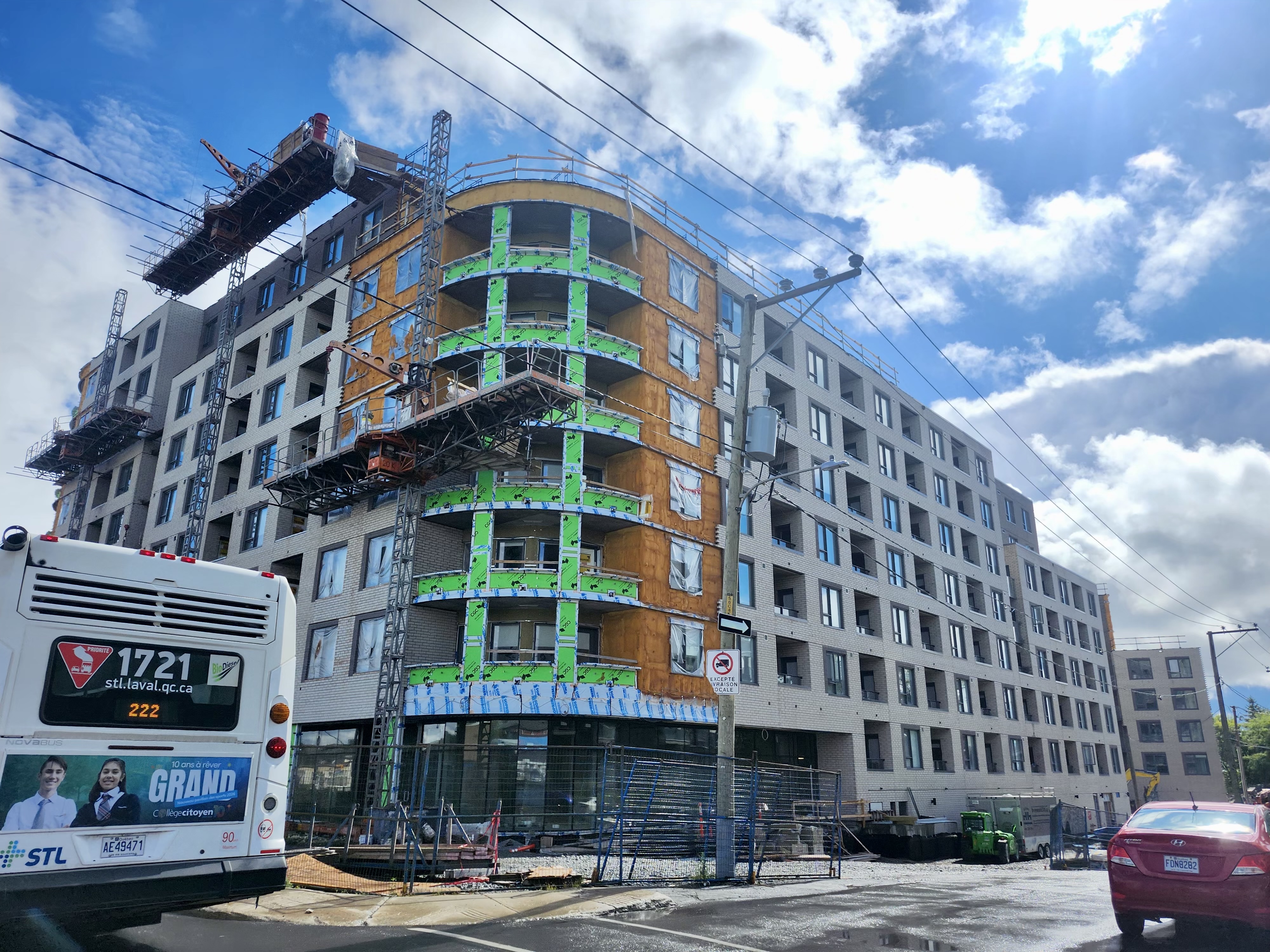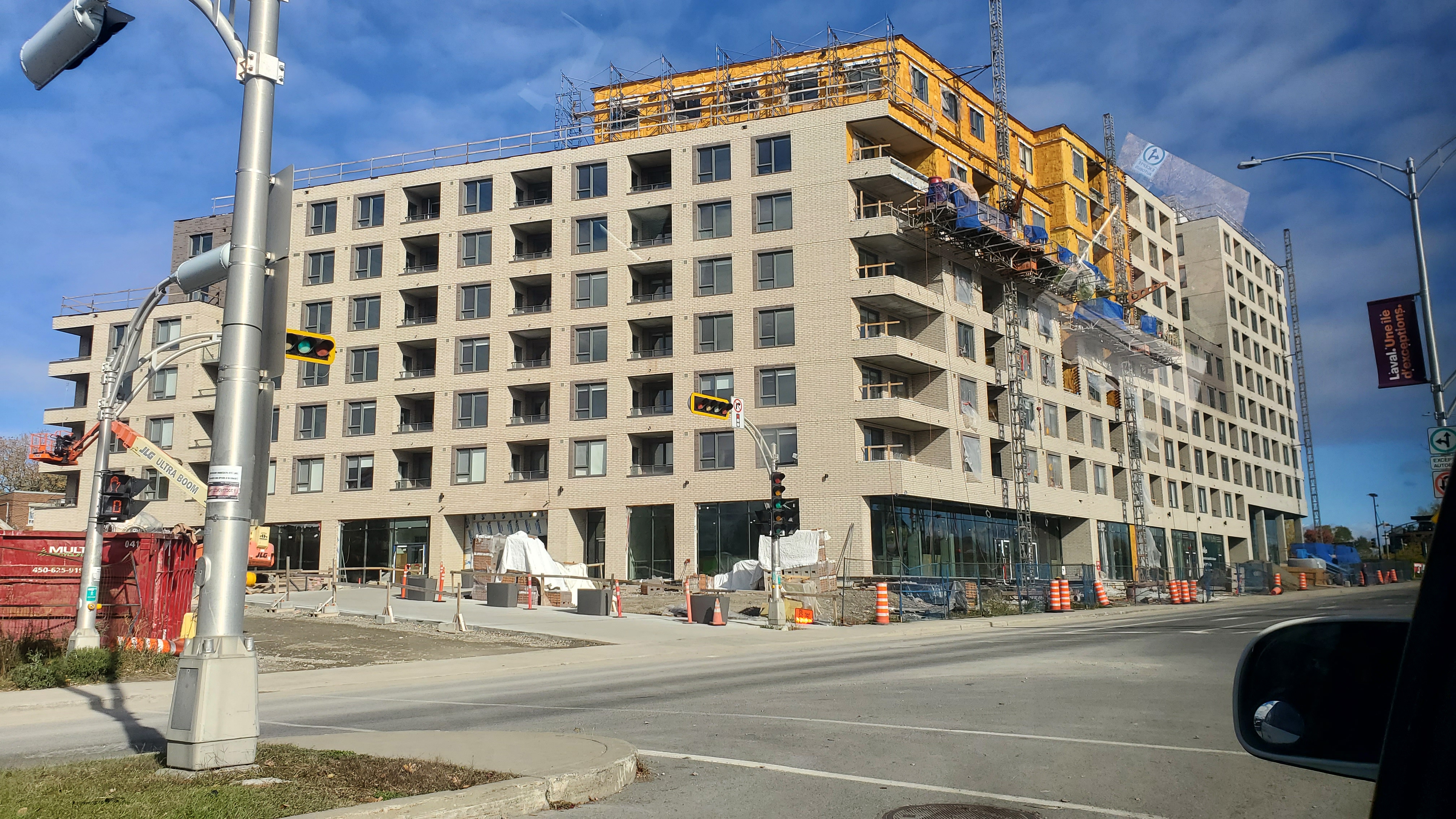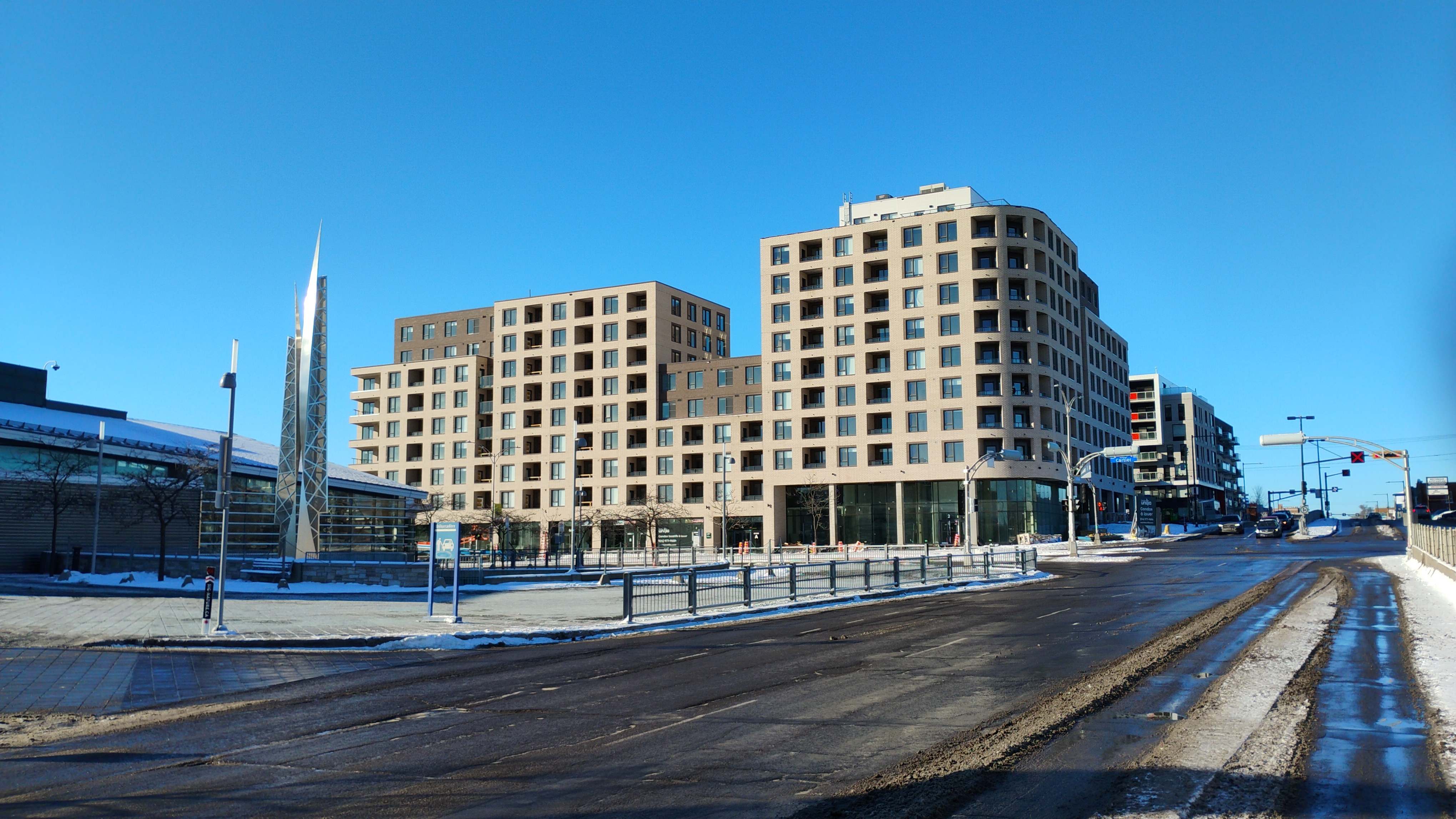 Franchement quand j’ai vu les premières images du projet, j’étais vraiment déçu du look, surtout de la brique. Maintenant que c’est bien avancé et après avoir passer et vue le bâtiment pratiquement quotidiennement, je commence à bien aimer! Selon moi, la couleur se fond bien au terminus derrière et au look du quartier.