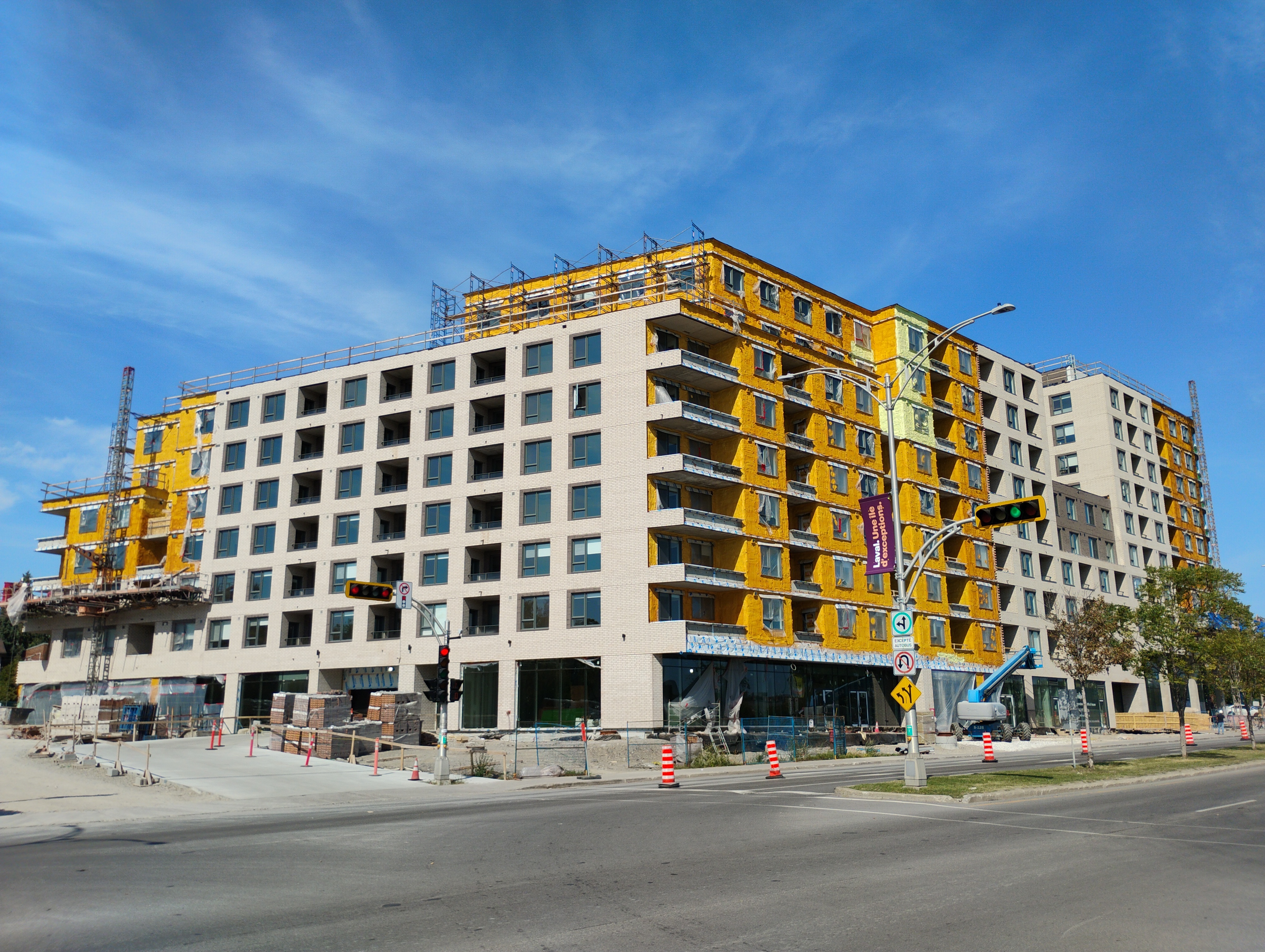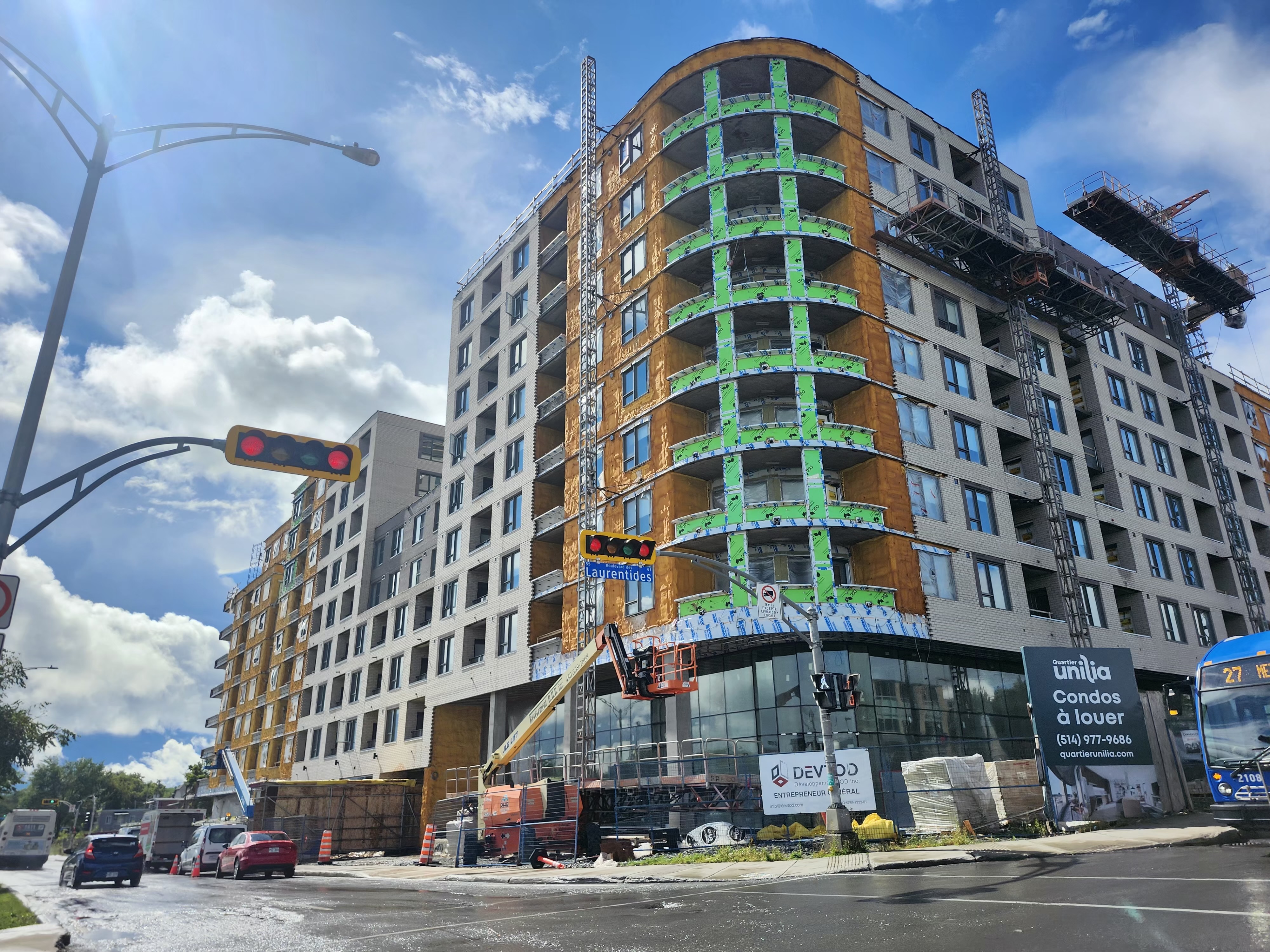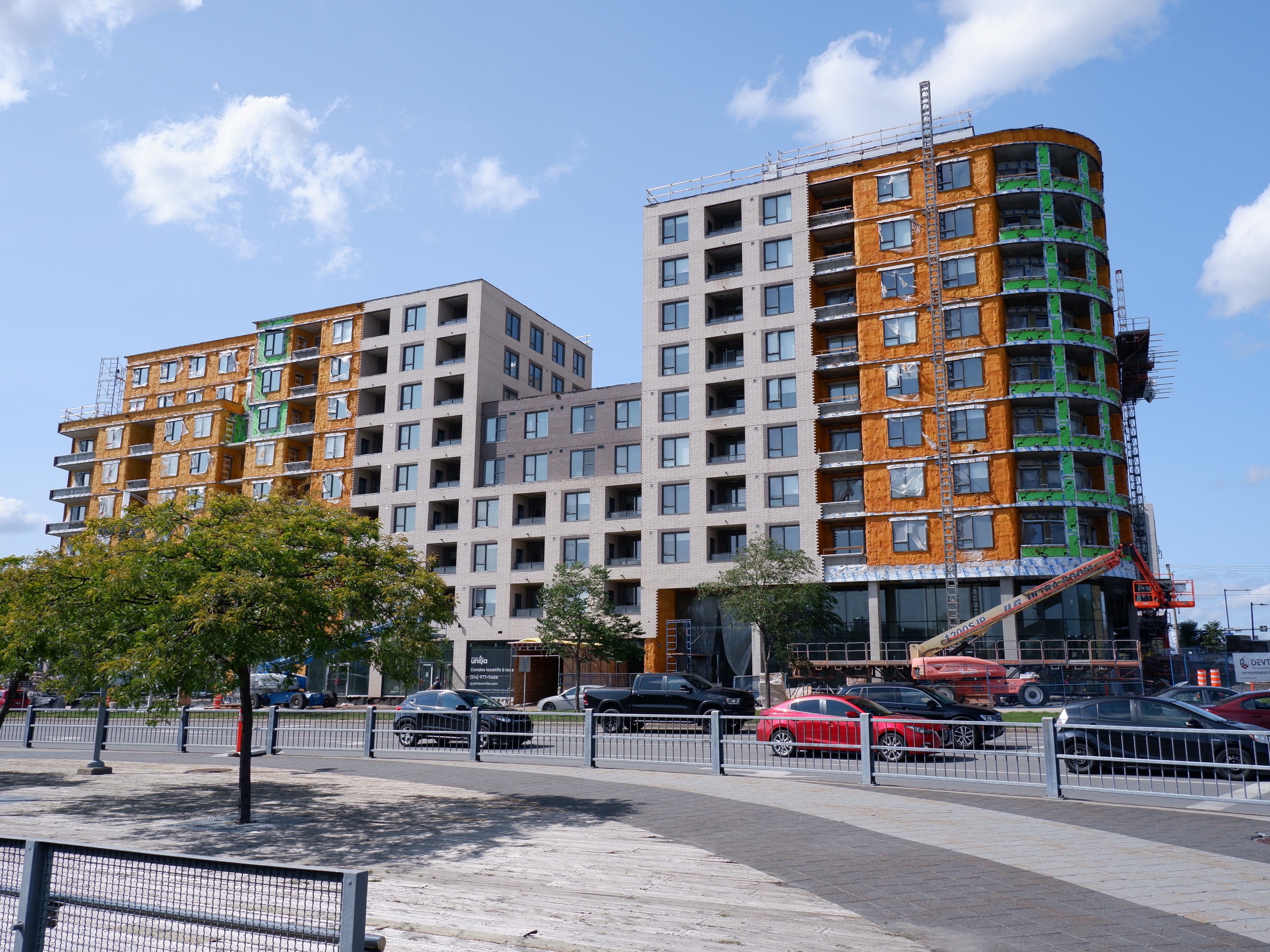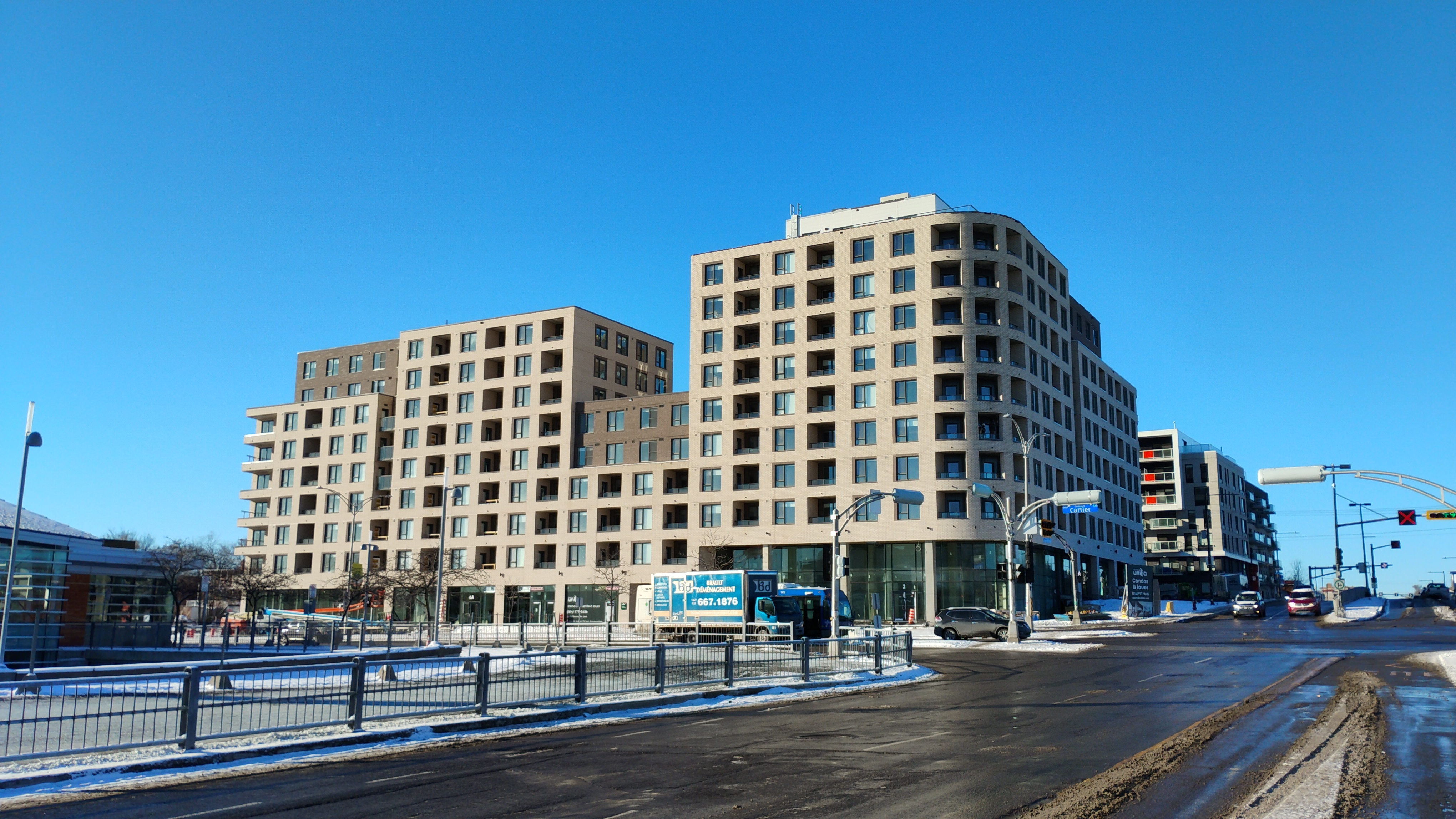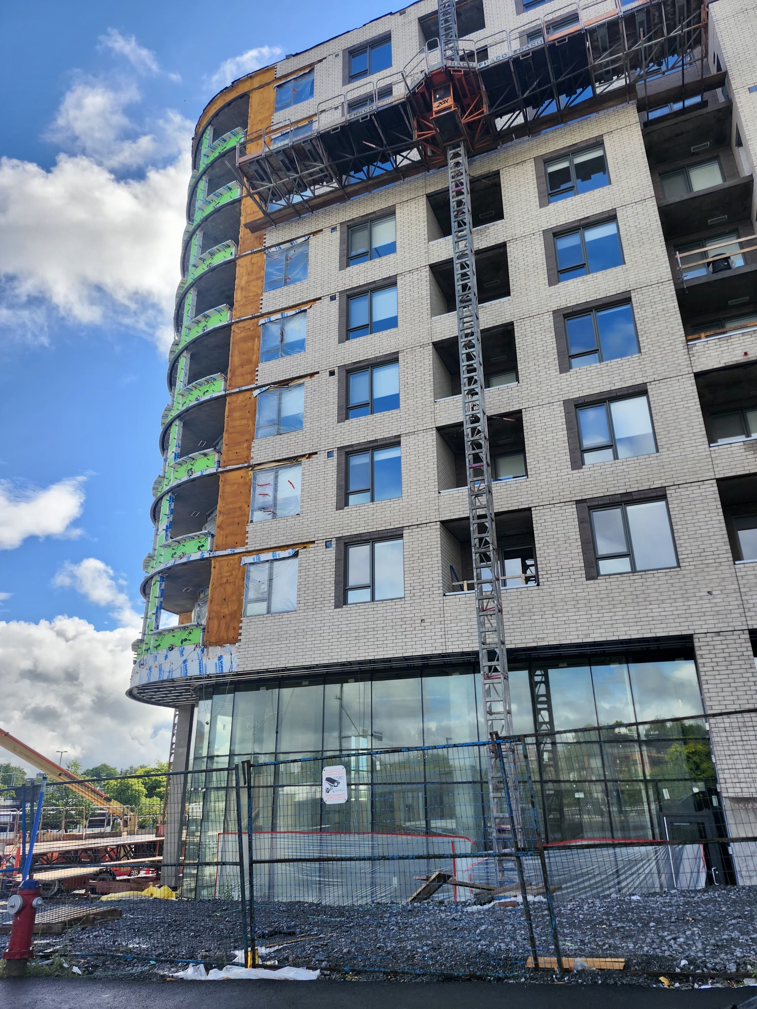 Franchement quand j’ai vu les premières images du projet, j’étais vraiment déçu du look, surtout de la brique. Maintenant que c’est bien avancé et après avoir passer et vue le bâtiment pratiquement quotidiennement, je commence à bien aimer! Selon moi, la couleur se fond bien au terminus derrière et au look du quartier.