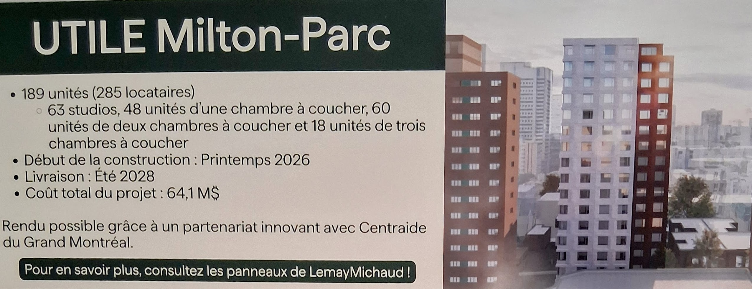 Ce projet vise la construction d’un immeuble à des fins d’habitation. L’Unité de travail pour l’implantation de logement étudiant (UTILE), propose ainsi la création de 205 unités de logement pour un total de 314 chambres. Les typologies proposées se déclinent ainsi :